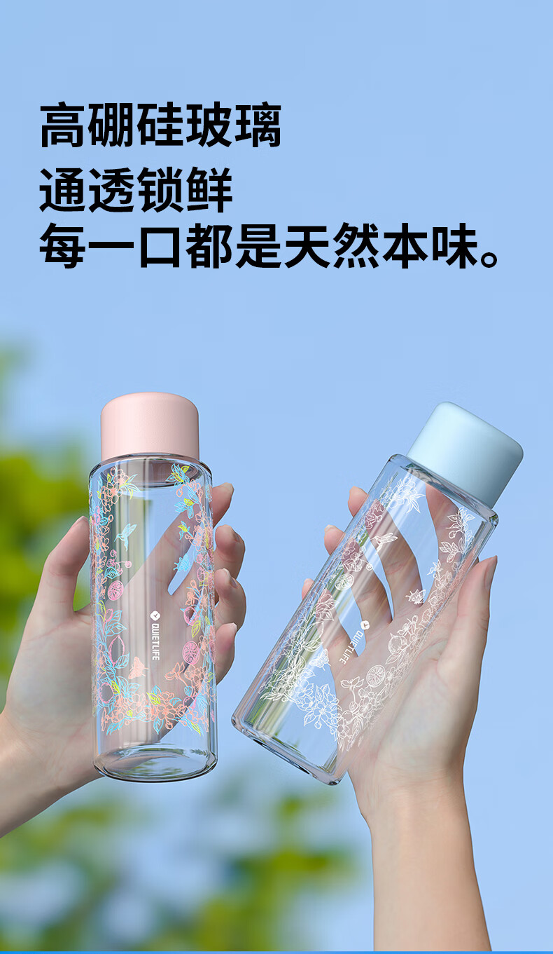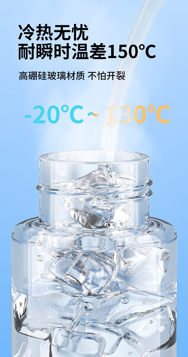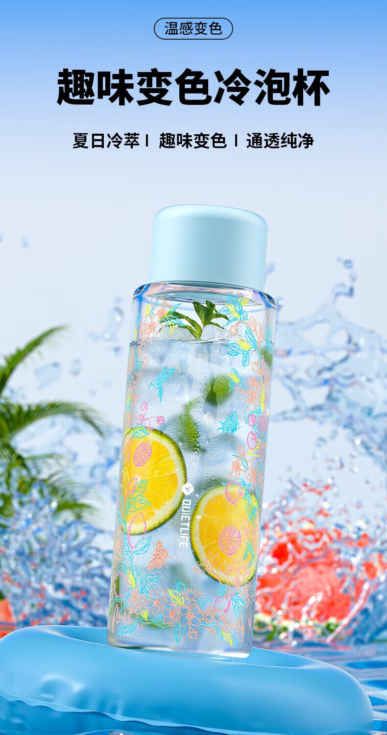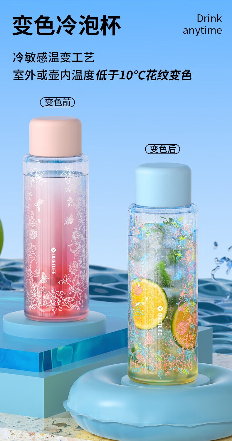 杯身花纹采用冷敏感温变工艺;室外或壶内温度低于10℃花纹变色;高硼硅玻璃,通透锁鲜