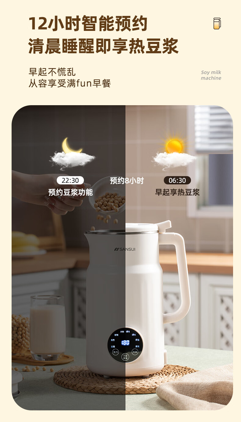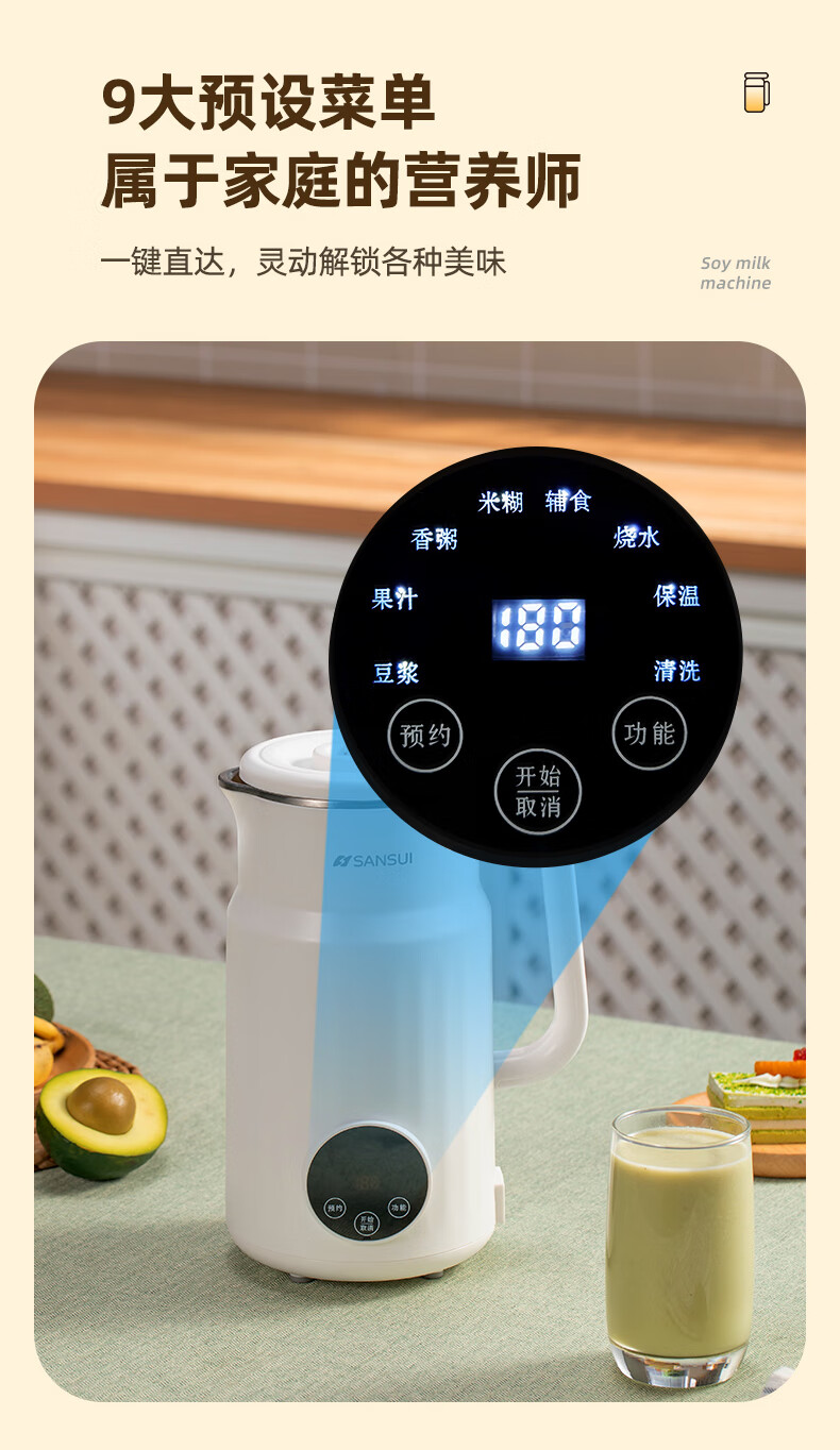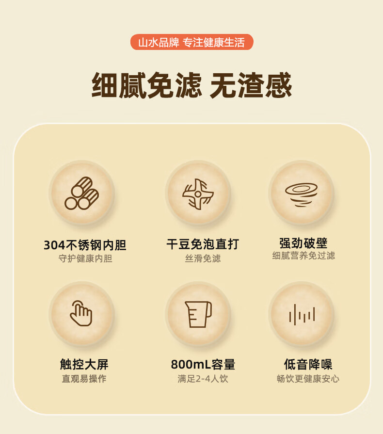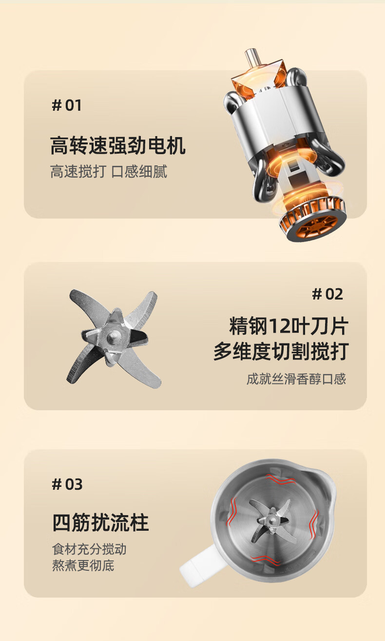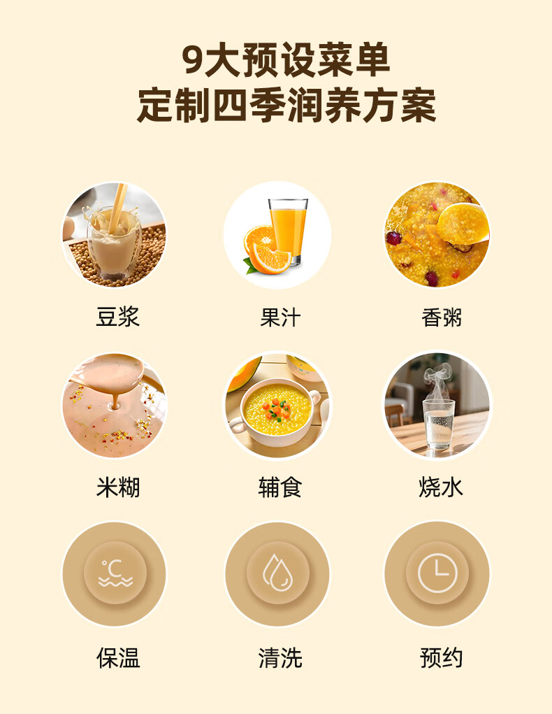 304不锈钢内胆、干豆免泡直打、高温熬煮;细腻免滤无渣感、强劲破壁、触控大屏;800mL容量、低音降噪、高速强劲电机、;精钢12叶刀片多维度切割搅打、四筋扰流柱;、9大预设菜单、12小时智能预约、一键高温清洗