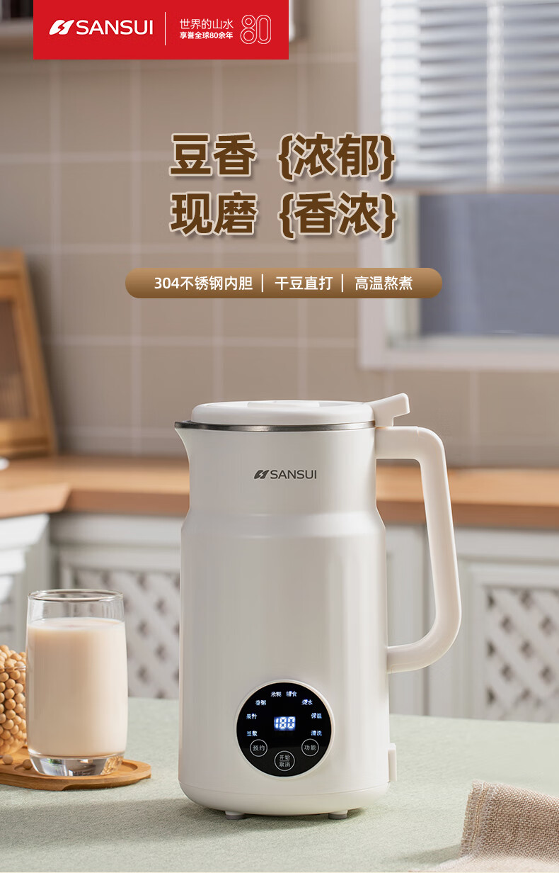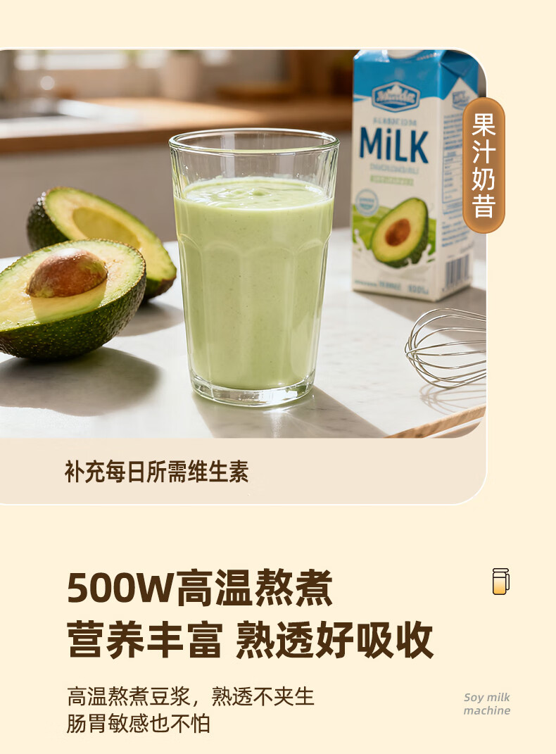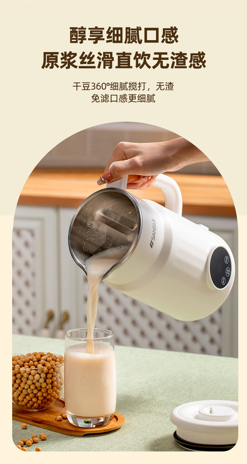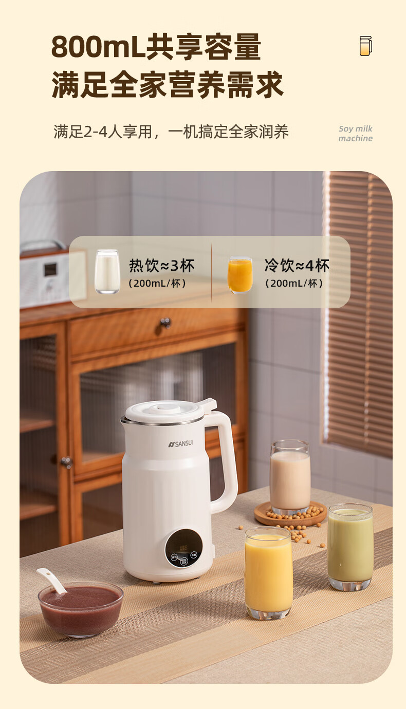 304不锈钢内胆、干豆免泡直打、高温熬煮;细腻免滤无渣感、强劲破壁、触控大屏;800mL容量、低音降噪、高速强劲电机、;精钢12叶刀片多维度切割搅打、四筋扰流柱;、9大预设菜单、12小时智能预约、一键高温清洗