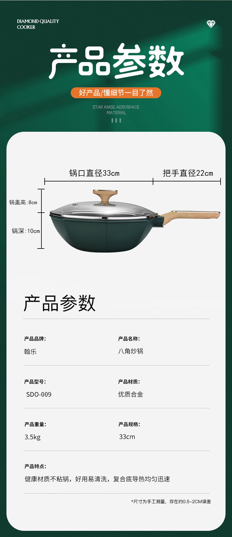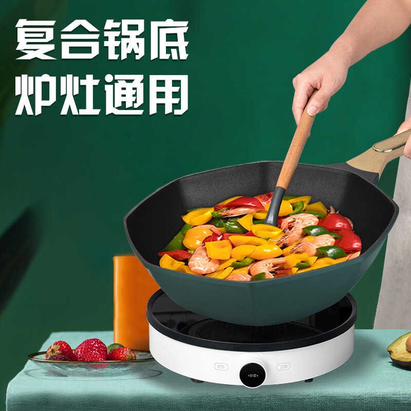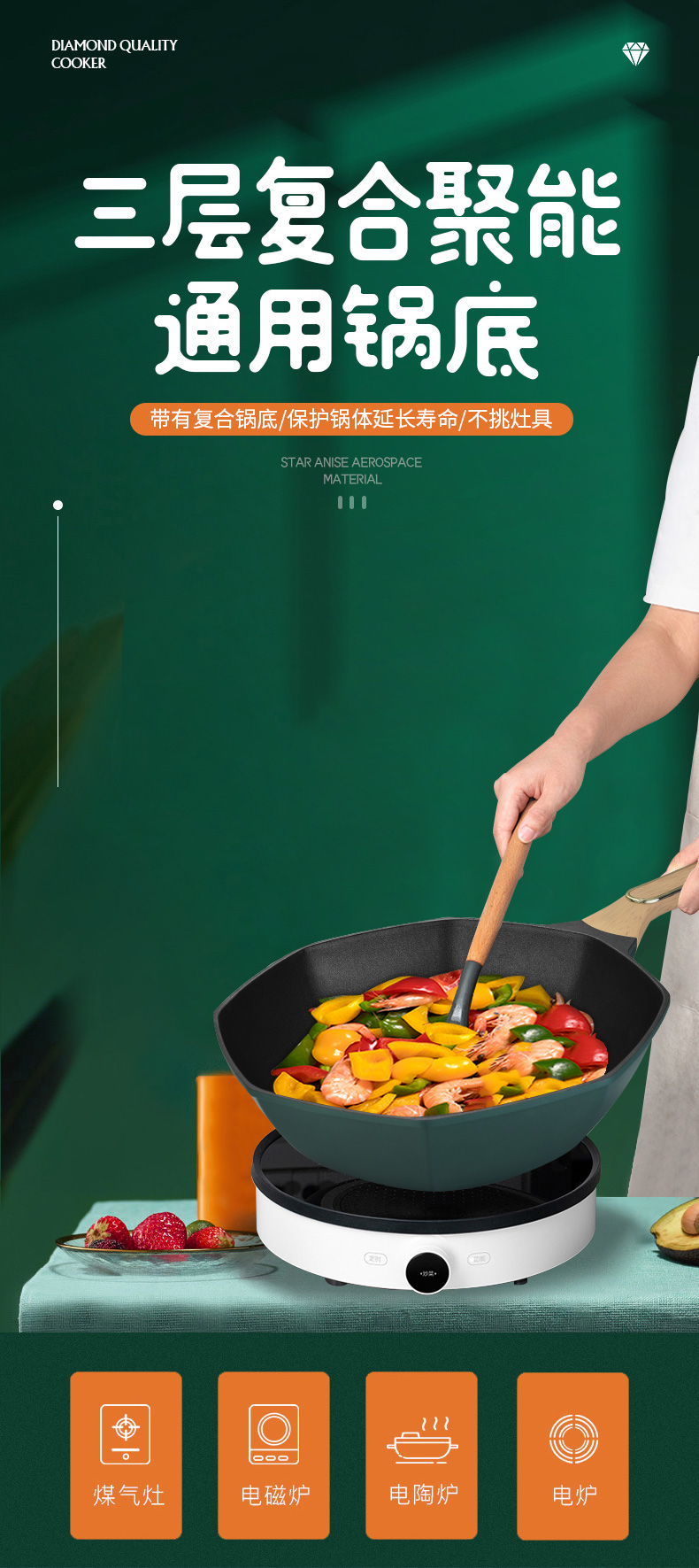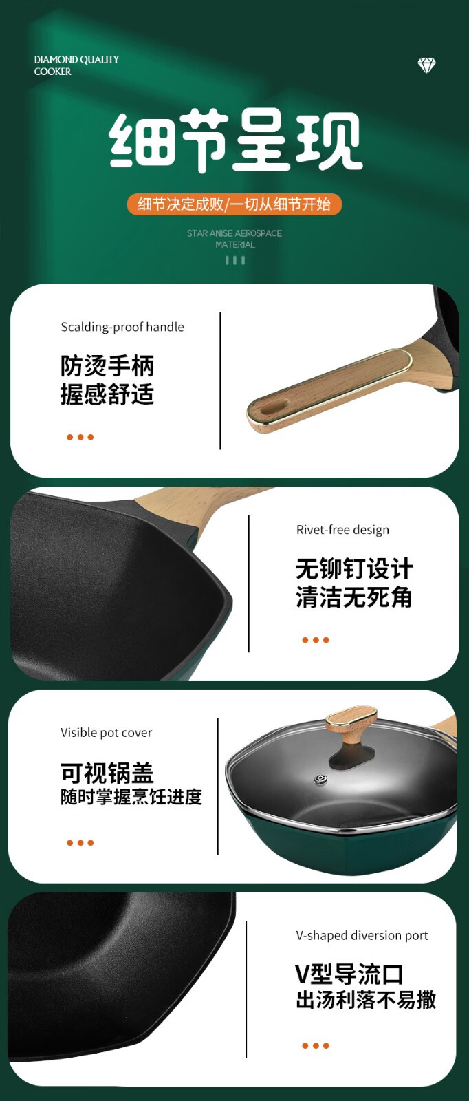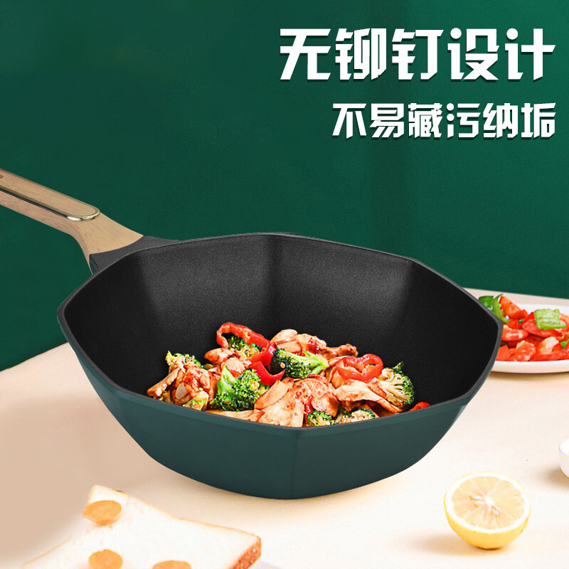 合金材质 一体压铸;八面不粘 清洗方便;电磁炉燃气通用