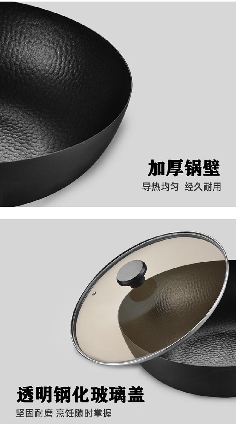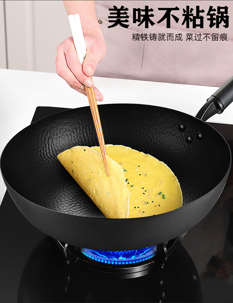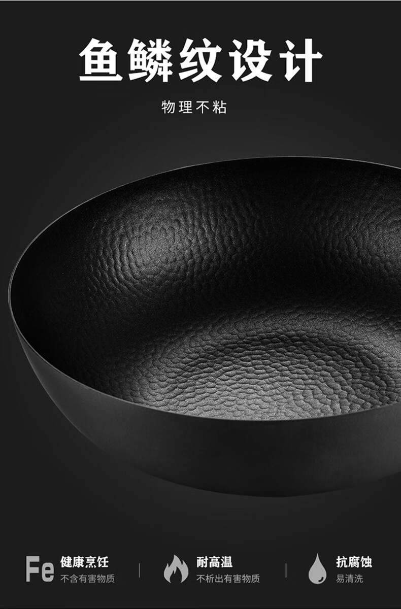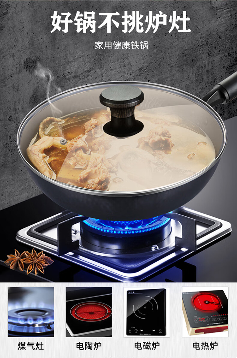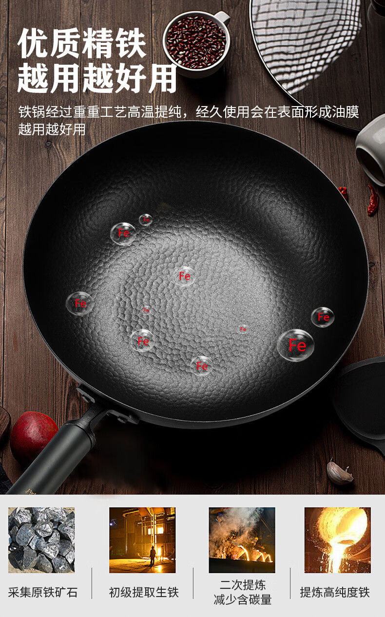 厚釜精铁不粘炒锅;独创硬氧精铁不粘技术;老铁锅耐磨耐用加复可用电磁炉明火