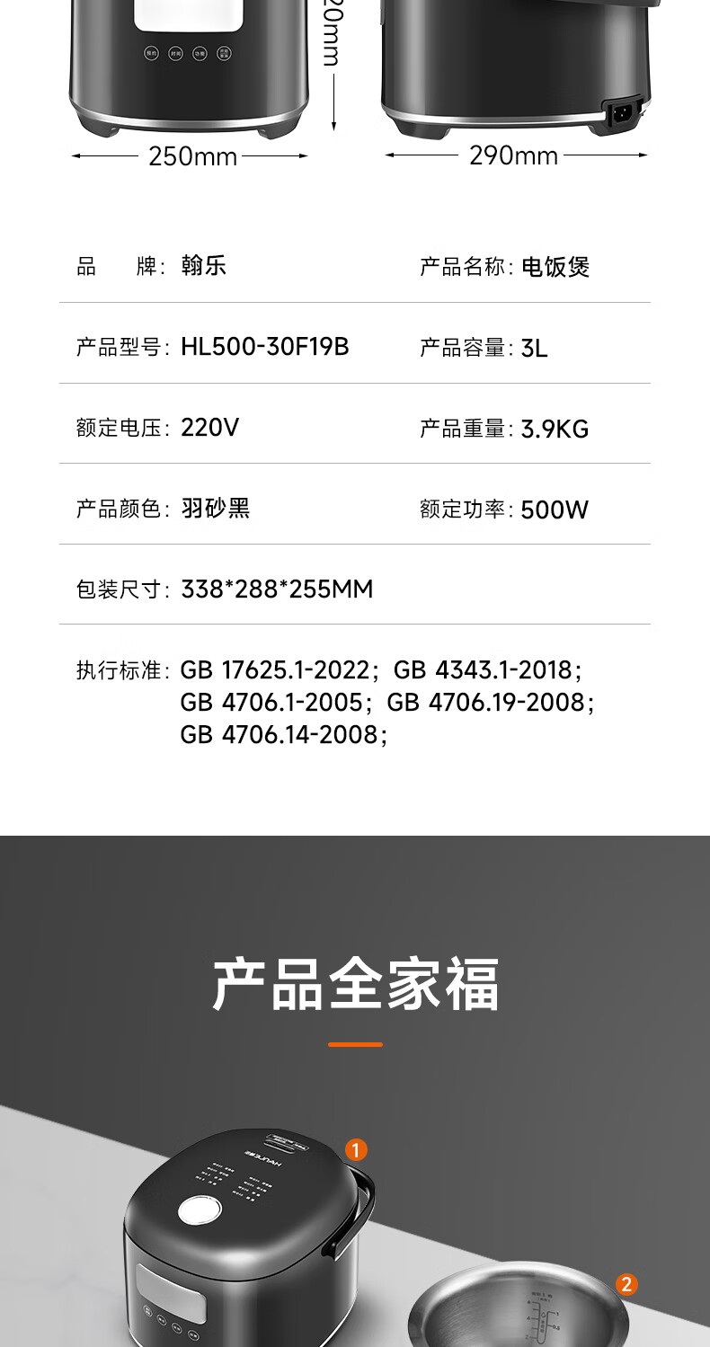 翰乐 家用电饭煲羽砂黑3LHL500-30F19B
