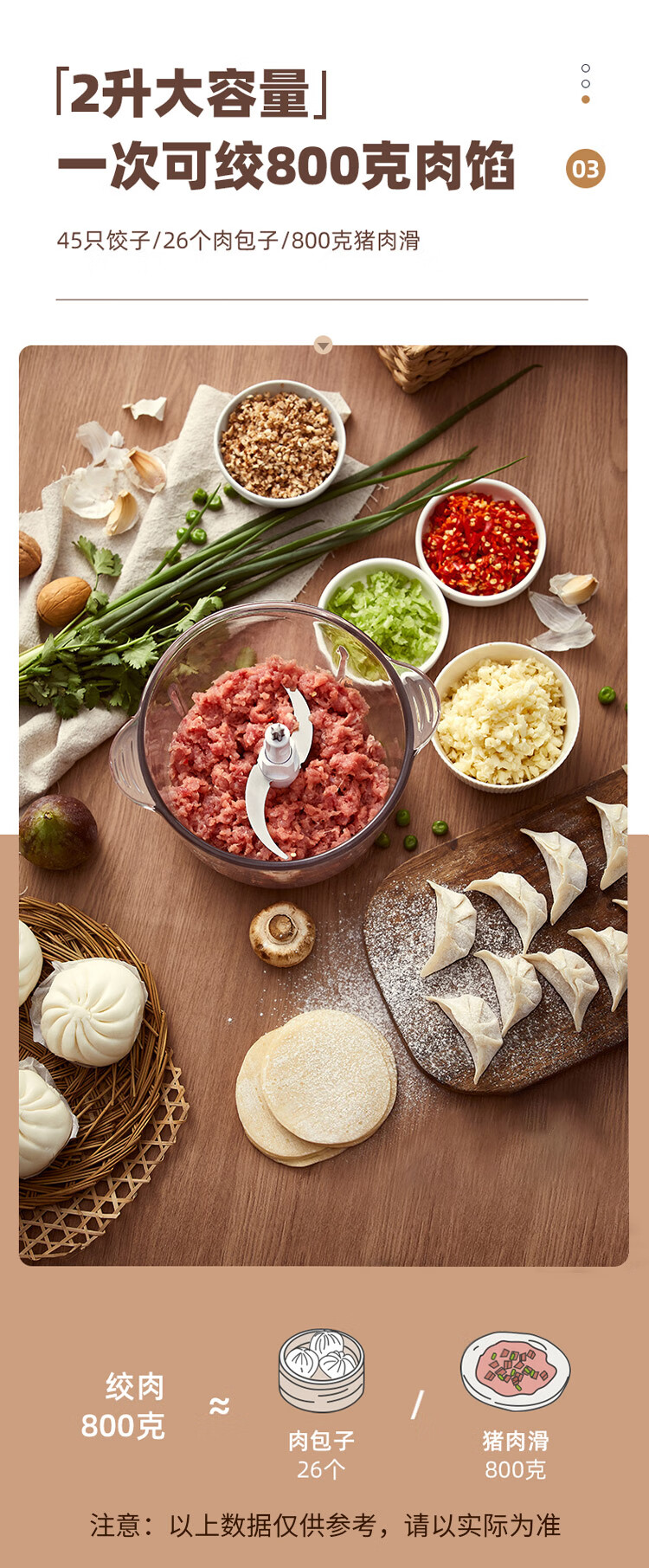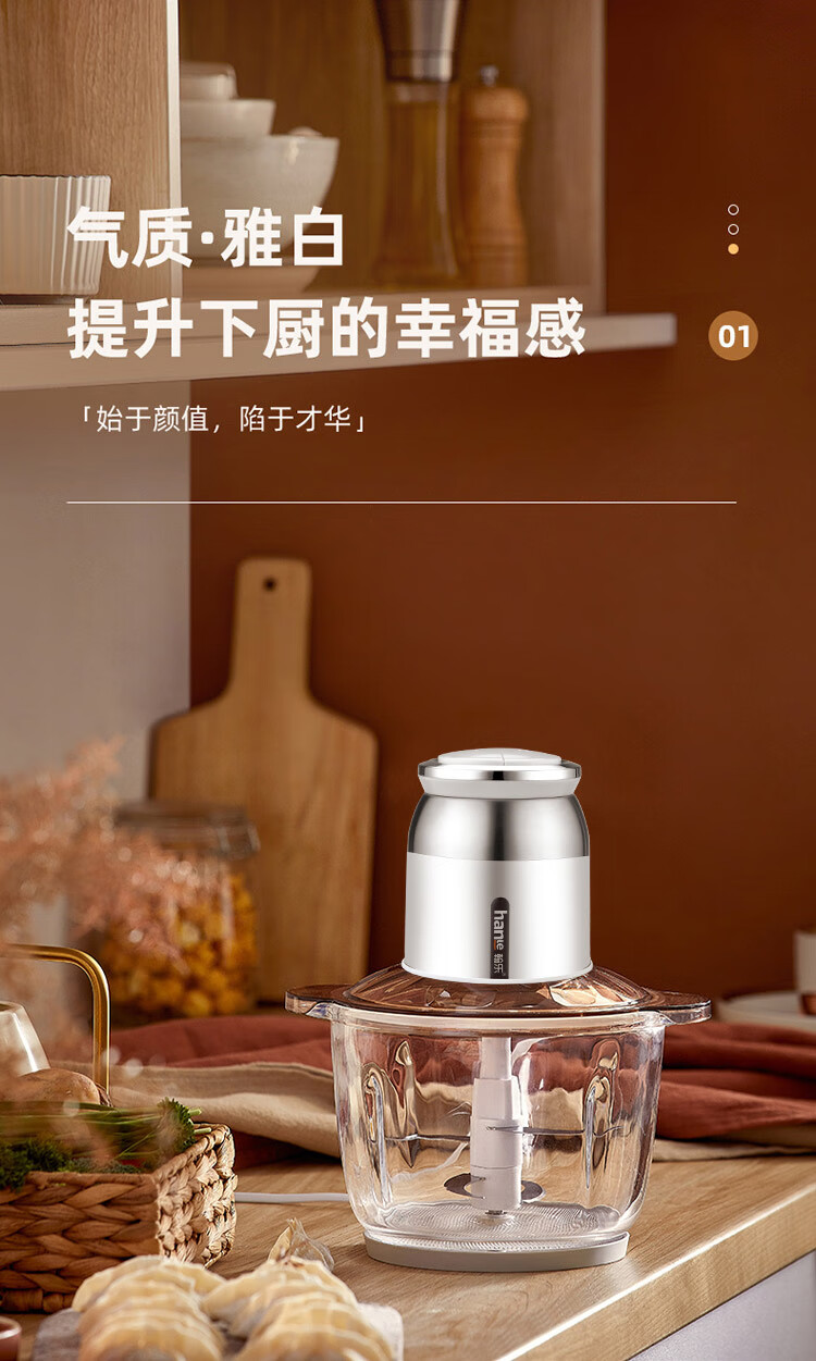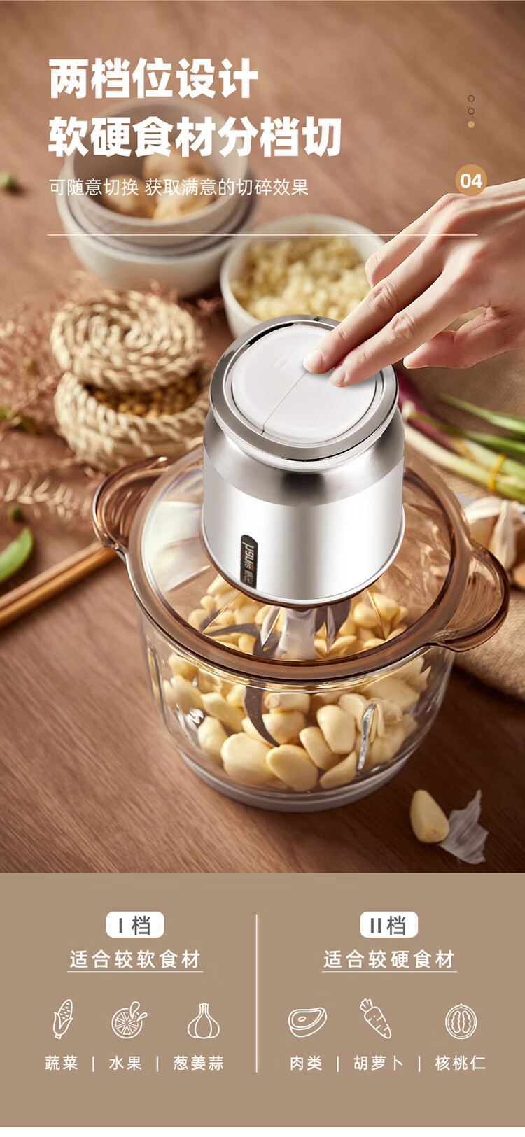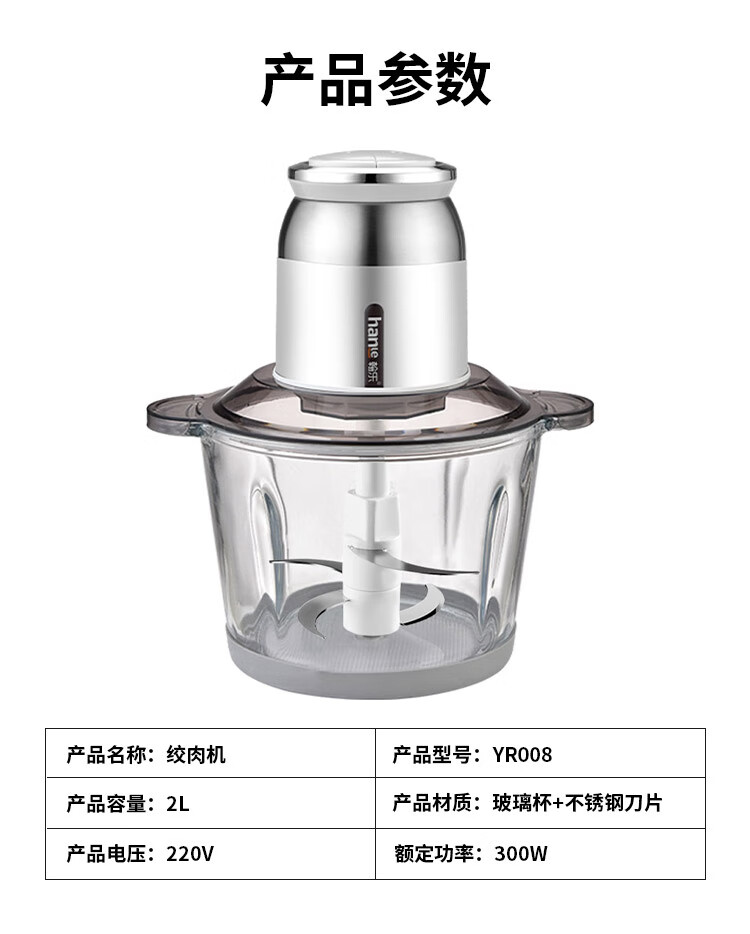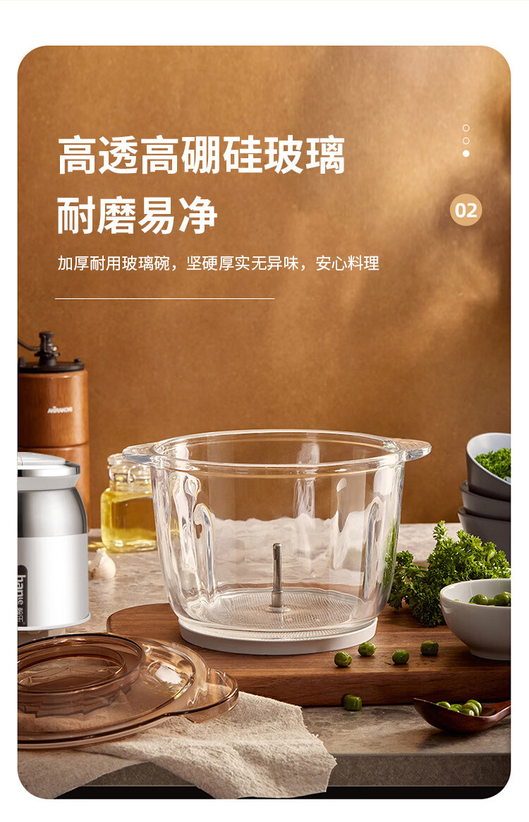 大容量双档调速,肉馅的细腻度自由掌握;不锈钢机头双加强保护,防摔、防磕;高硼硅玻璃碗,耐热耐冷