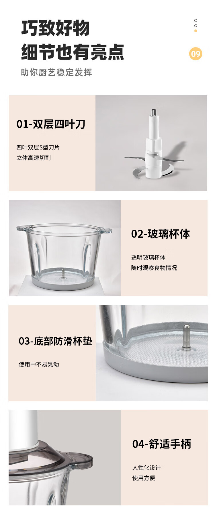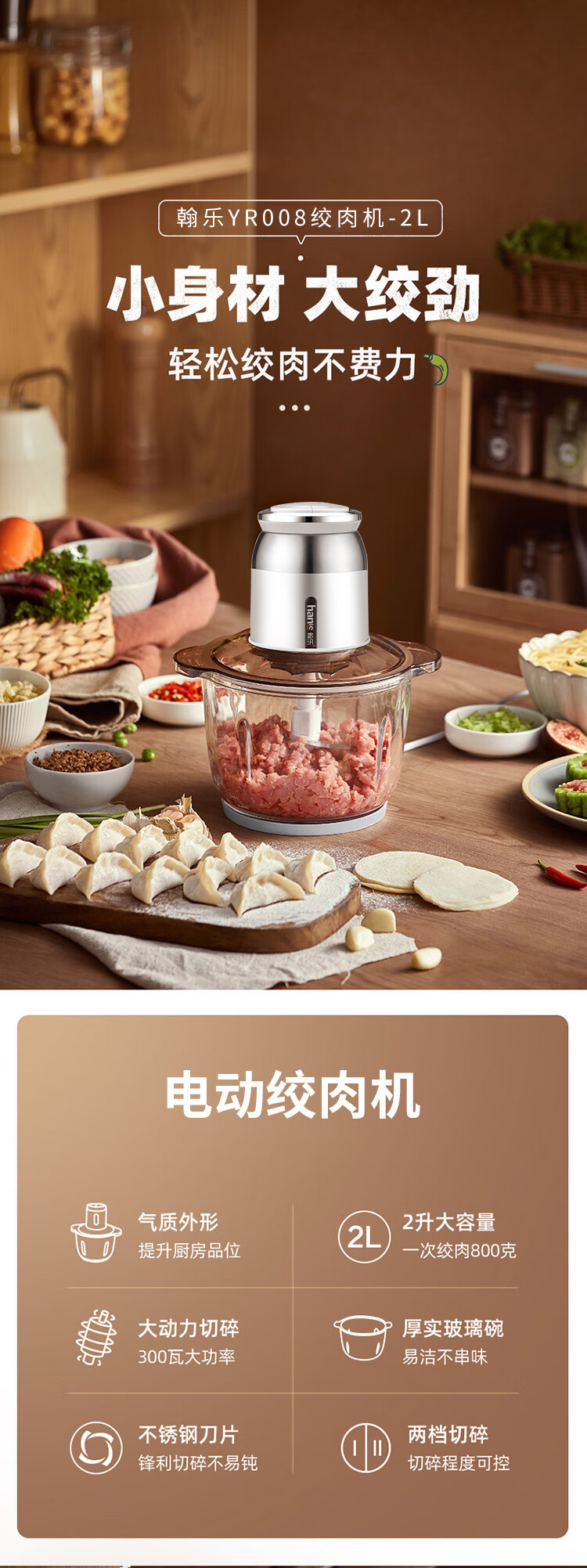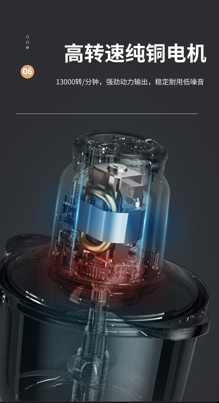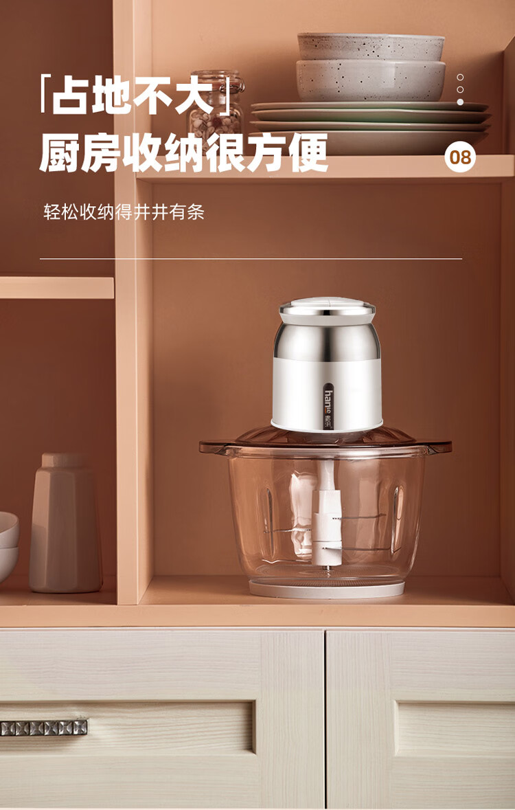 大容量双档调速,肉馅的细腻度自由掌握;不锈钢机头双加强保护,防摔、防磕;高硼硅玻璃碗,耐热耐冷