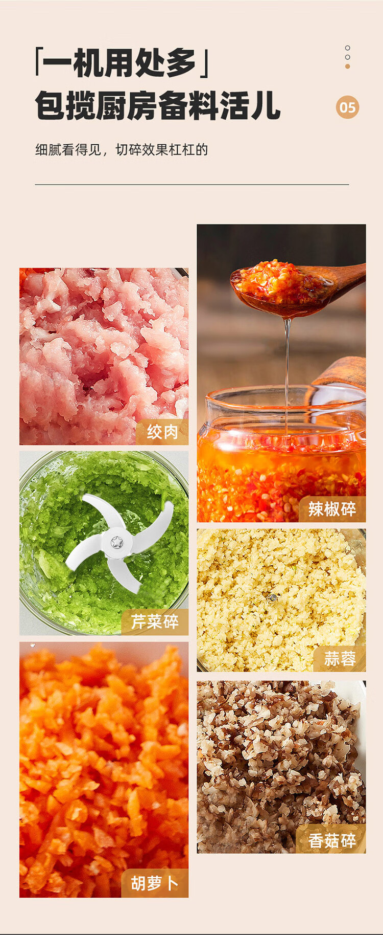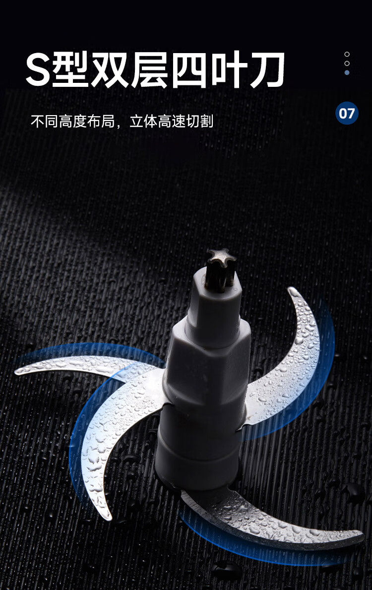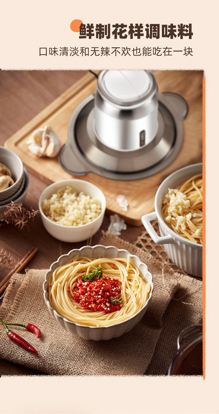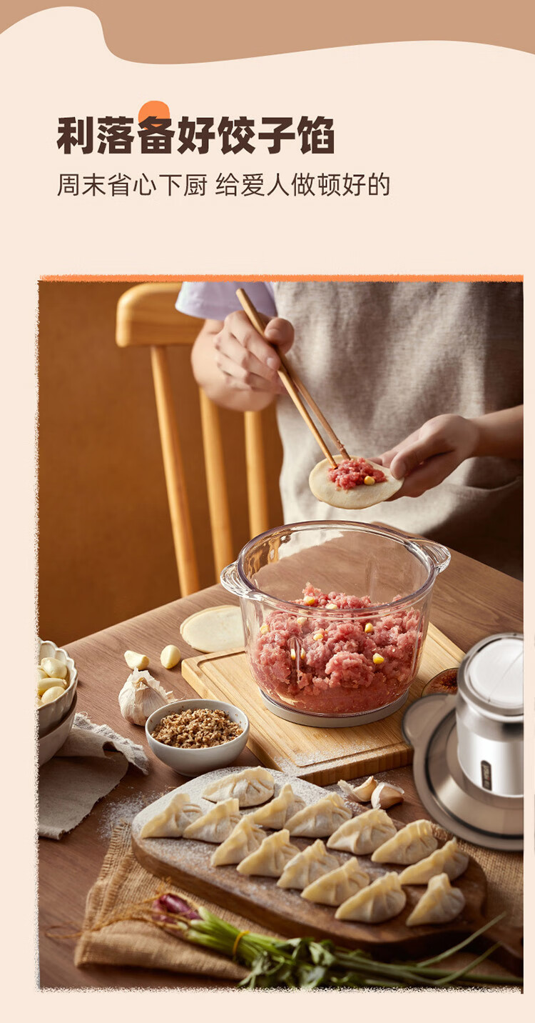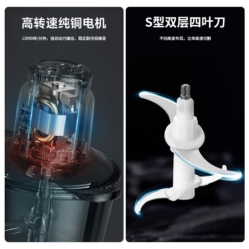 大容量双档调速,肉馅的细腻度自由掌握;不锈钢机头双加强保护,防摔、防磕;高硼硅玻璃碗,耐热耐冷