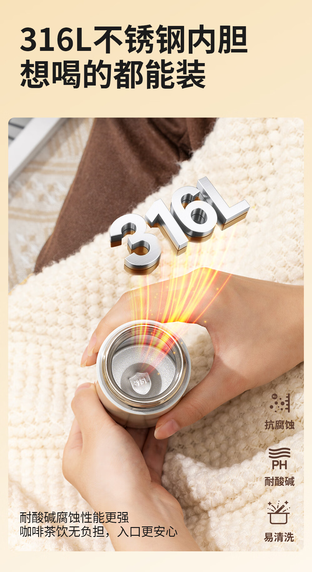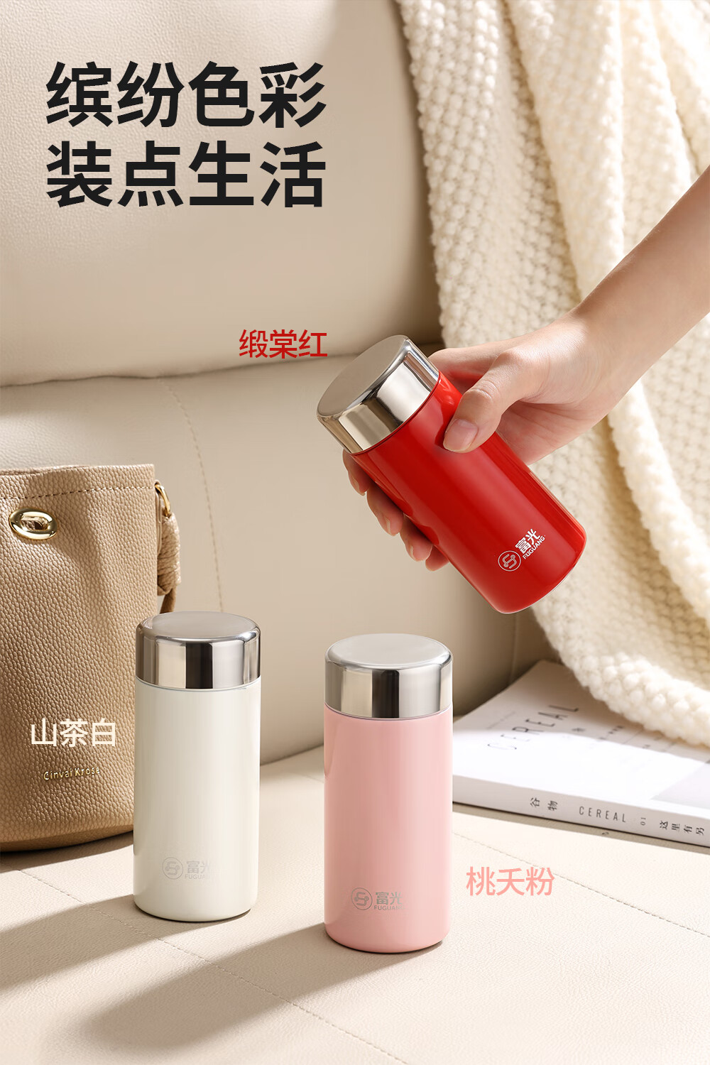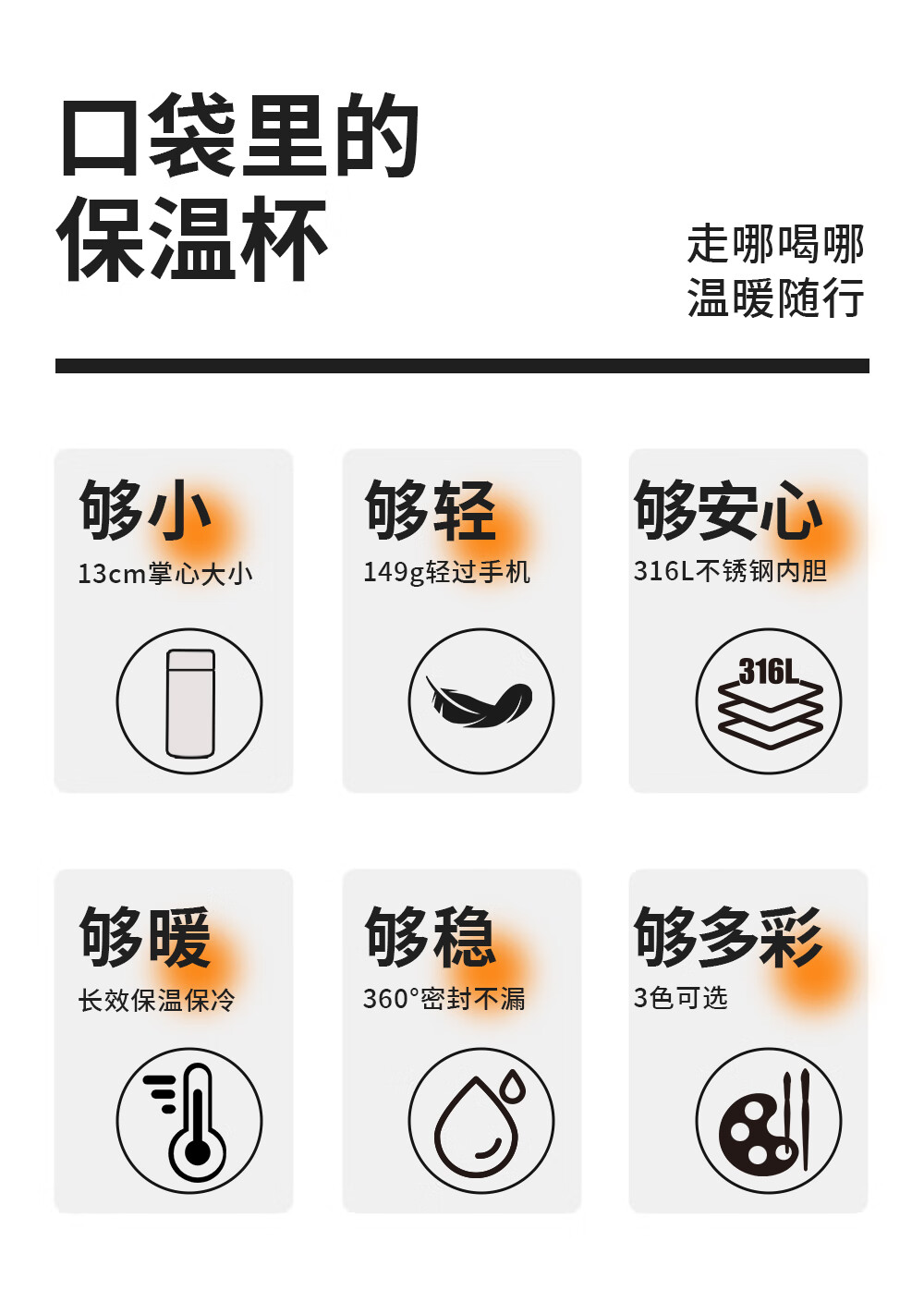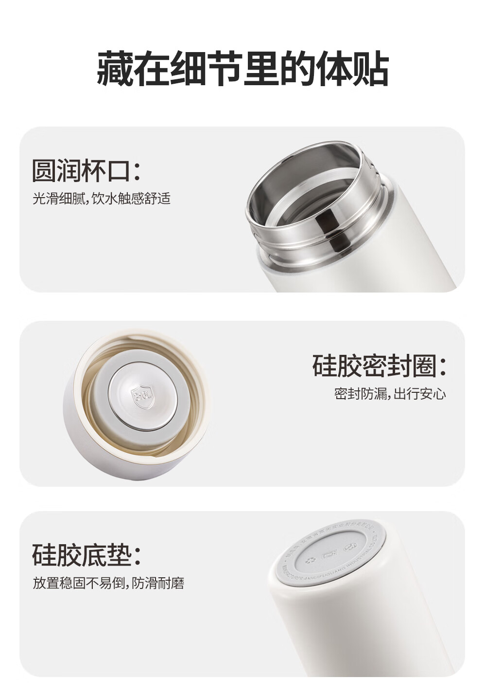 · 精致便携,满杯温暖轻负担;· 出彩配色,重构色彩生活美学;· 硅胶底垫,防滑静音