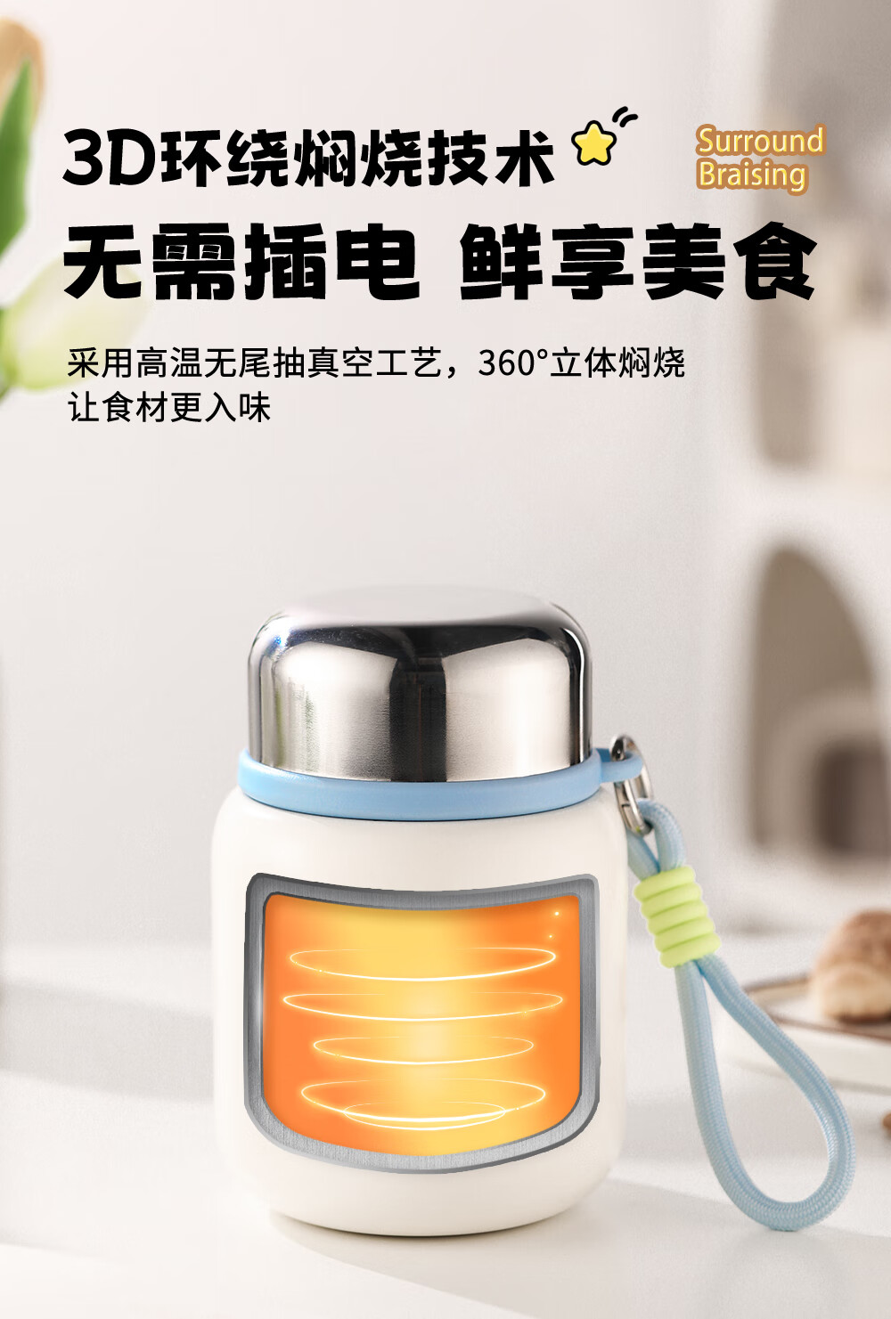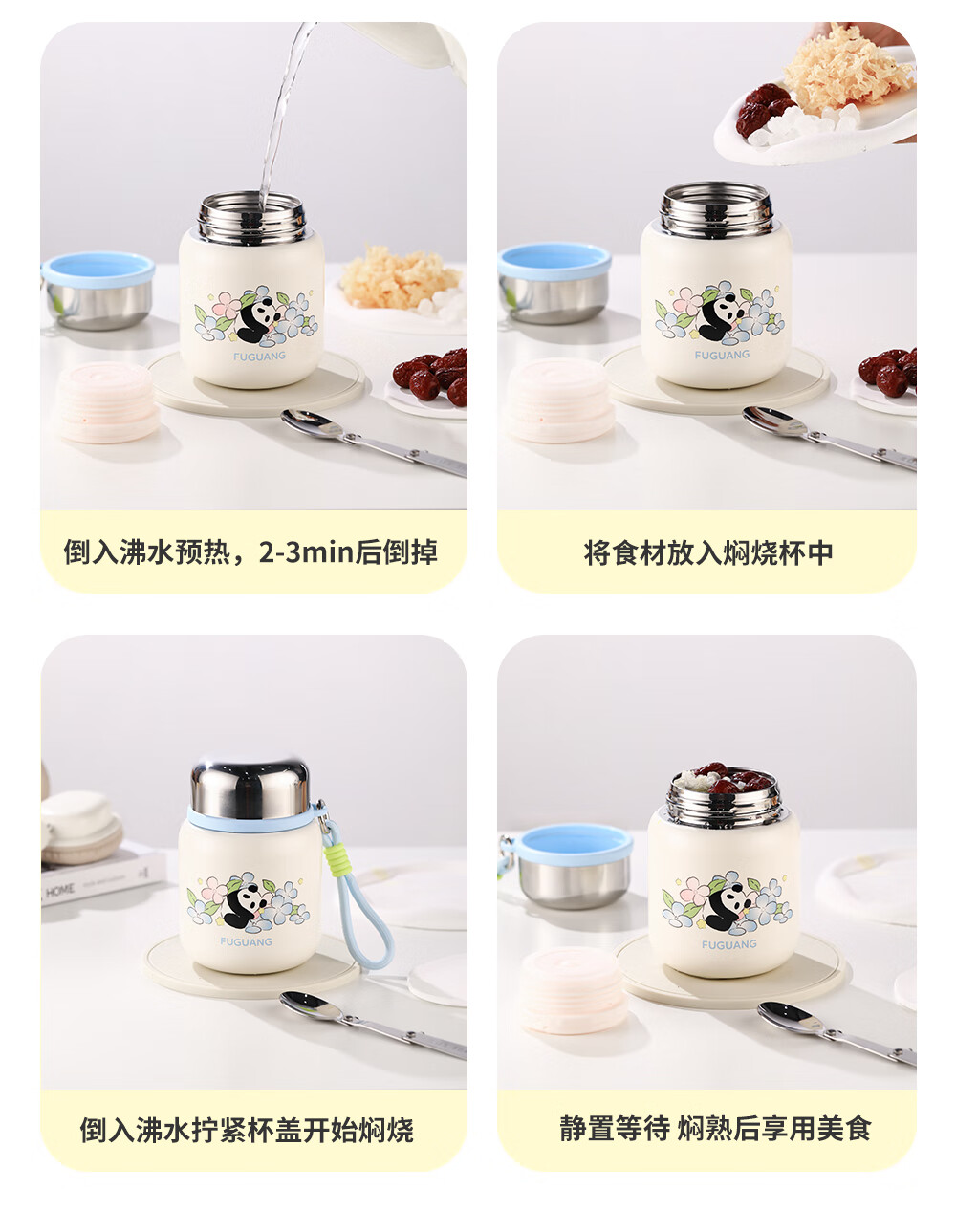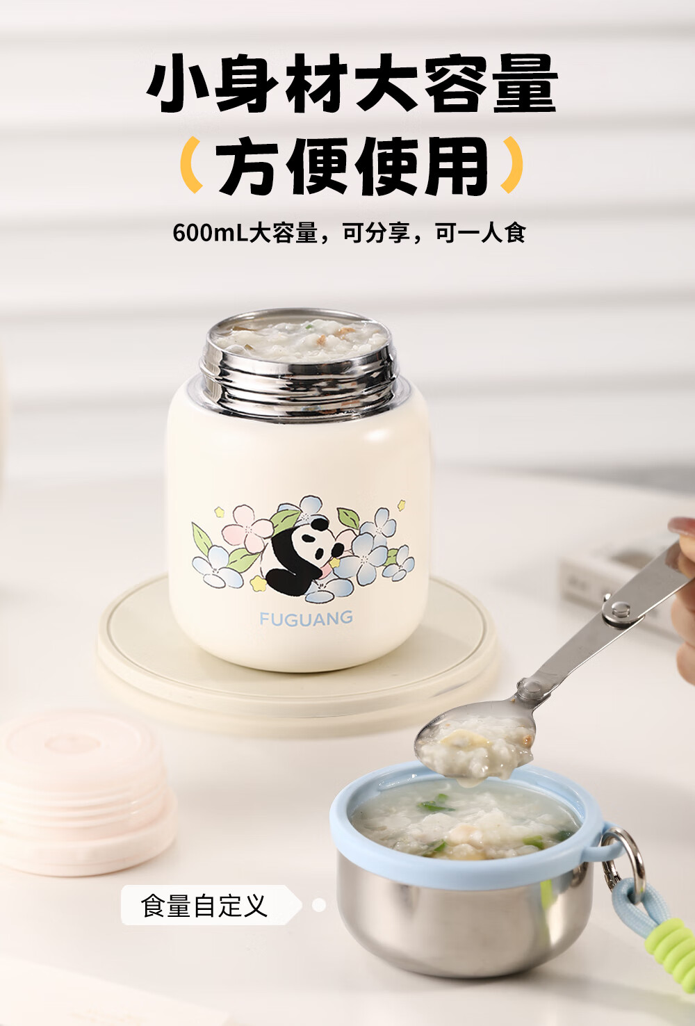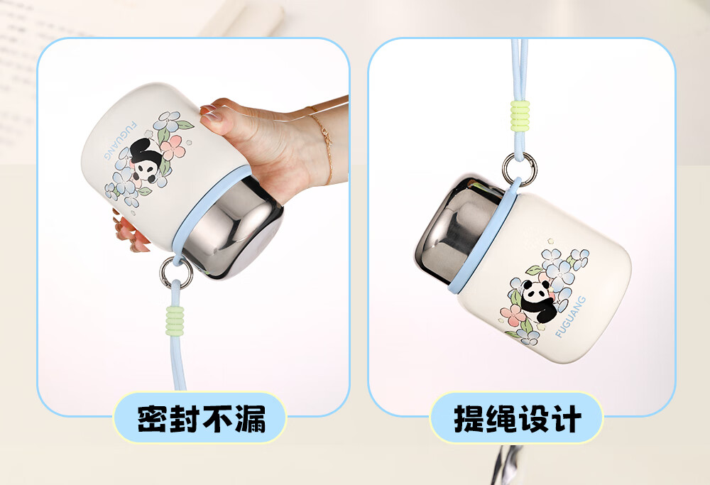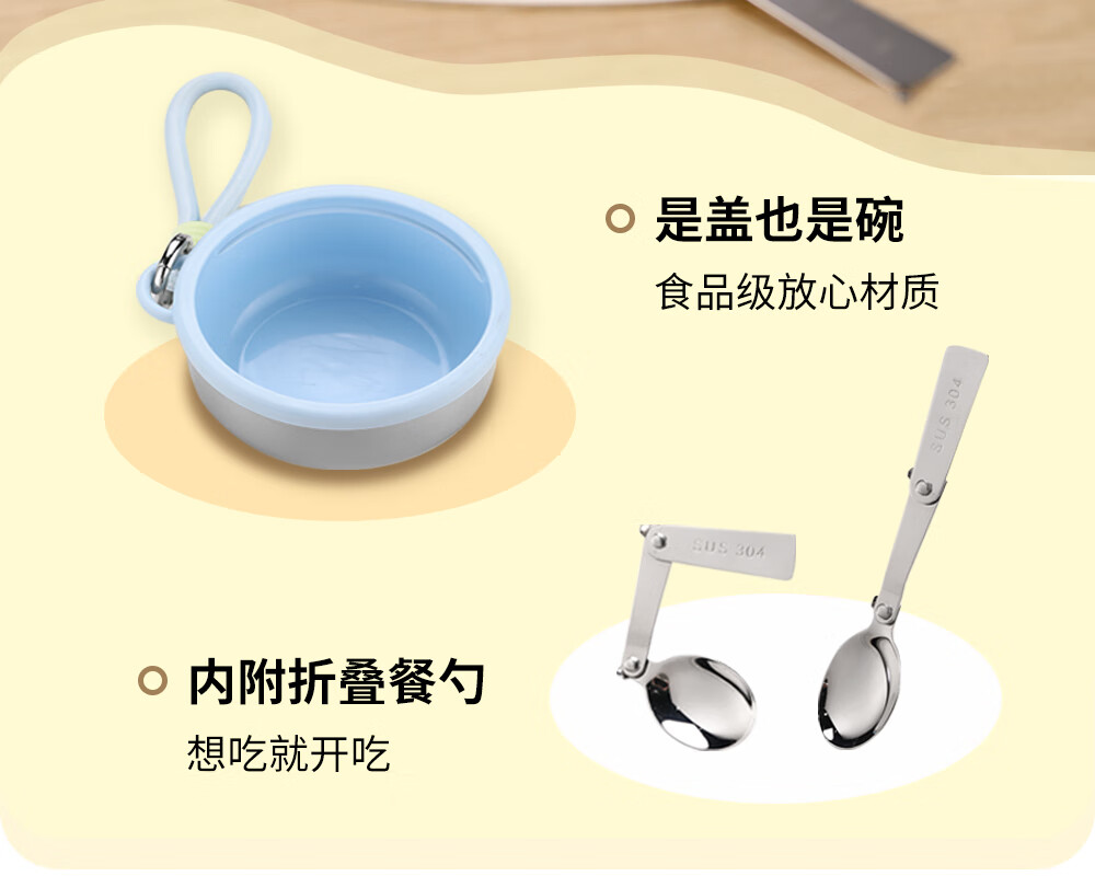 · 不锈钢小碗盖自带不锈钢折叠勺;· 便携提绳 随拎随走;· 316L材质,保温保冷,材质更安全