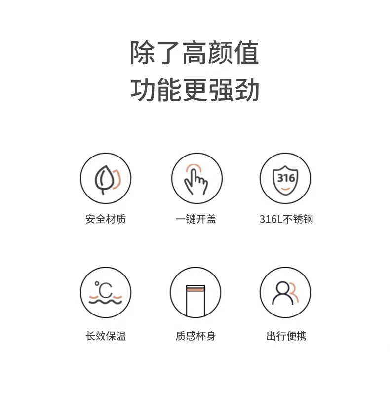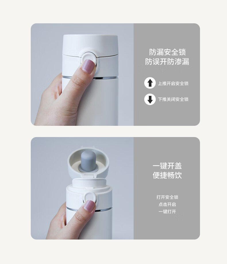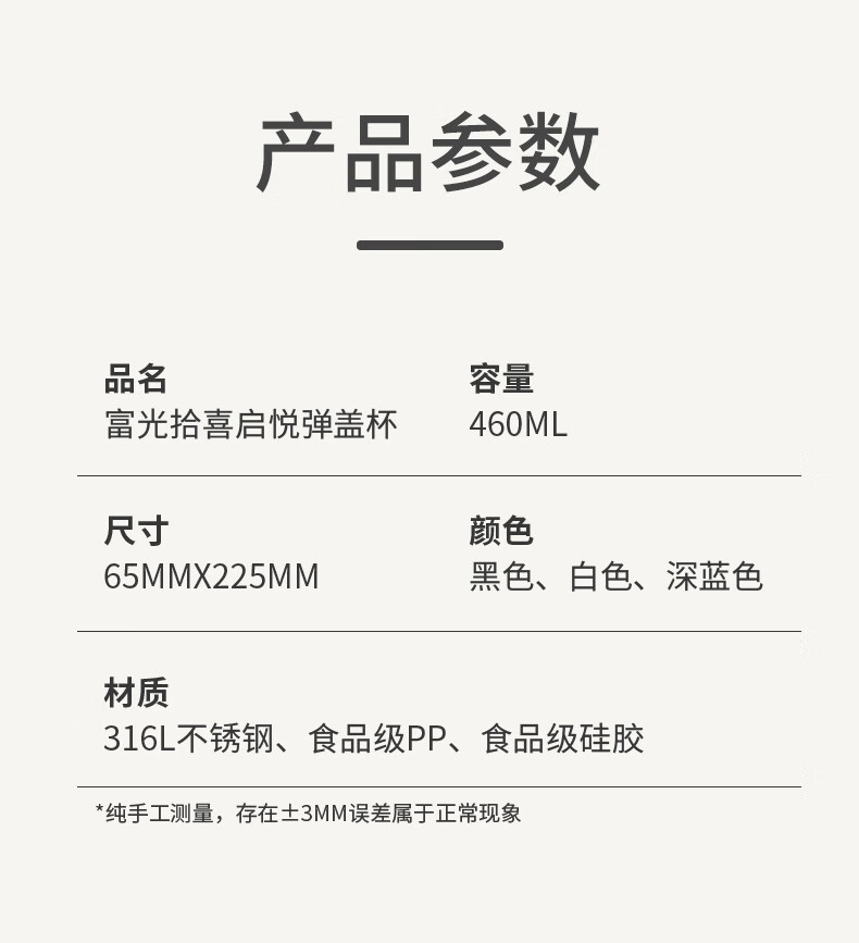 · 采用食品级PP、食品级硅胶,健康卫生,安全饮用;· 杯身圆润,弧度精准;光滑杯口,饮水更舒适。;· 一键弹盖,出水流畅。