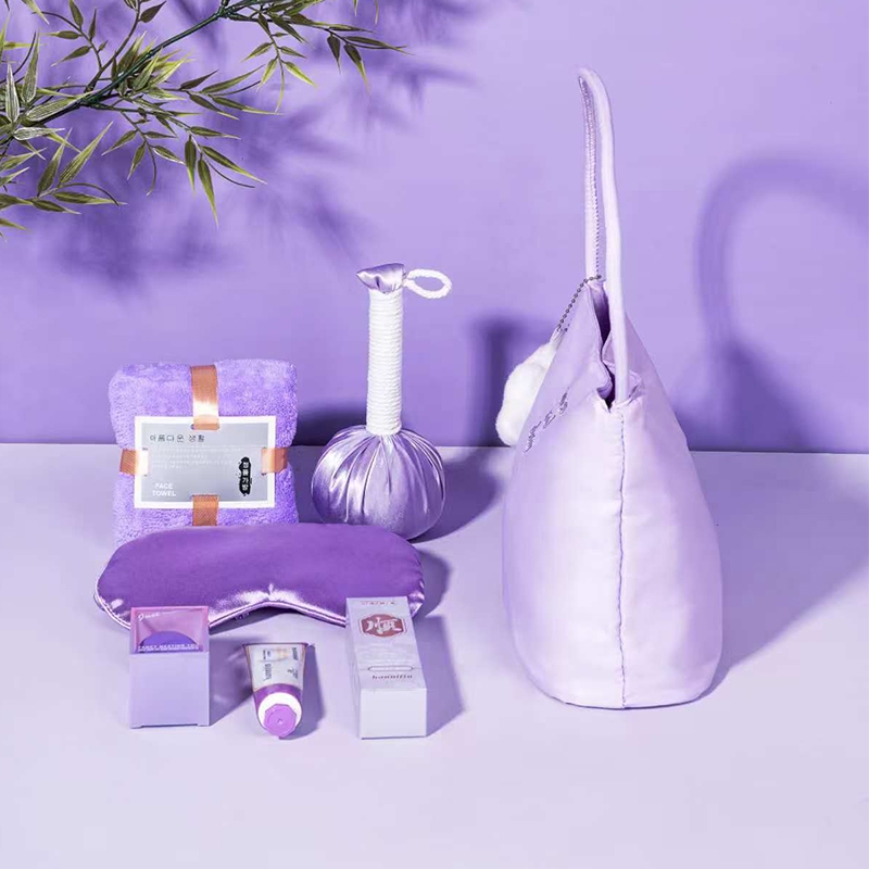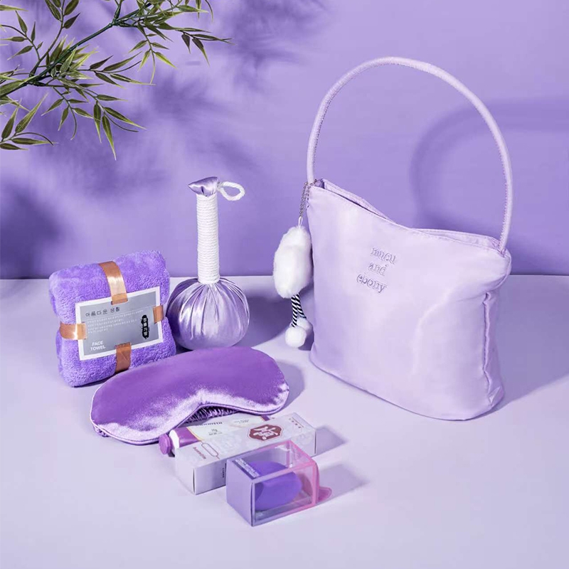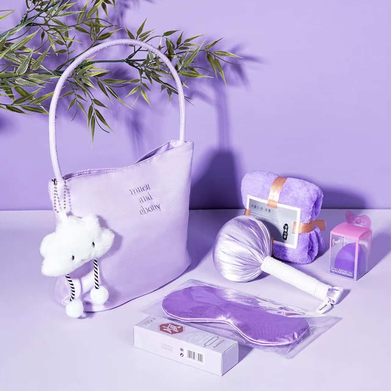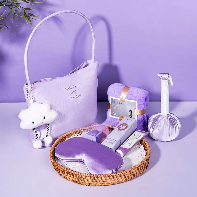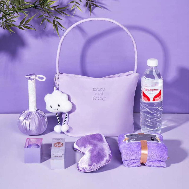 绝绝紫托特包,高弹防水尼龙面料,精美刺绣,袋口磁吸;丝质养生锤,肩颈救星;丝质眼罩,亲肤助眠;香根鸢尾护手霜,高级木质香;精致感拉满