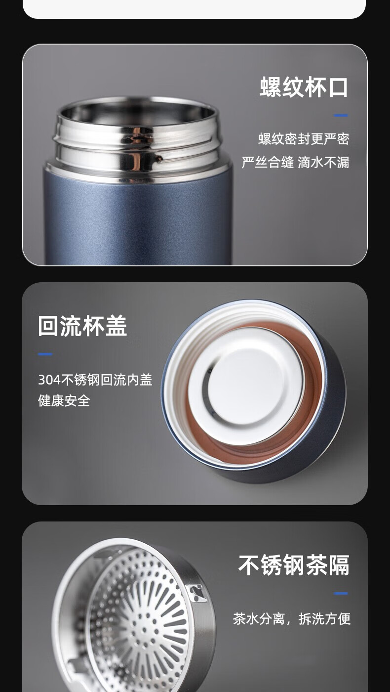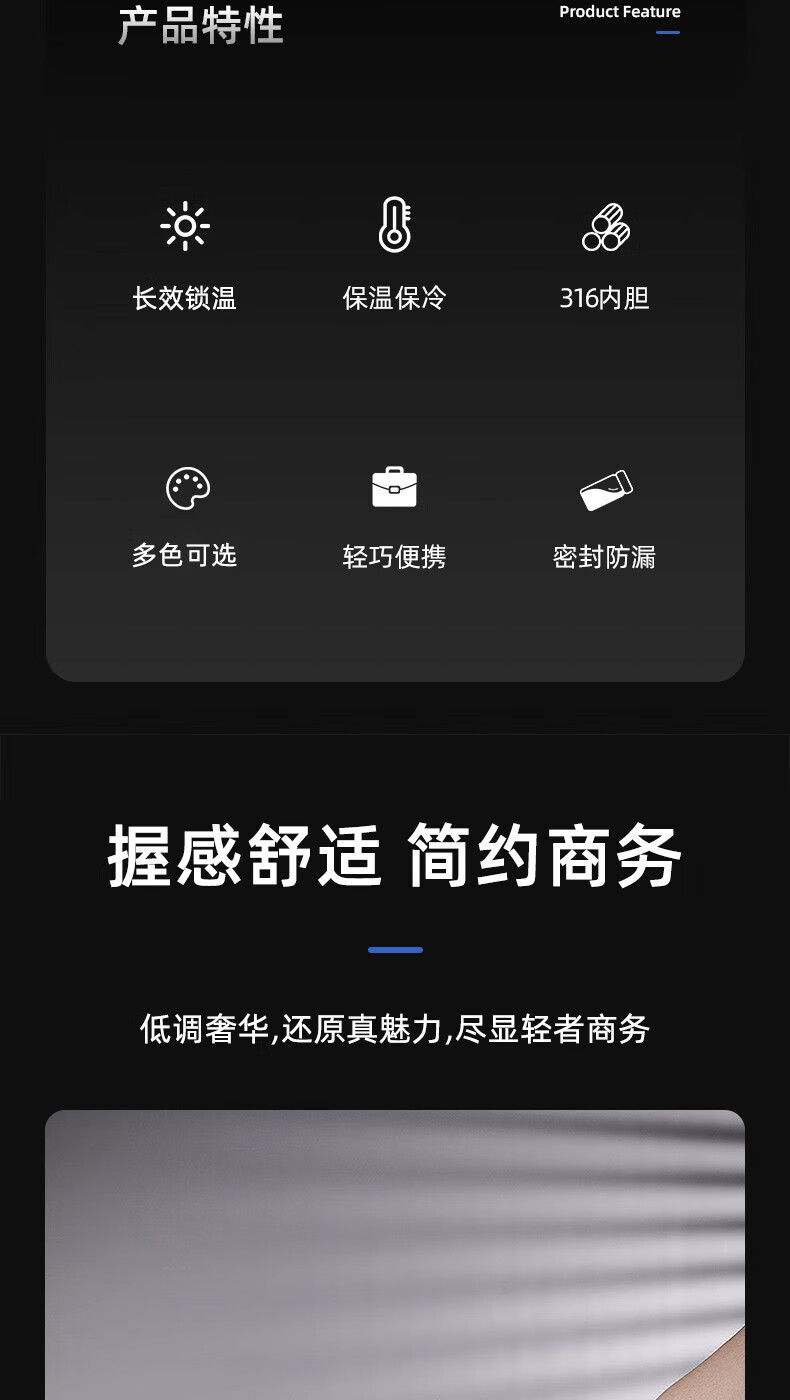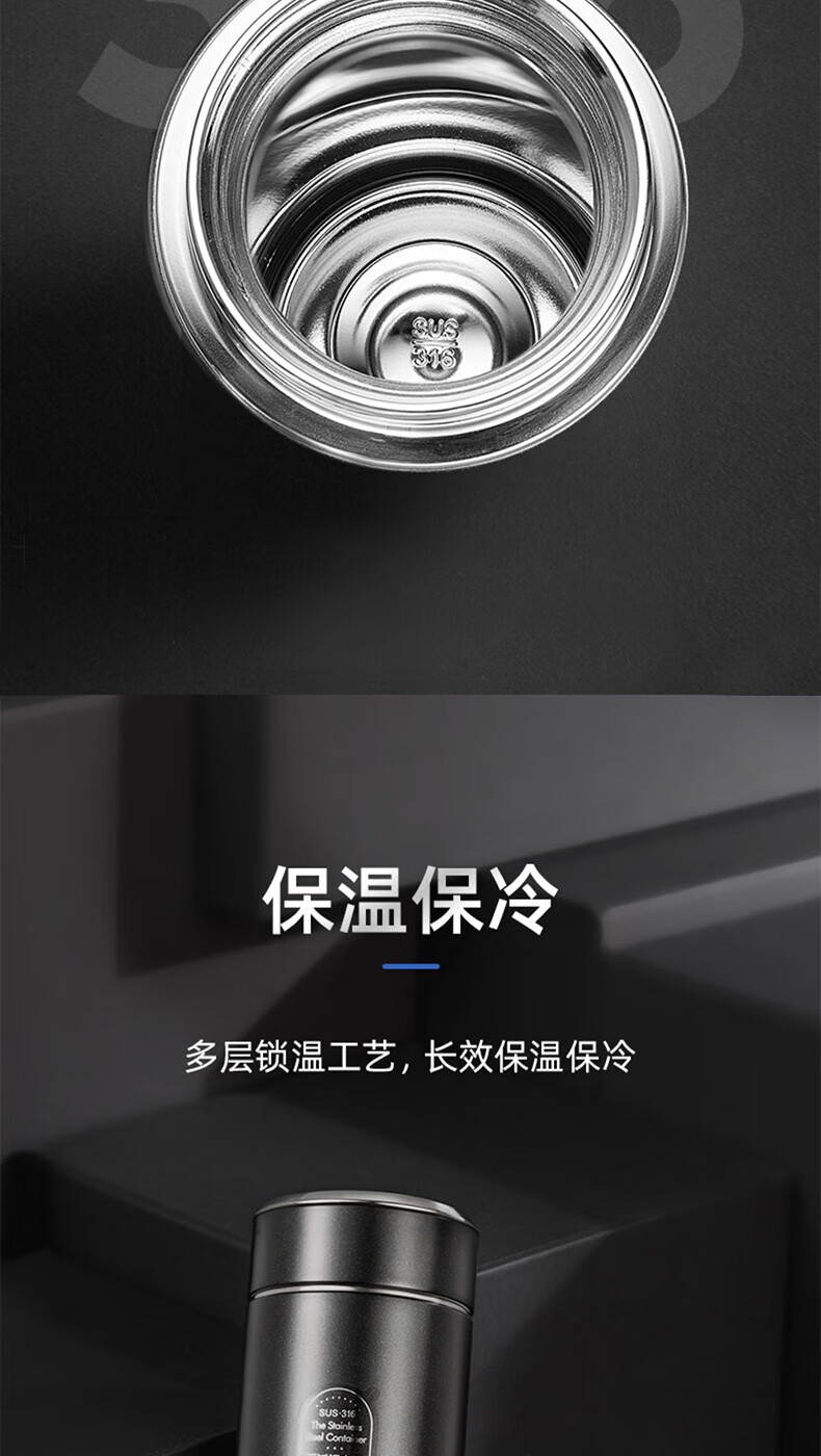 316旋薄超轻内胆,长效锁温;圆润杯口,舒适口感;时尚商务,轻巧便携