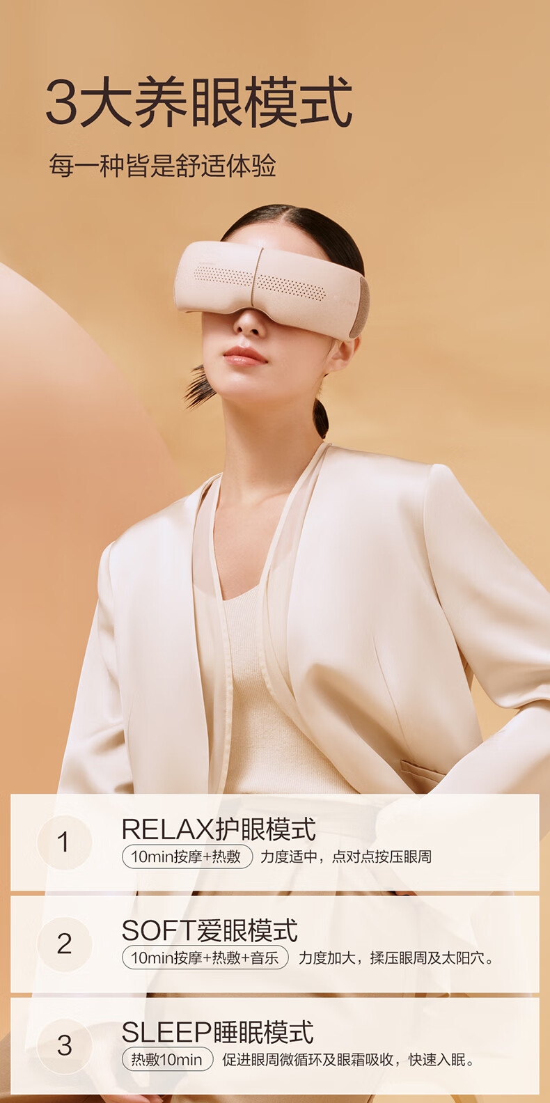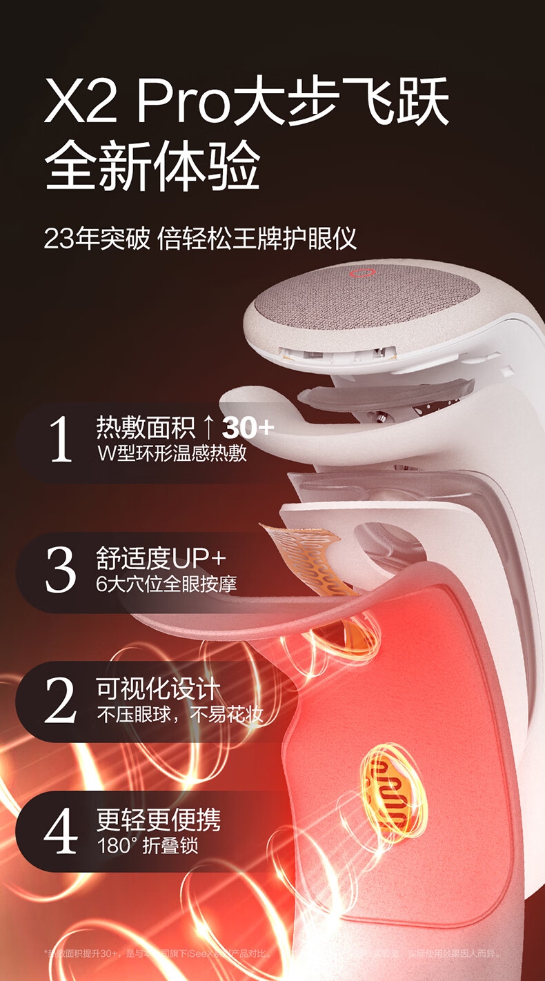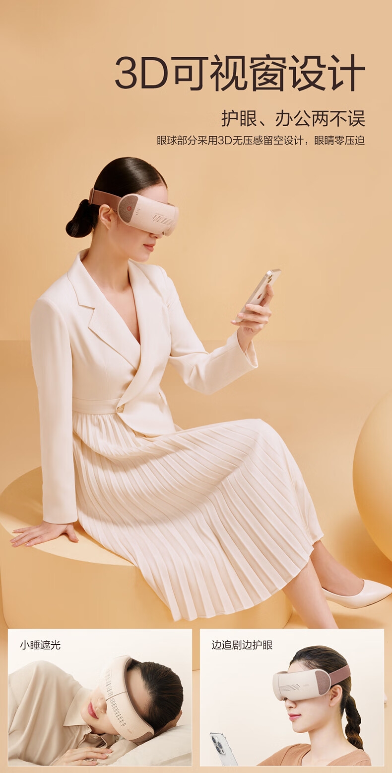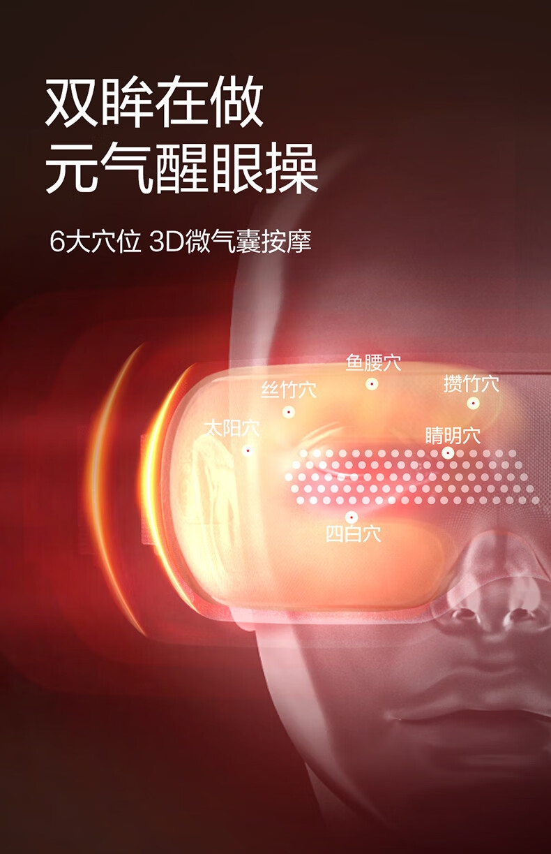 可视化设计,镂空设计+3D凹槽设计不压眼球;;微控制单元芯片,精准控温、PET加热系统发热更均匀;3大养眼模式(爱眼、护眼、睡眠),随意切换