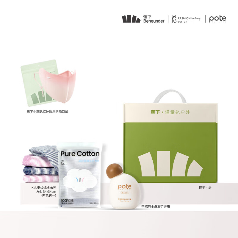配置清单:1. 蕉下小颜腮红护眼角防晒口罩 *1 2. 柏缇白茶盈润护手霜*1 3. K.S.细文纯棉布艺方巾*1 4. 小号手提彩盒*1