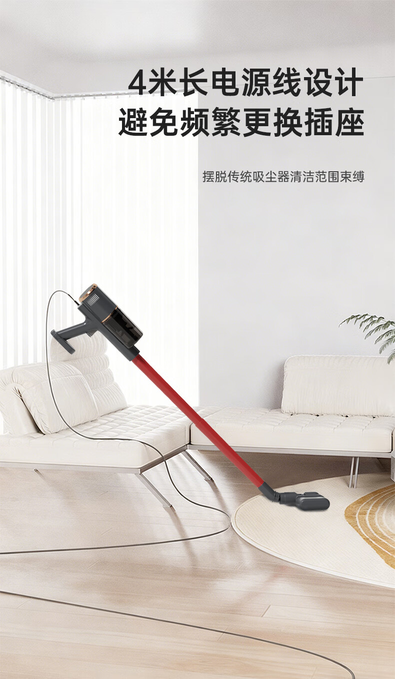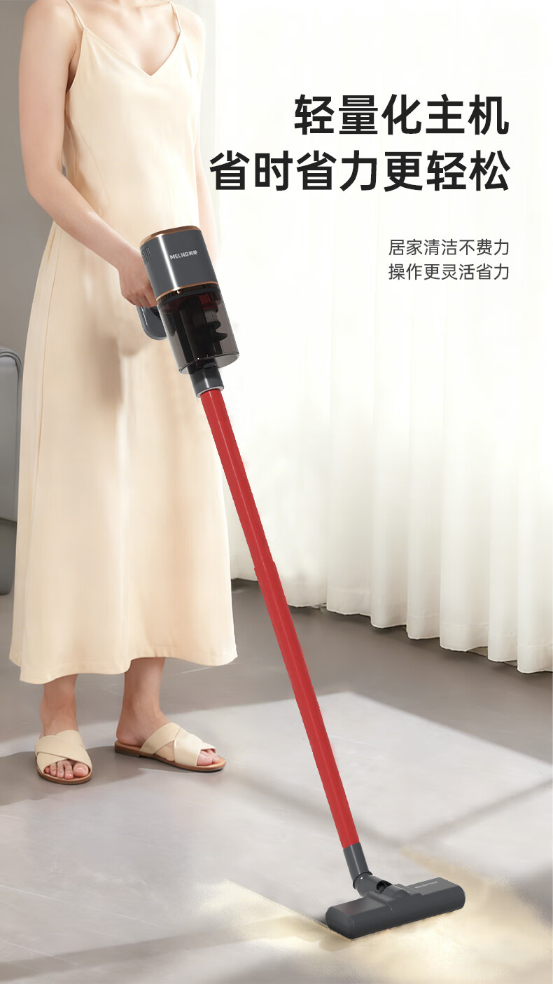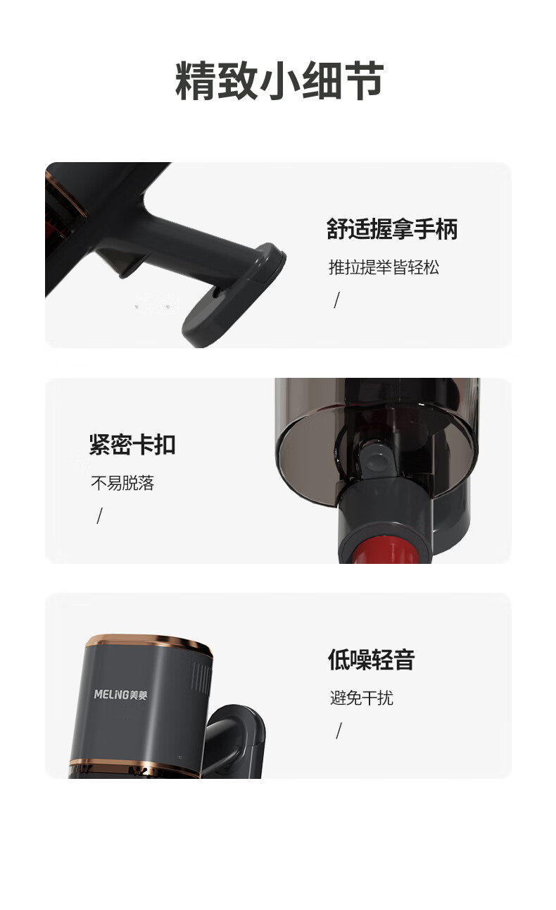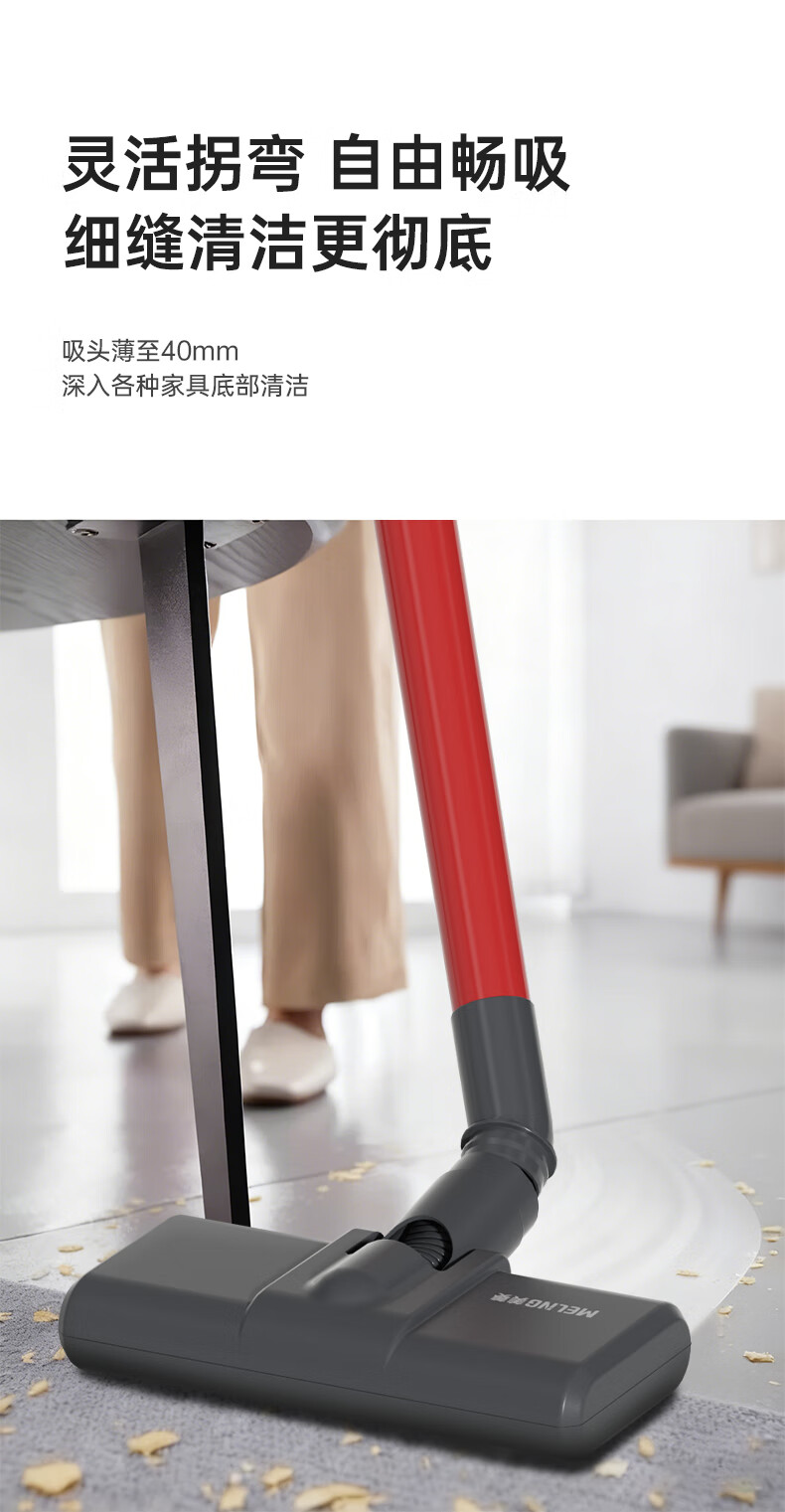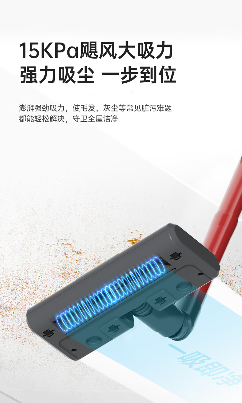 澎湃吸力,一扫而净,多重过滤;主机重量1.3kg,省时省力更轻松;双尘杯设计,外侧储尘内层过滤,,不易堵灰