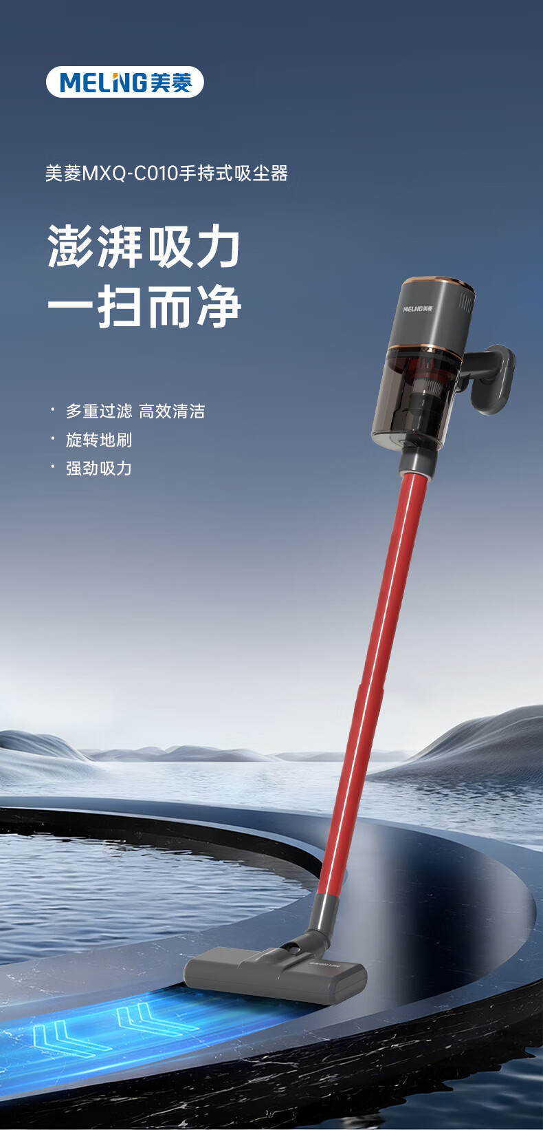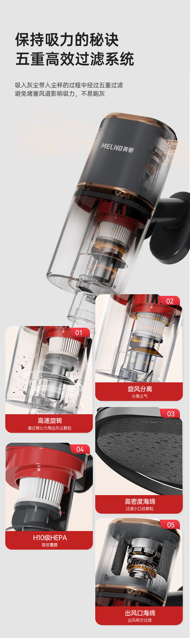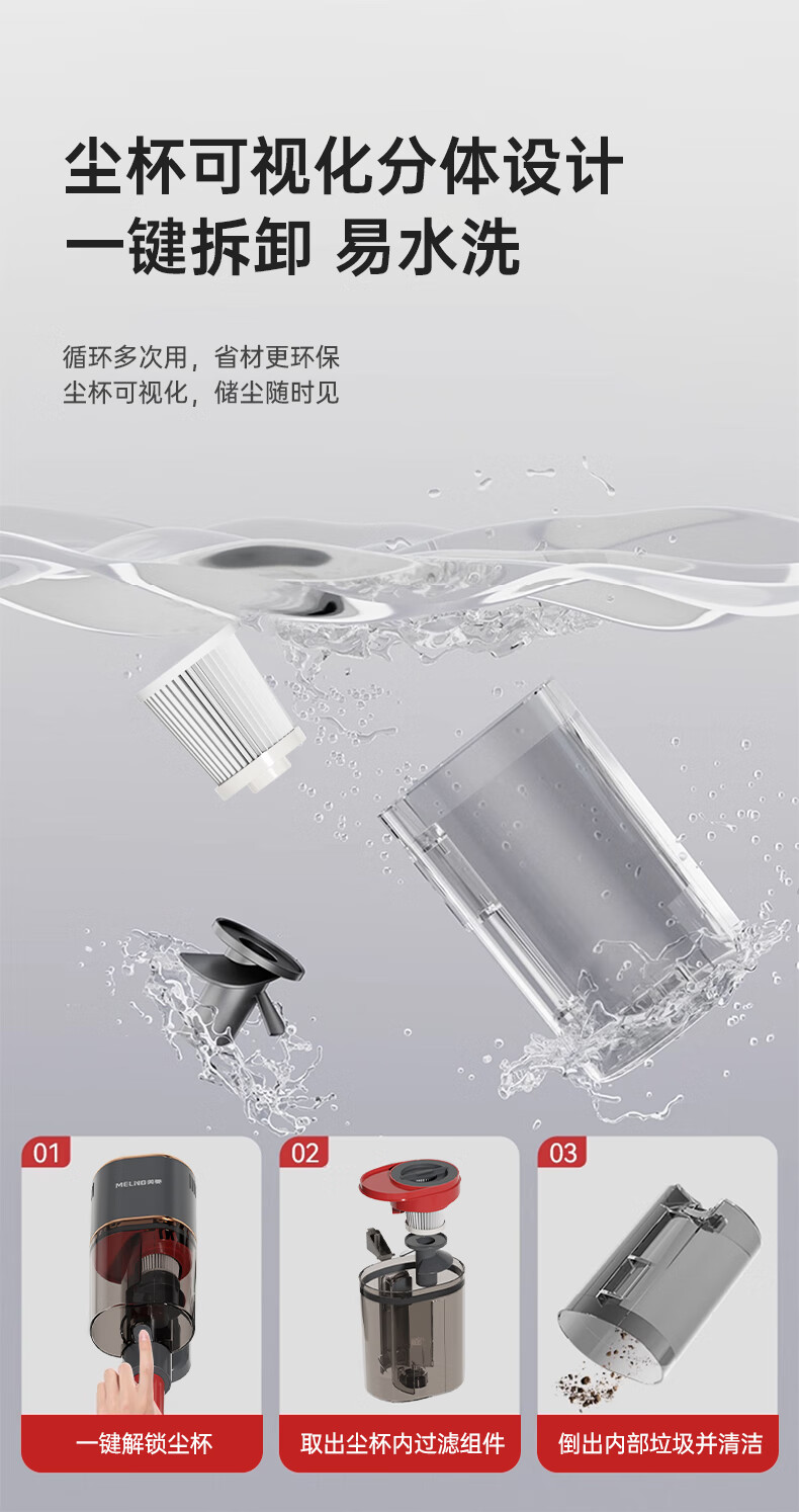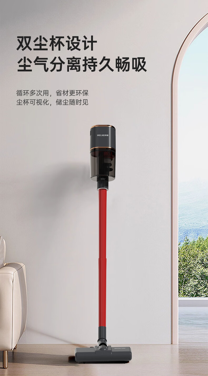 澎湃吸力,一扫而净,多重过滤;主机重量1.3kg,省时省力更轻松;双尘杯设计,外侧储尘内层过滤,,不易堵灰