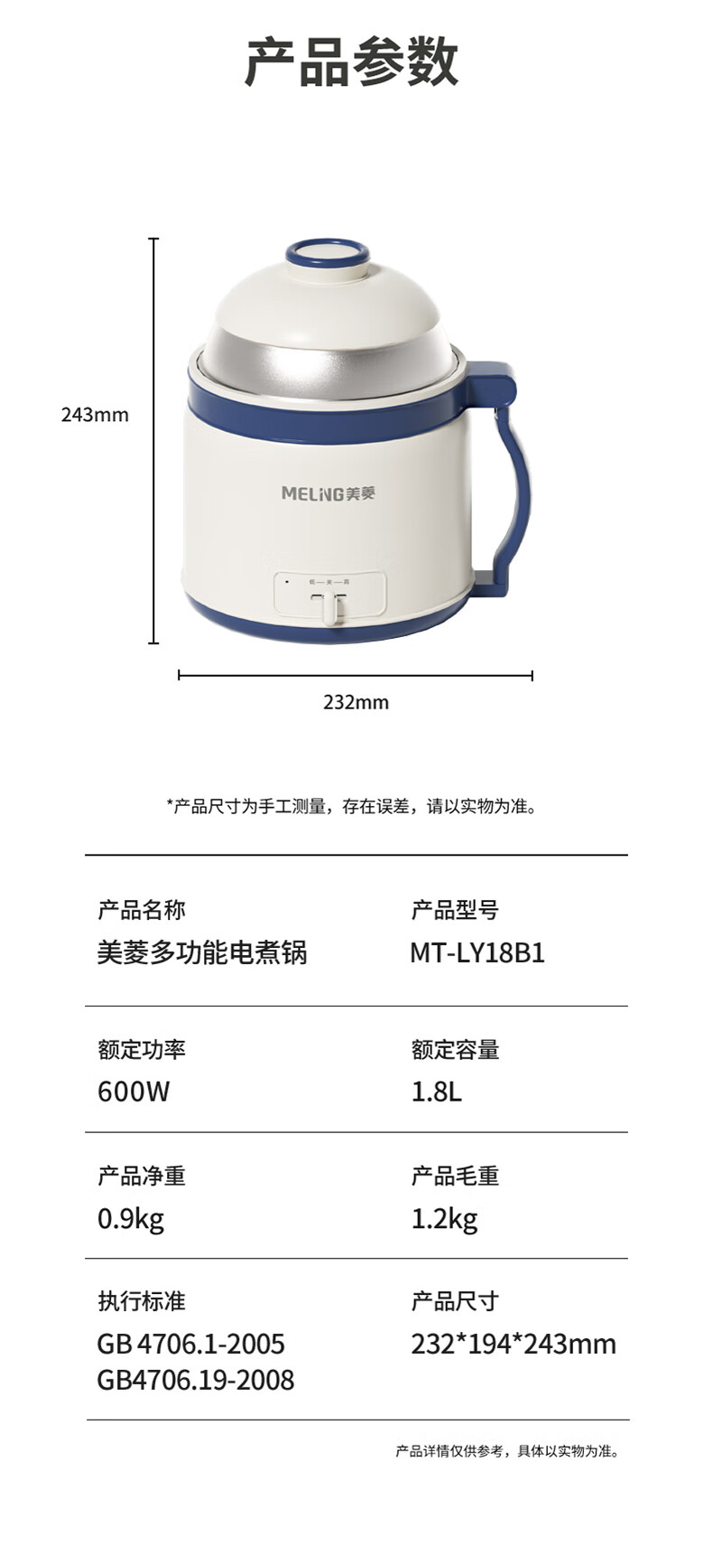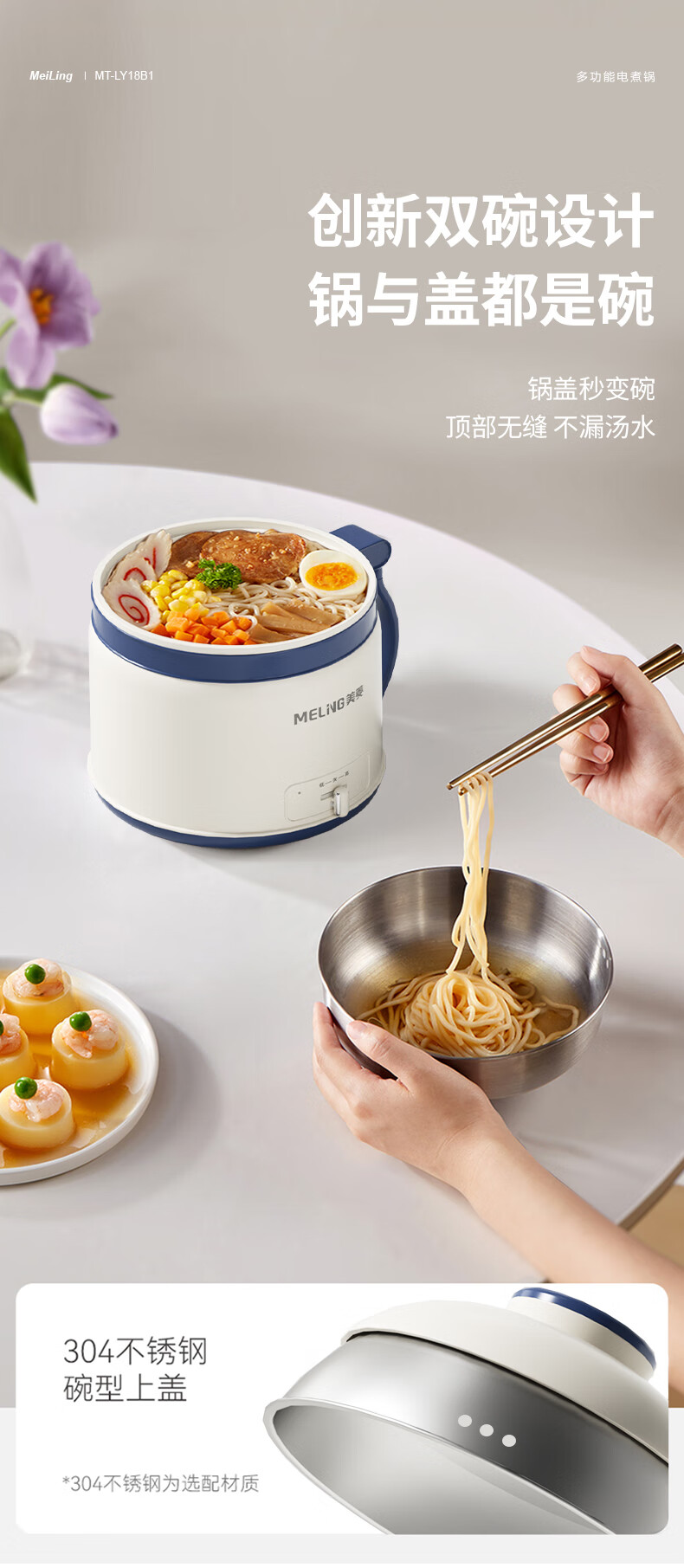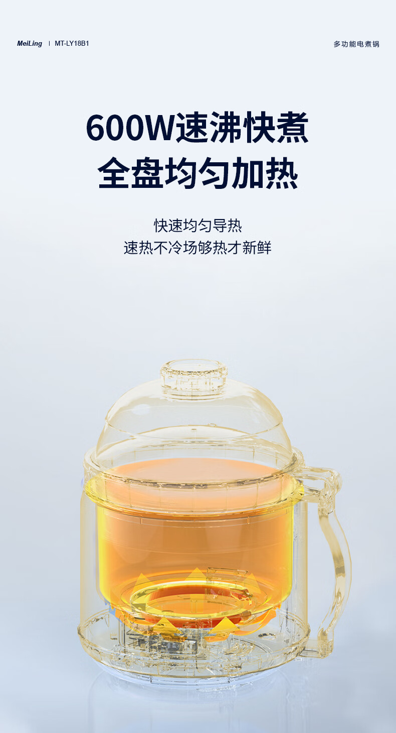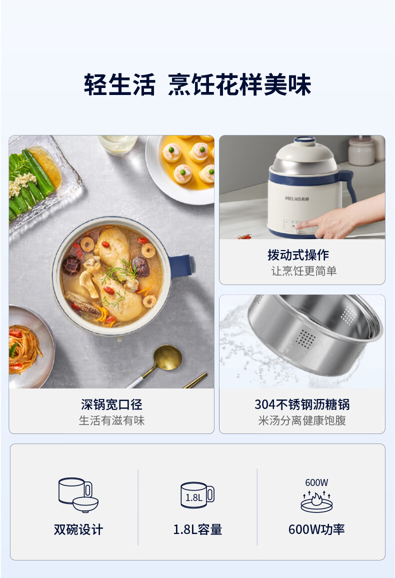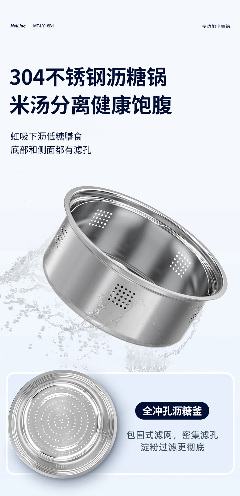1.8L大容量, 陶瓷釉不沾涂层内胆 ,带沥糖锅;花样功能:蒸、煮、炖、涮、火锅等多种功能于一身;304不锈钢二合一盖碗,既是盖也是碗