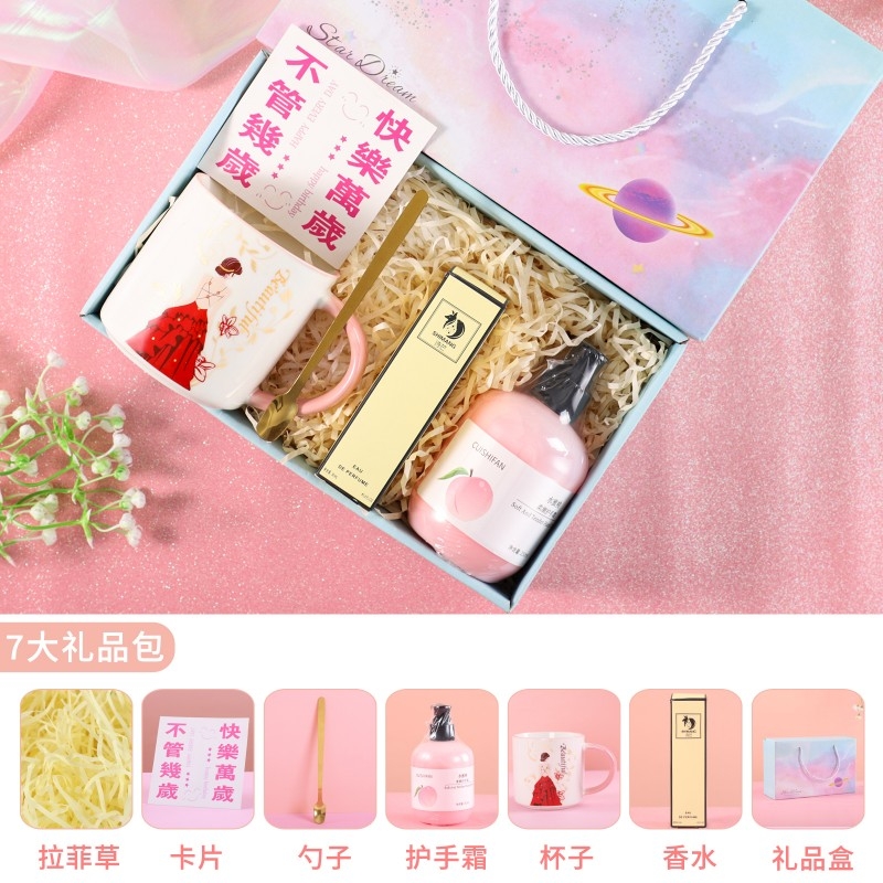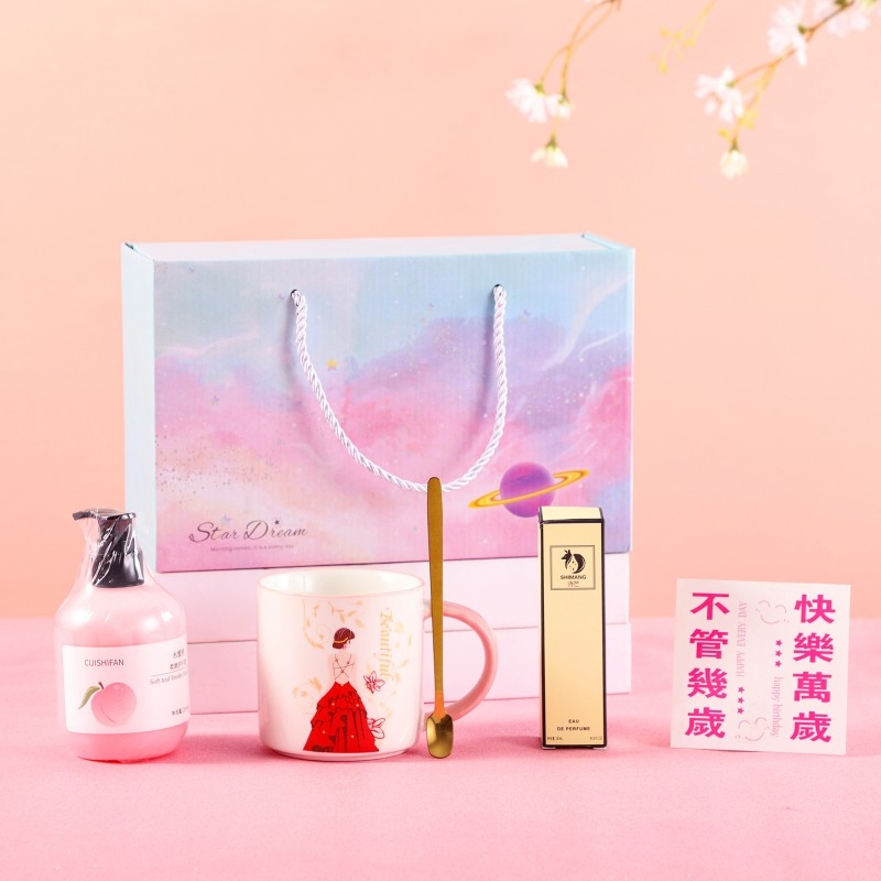 配置清单:女神陶瓷杯、樱花护手霜、香水、搅拌勺、卡片、礼盒