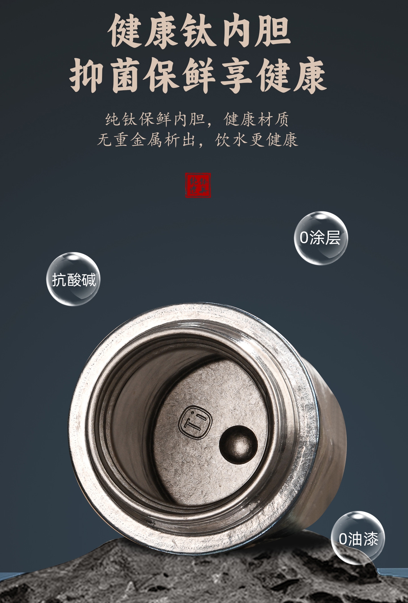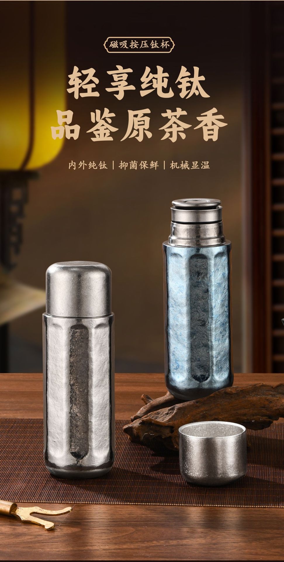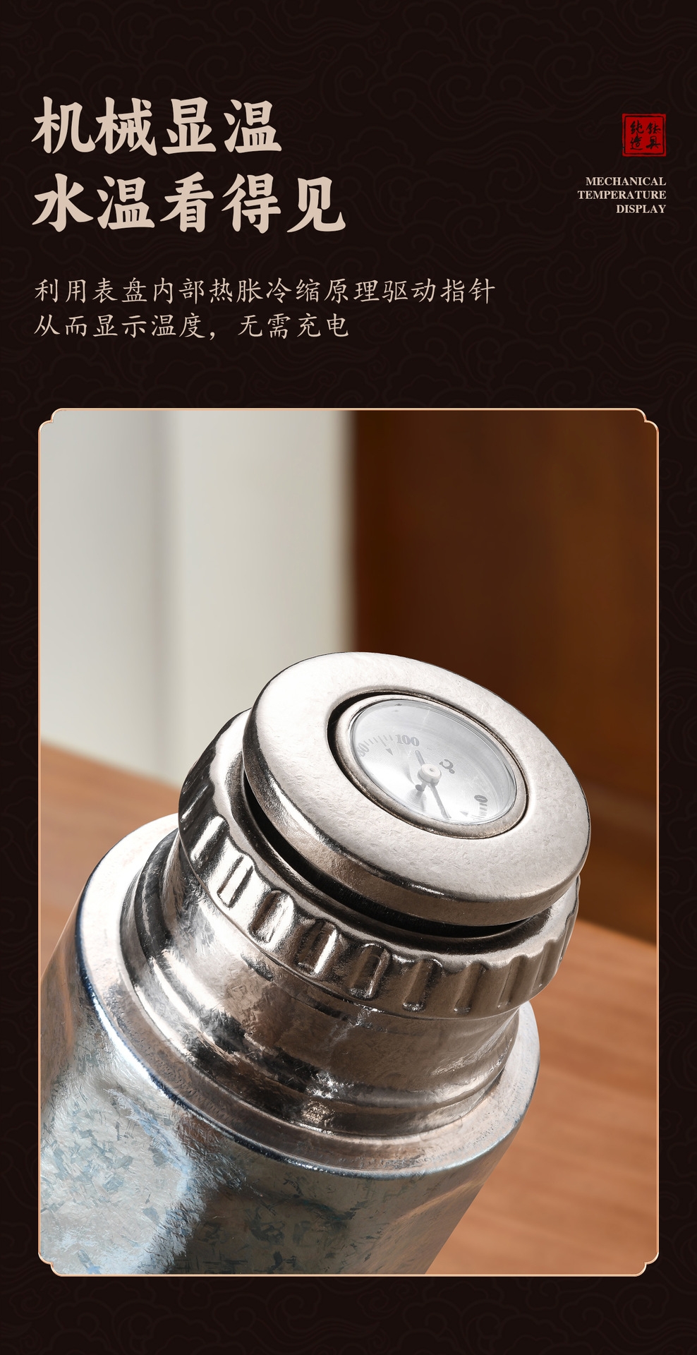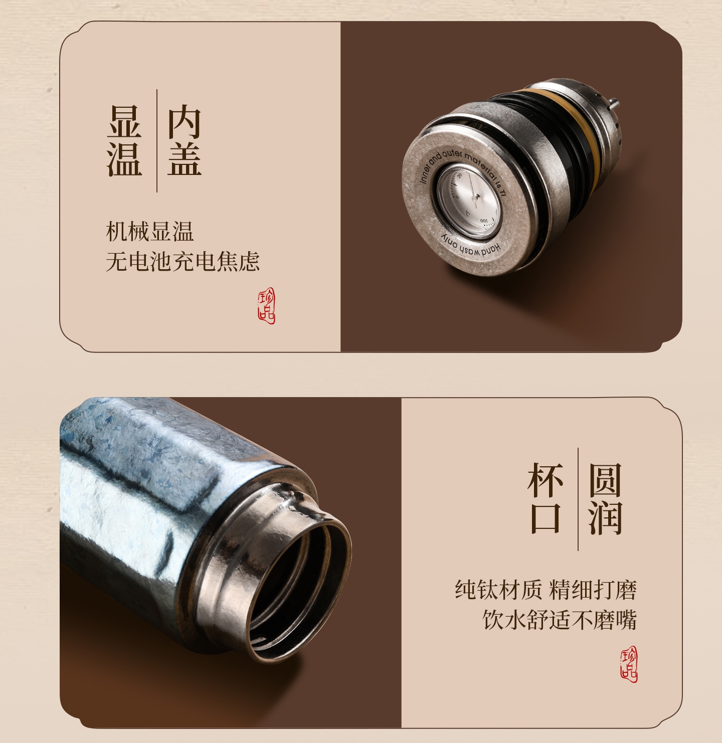 纯钛保鲜内胆,健康材质无重金属析出,饮水更健康;磁吸杯盖,无需旋转牢固吸附,外盖无螺纹,磁吸设计;机械显温水温看得见,利用表盘内部热胀冷缩原理驱动;抗酸碱耐腐蚀焖泡,纯正好茶味,里外钛材质,纯净安全;层层锁温,臻享鲜醇;保温保冷,双层真空结构不受影响