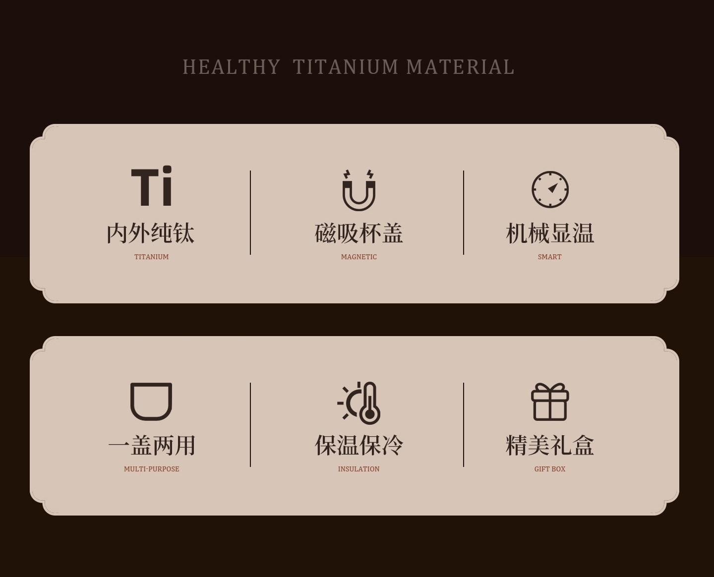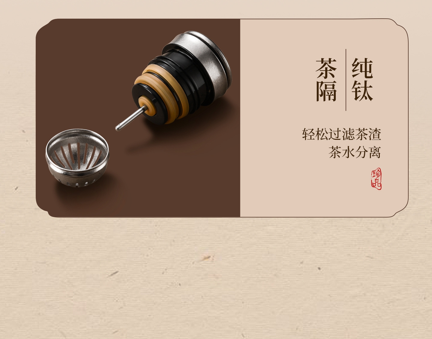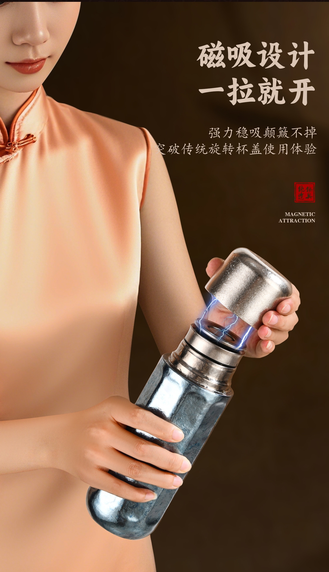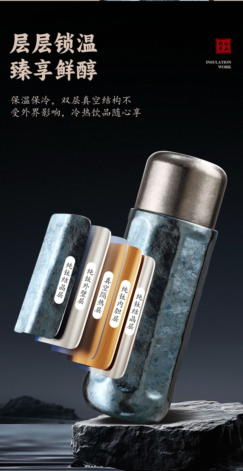 纯钛保鲜内胆,健康材质无重金属析出,饮水更健康;磁吸杯盖,无需旋转牢固吸附,外盖无螺纹,磁吸设计;机械显温水温看得见,利用表盘内部热胀冷缩原理驱动;抗酸碱耐腐蚀焖泡,纯正好茶味,里外钛材质,纯净安全;层层锁温,臻享鲜醇;保温保冷,双层真空结构不受影响