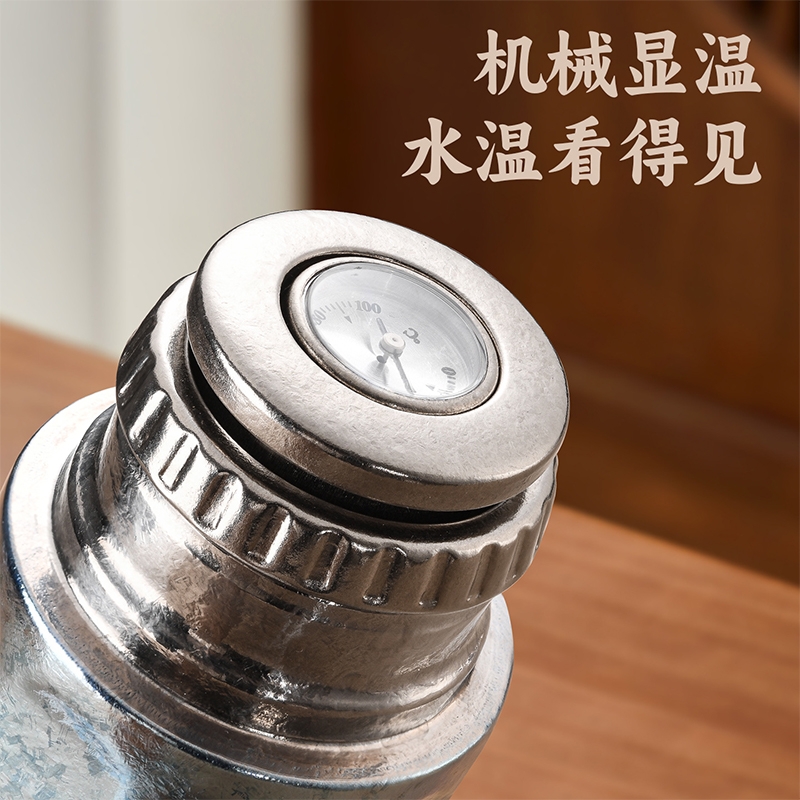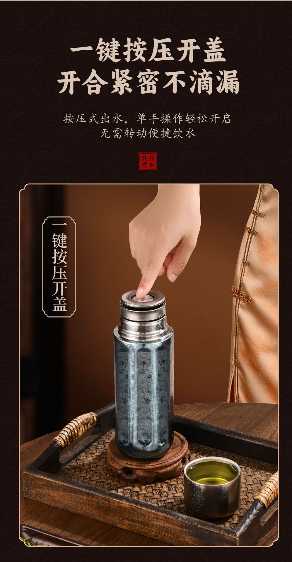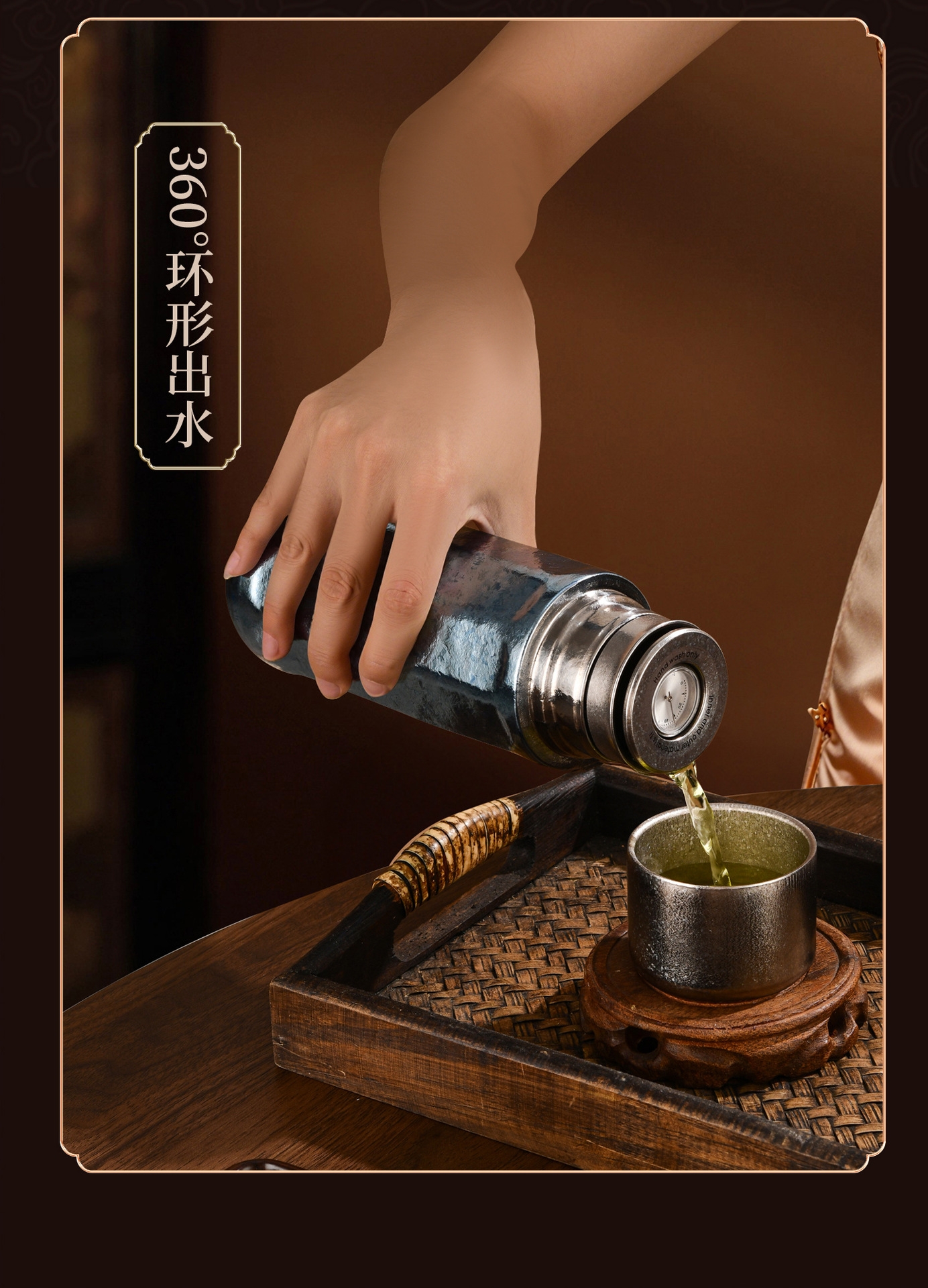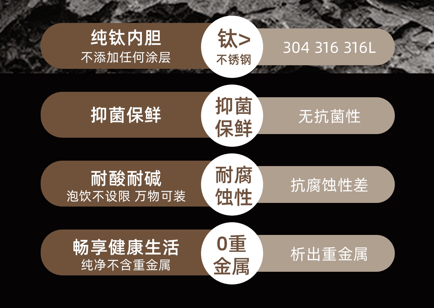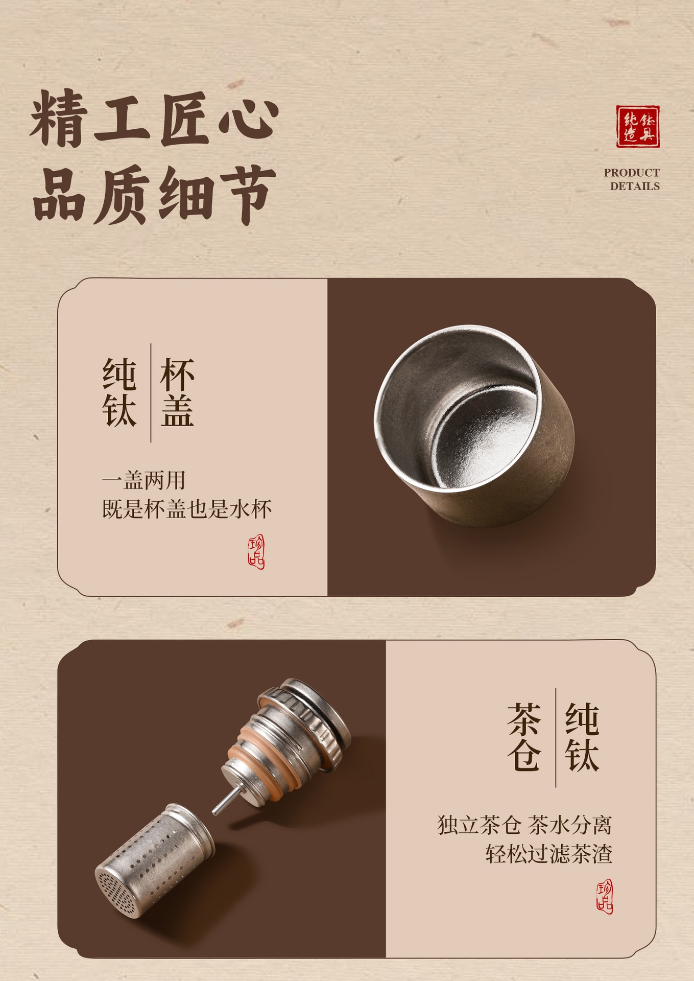 纯钛保鲜内胆,健康材质无重金属析出,饮水更健康;磁吸杯盖,无需旋转牢固吸附,外盖无螺纹,磁吸设计;机械显温水温看得见,利用表盘内部热胀冷缩原理驱动;抗酸碱耐腐蚀焖泡,纯正好茶味,里外钛材质,纯净安全;层层锁温,臻享鲜醇;保温保冷,双层真空结构不受影响