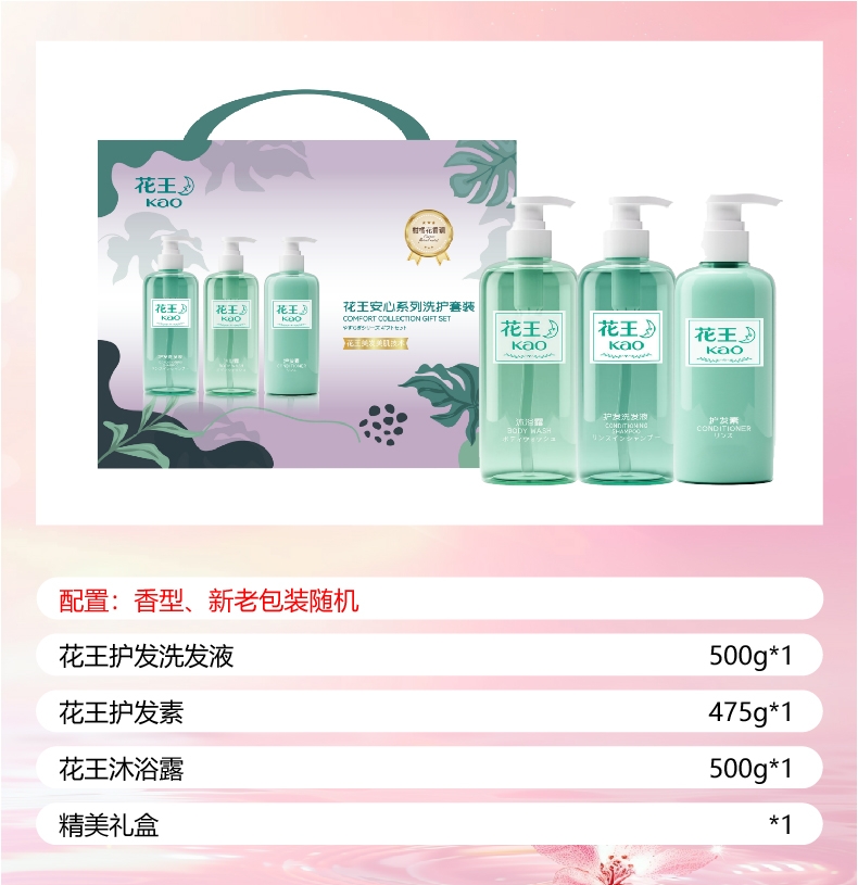 配置清单:花王(KAO)护发洗发液500g*1 花王(KAO)护发素475g*1 花王(KAO)沐浴露500g*1 精美礼盒*1