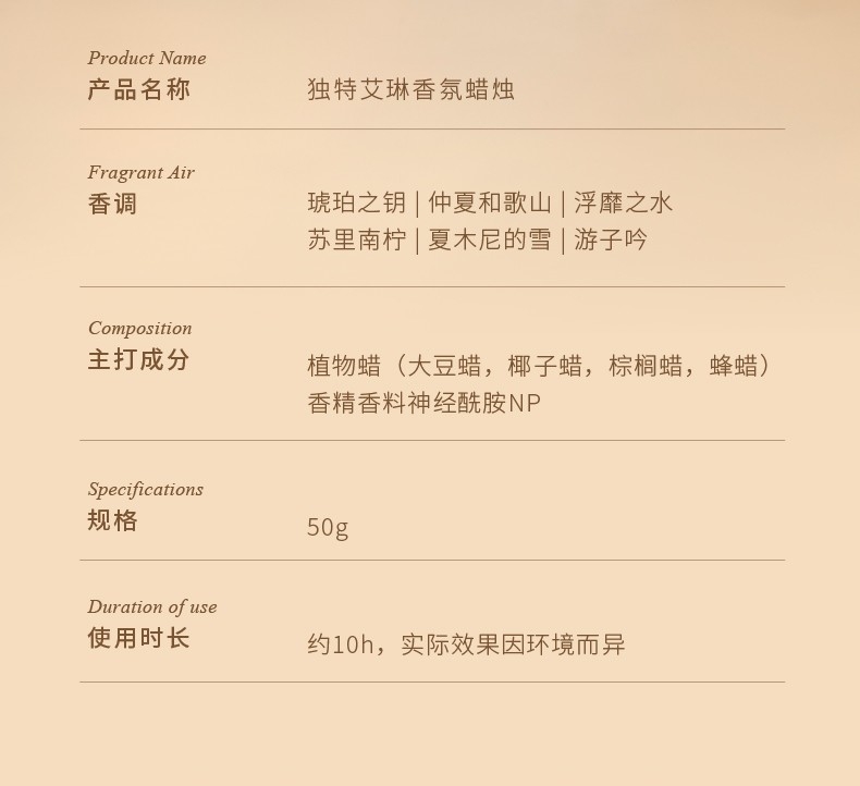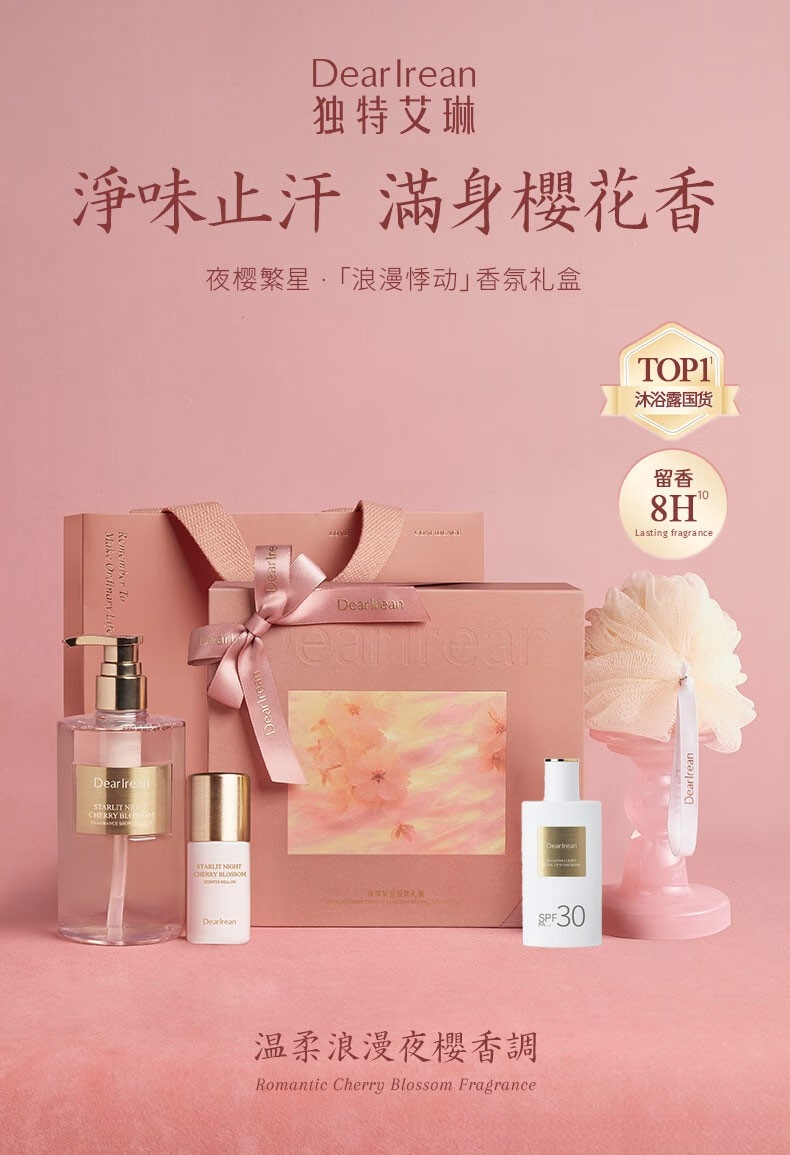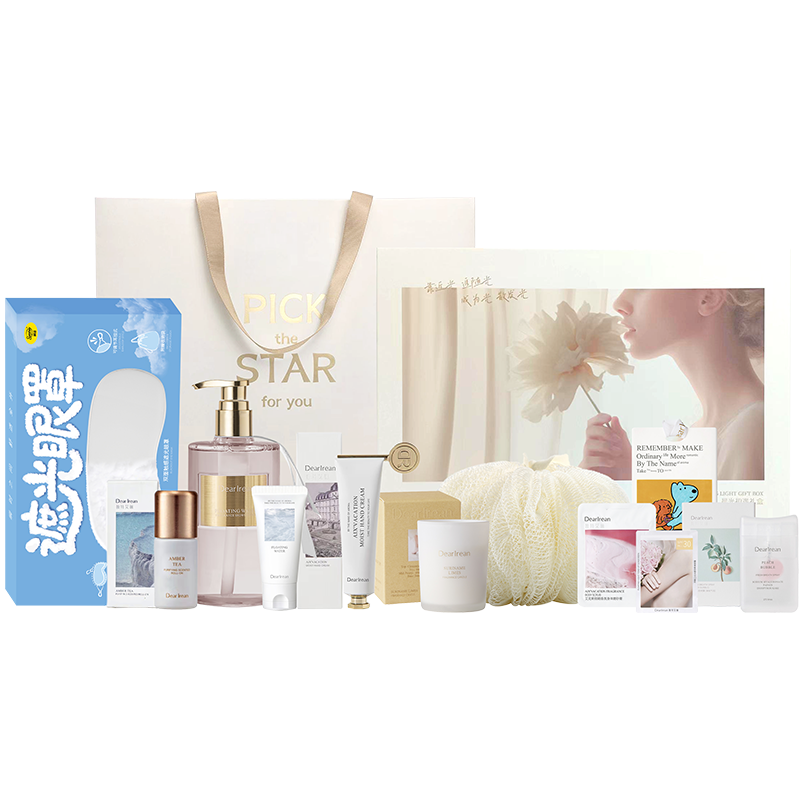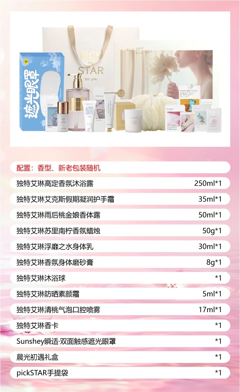 配置清单:独特艾琳高定香氛沐浴露250ml*1 独特艾琳艾克斯假期凝润护手霜35ml*1 独特艾琳雨后桃金娘香体露50ml*1 独特艾琳苏里南柠香氛蜡烛 50g*1 独特艾琳浮靡之水身体乳30ml*1 独特艾琳香氛身体磨砂膏8g(单包)*1 独特艾琳沐浴球*1 独特艾琳防晒素颜霜5ml*1(赠品) 独特艾琳清桃气泡口腔喷雾17ml*1 独特艾琳香卡*1(赠品) Sunshey瞬适·双面触感(办公差旅)遮光眼罩 *1(零售价69元) 晨光初遇礼盒*1 pickSTAR(晨光初遇礼盒)手提袋