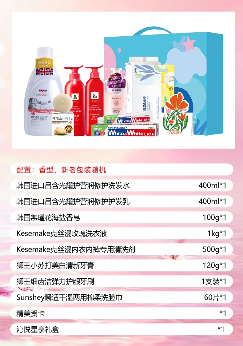 配置清单:韩国进口吕含光耀护营润修护洗发水400ml*1 韩国进口吕含光耀护营润修护护发乳400ml*1 韩国無瑾花海盐香皂100g*1 Kesemake克丝漫玫瑰洗衣液1kg*1 Kesemake克丝漫内衣内裤专用清洗剂500g*1 狮王(Lion)小苏打美白清新牙膏120g*1 狮王(Lion)细齿洁弹力护龈牙刷1支装*1 Sunshey瞬适干湿两用棉柔洗脸巾60片*1 精美贺卡*1(量大可定制) 沁悦星享礼盒ZS228*1
