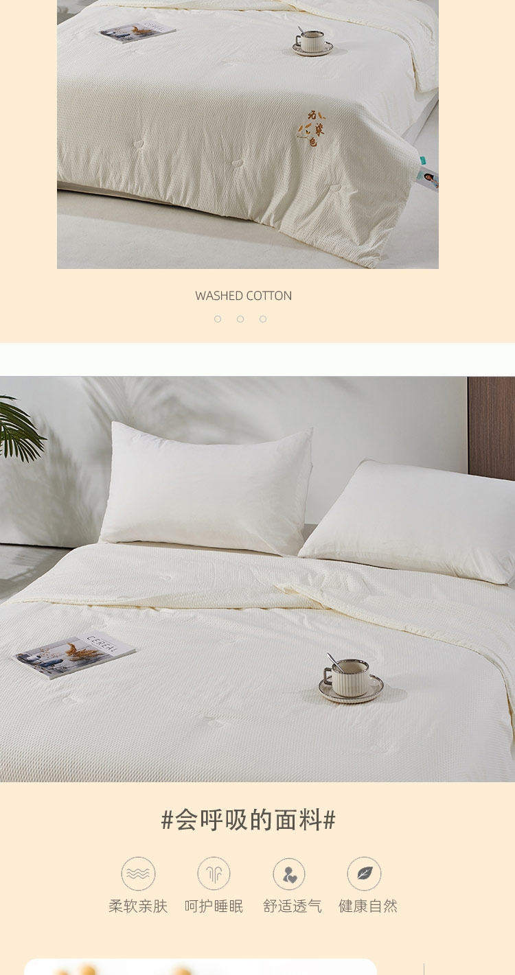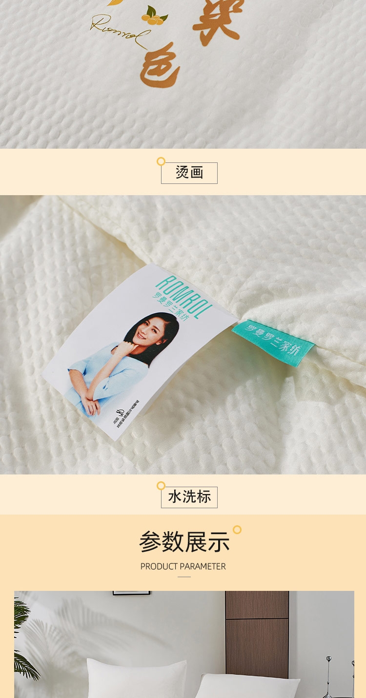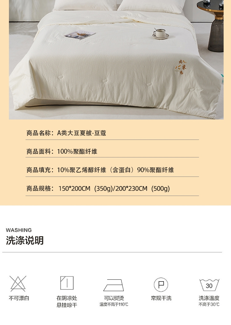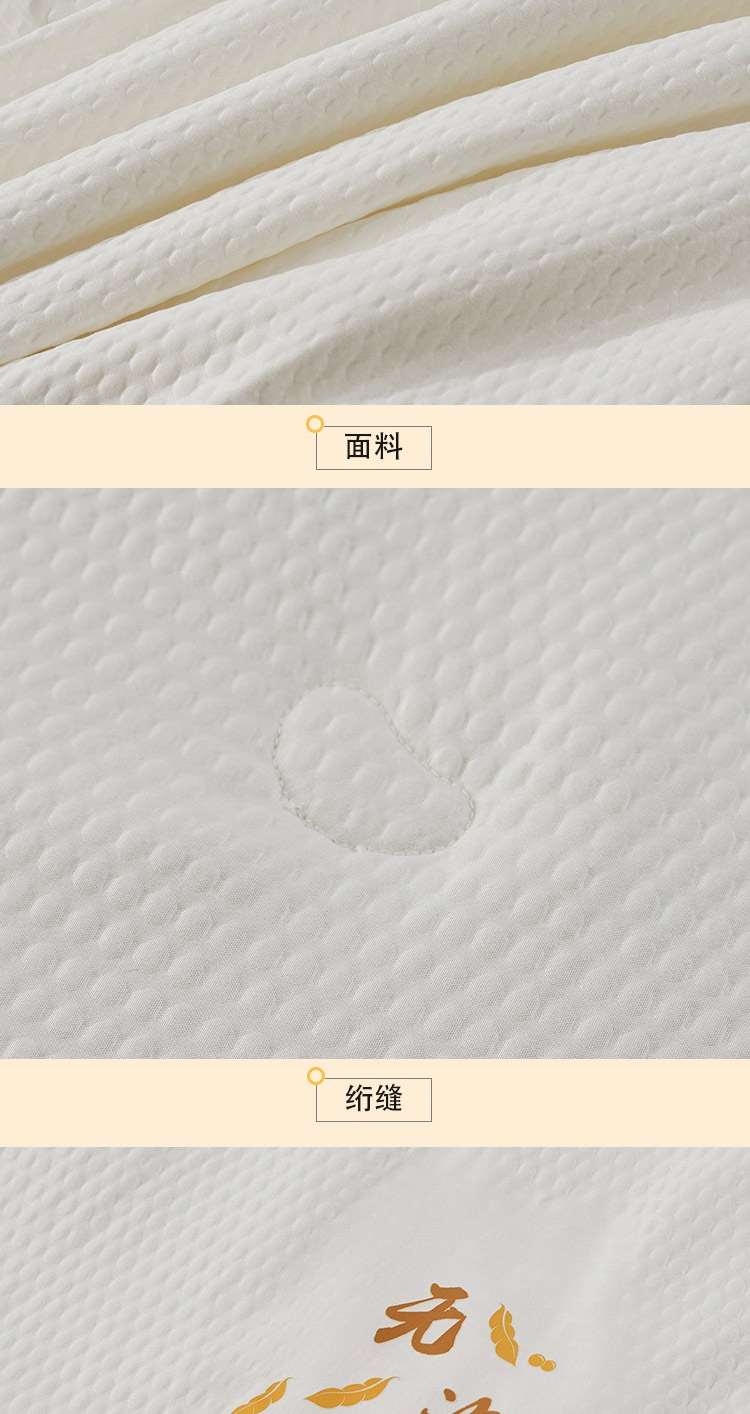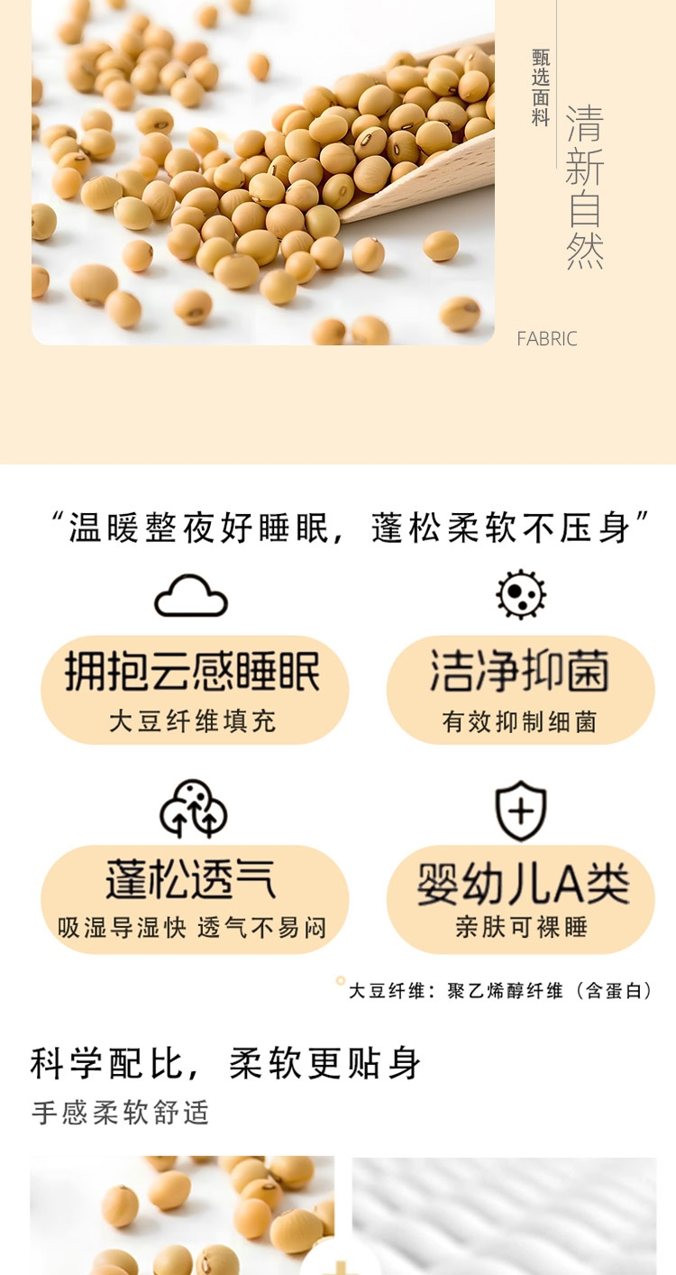 采用婴幼儿A类亲肤面料,柔软舒适,有效抑制细菌;内部填充大豆纤维,蓬松透气,吸湿导湿快;采用本色面料,环保无染色