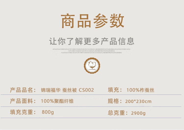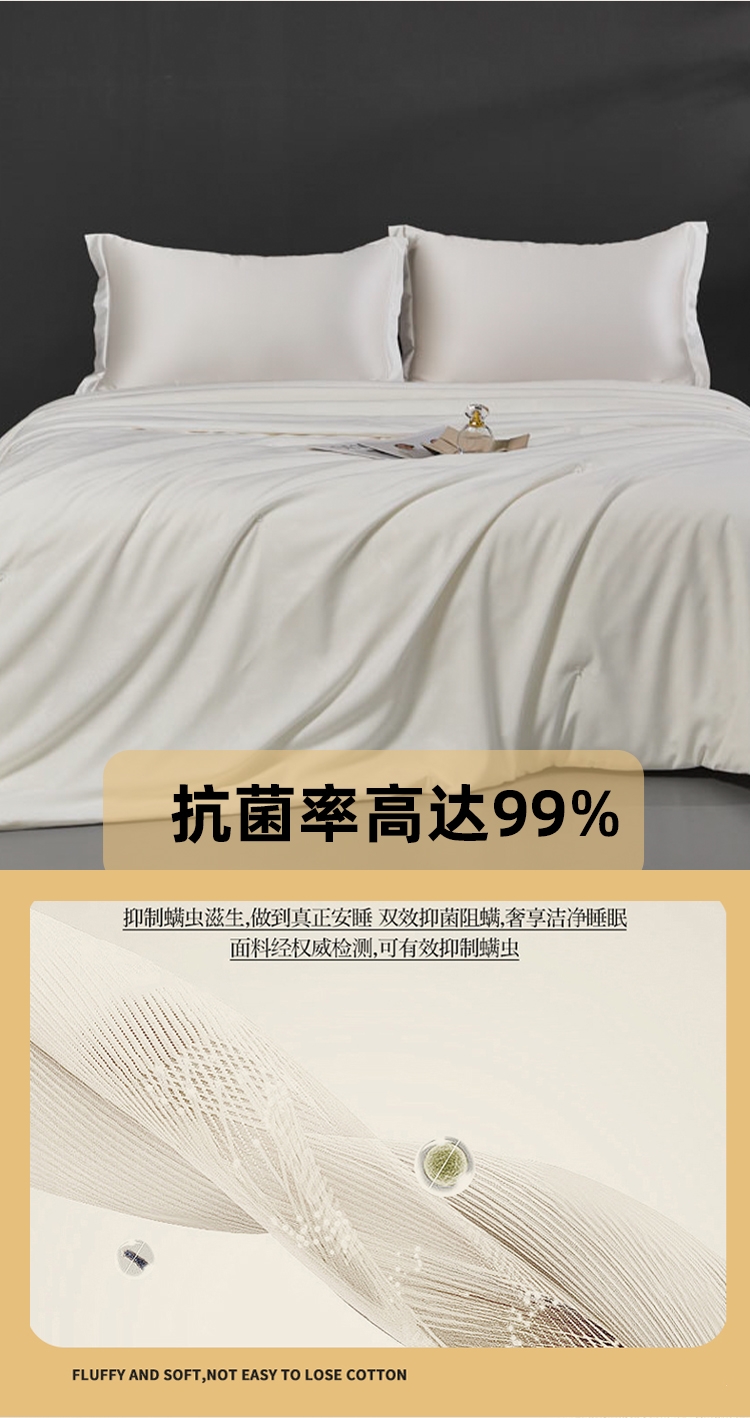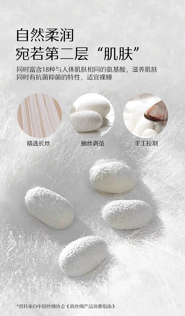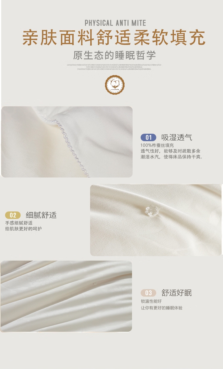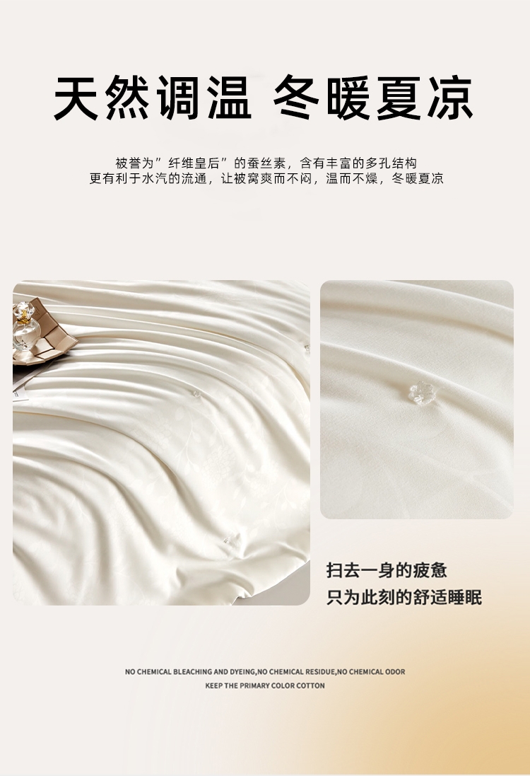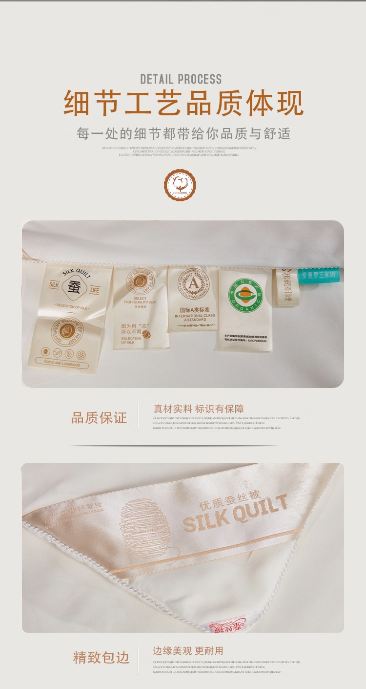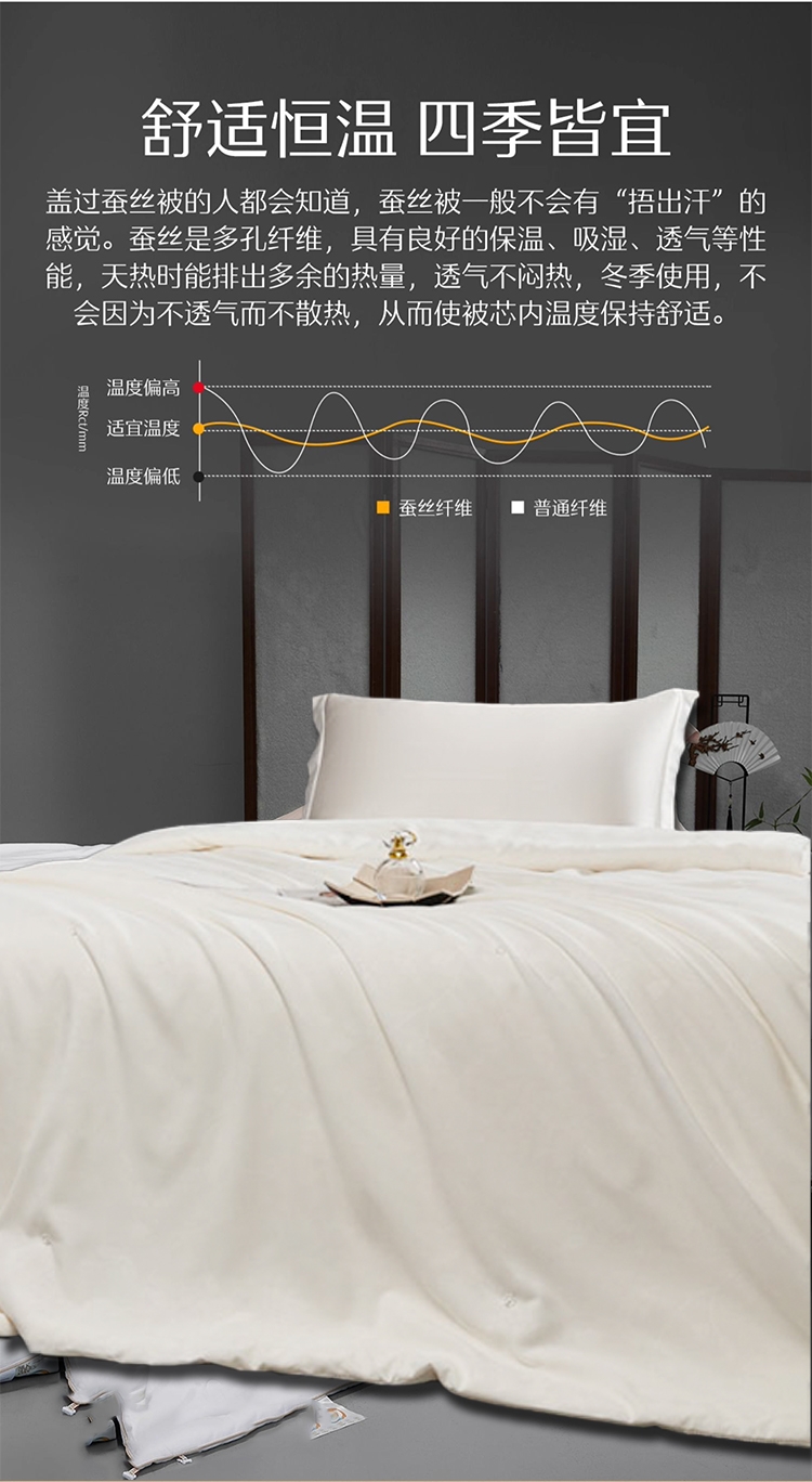 精选黄金产区柞蚕丝,800g科学配比填充;聚酯纤维面料经过特殊磨毛处理,触感柔滑细腻;手工九宫格绗缝工艺如艺术品般精密,确保蚕丝不板结