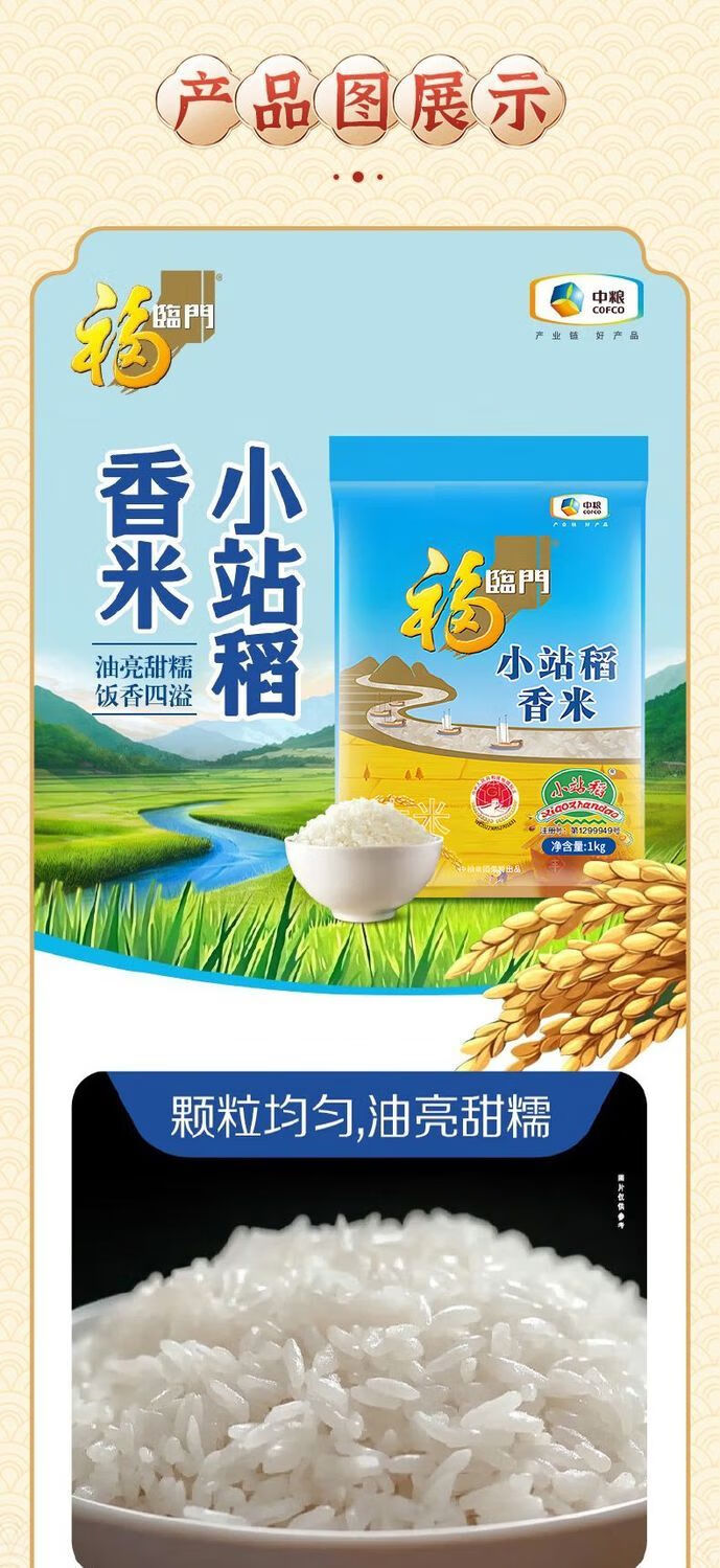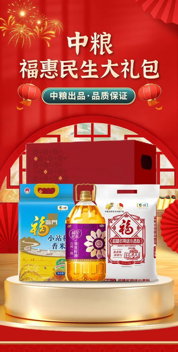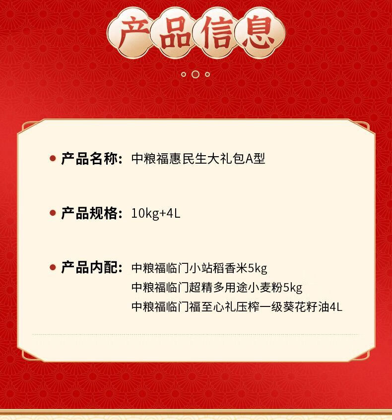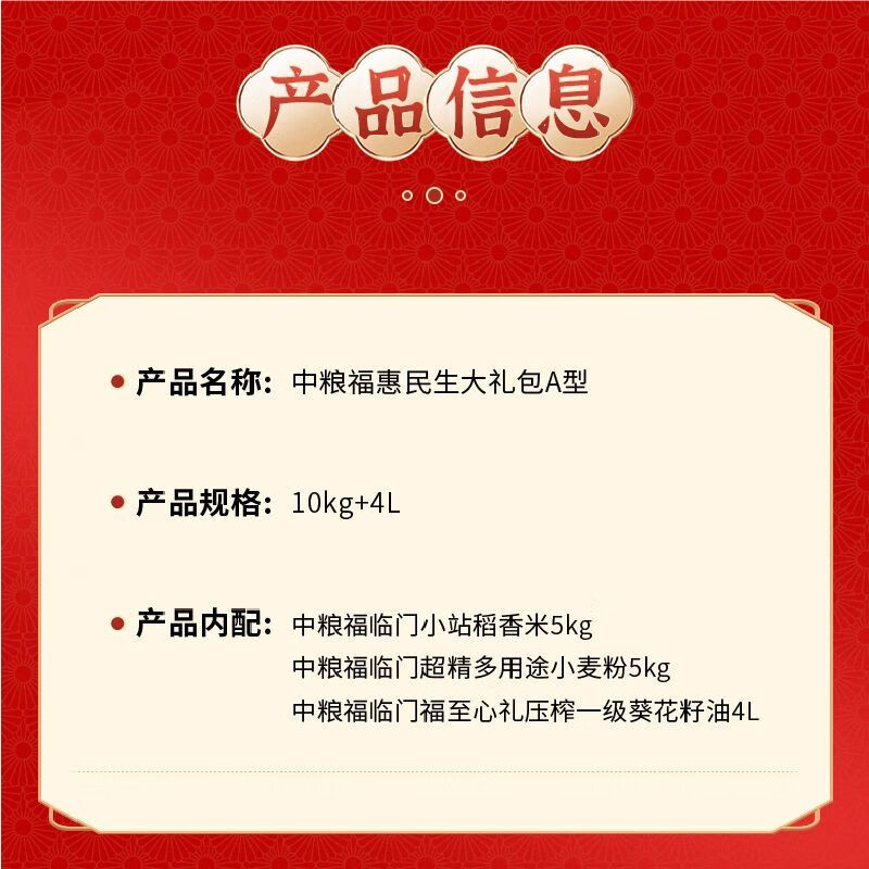 配置:福临门小站稻香米5kg 中粮福临门超精多用途小麦粉5kg 中粮福临门福至心礼压榨一级葵花籽油4L