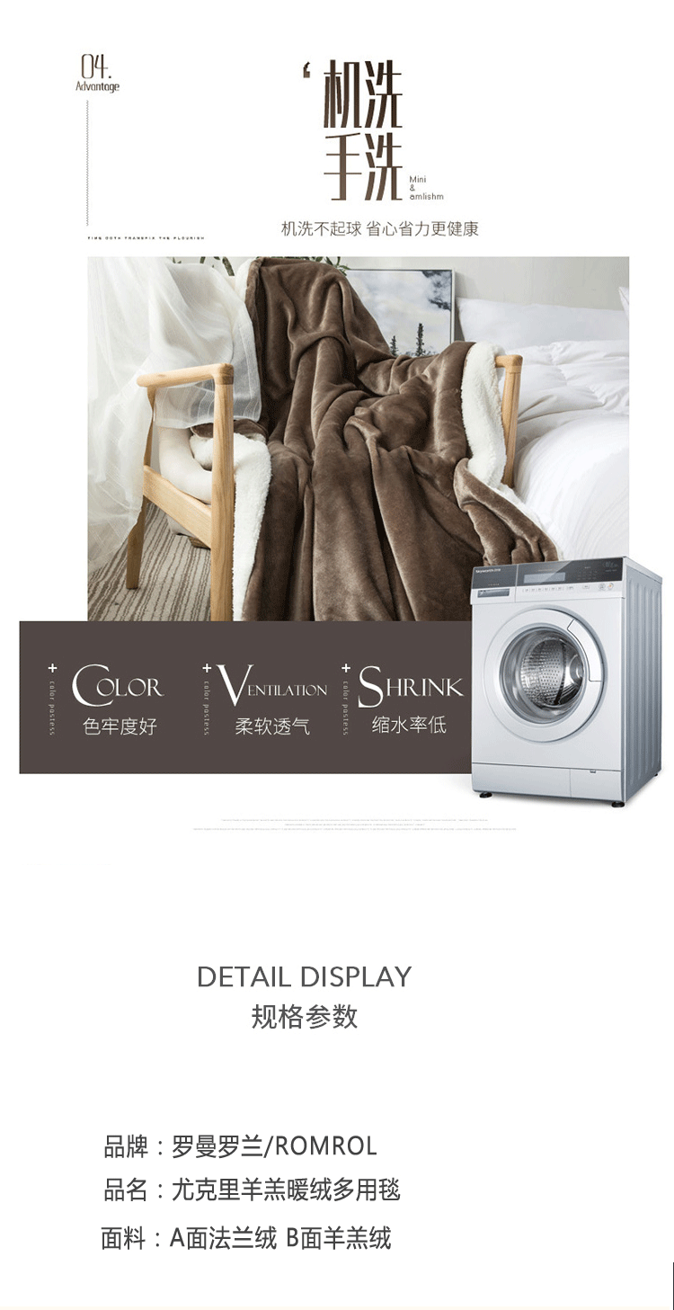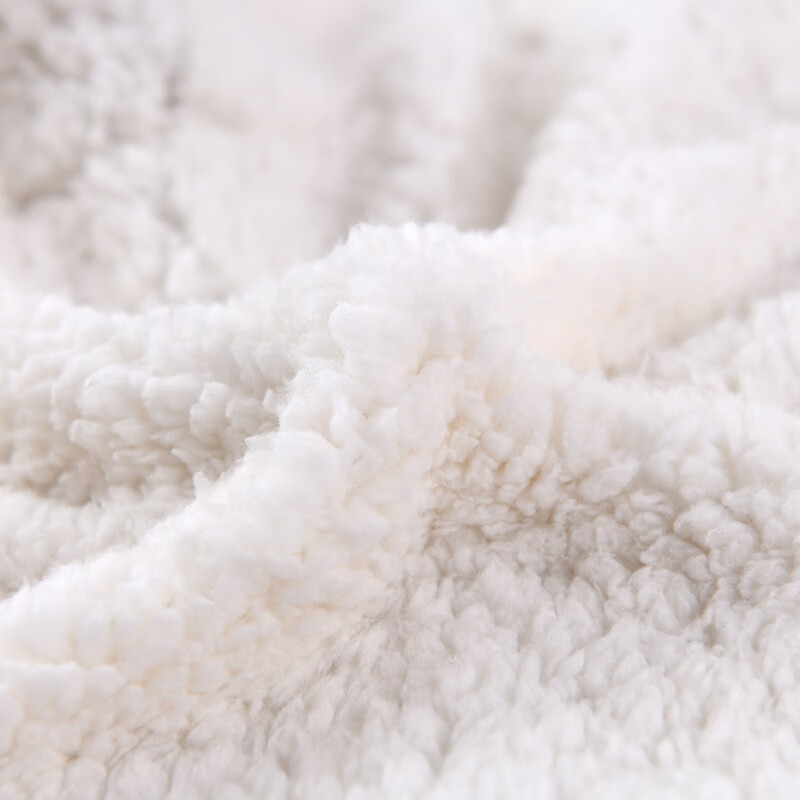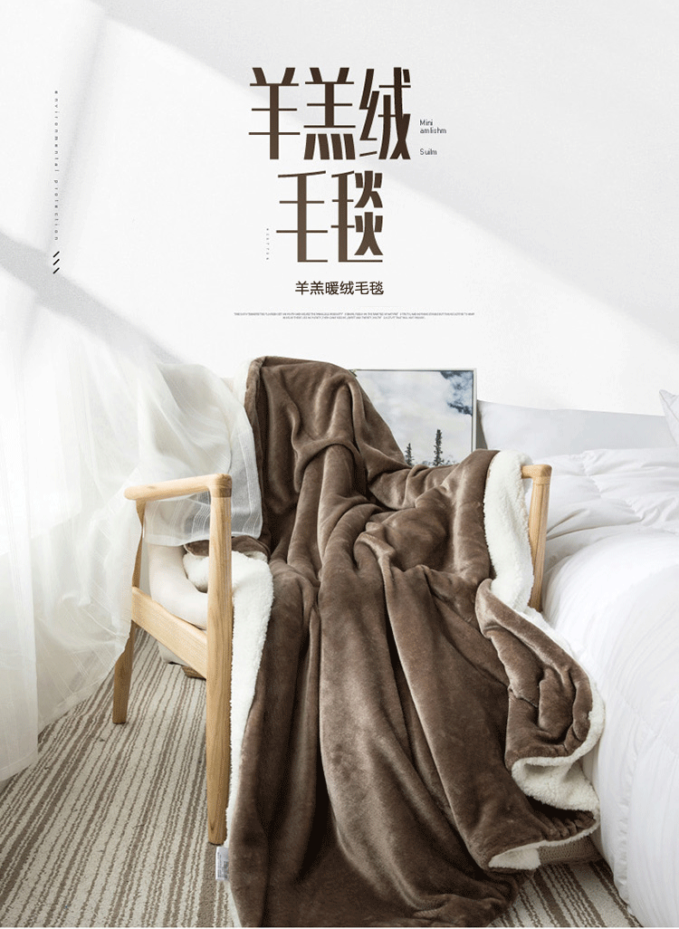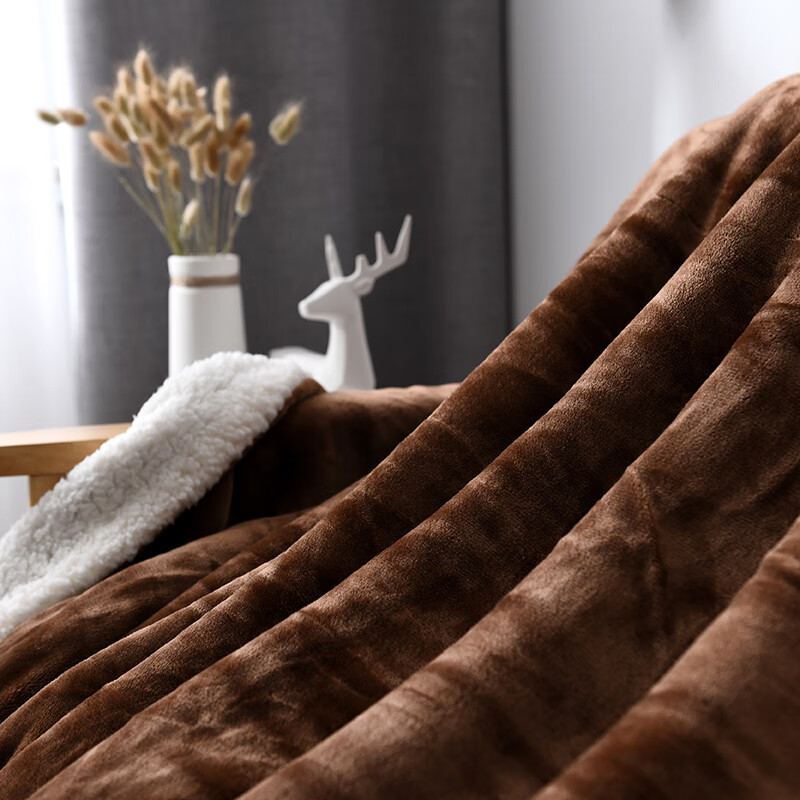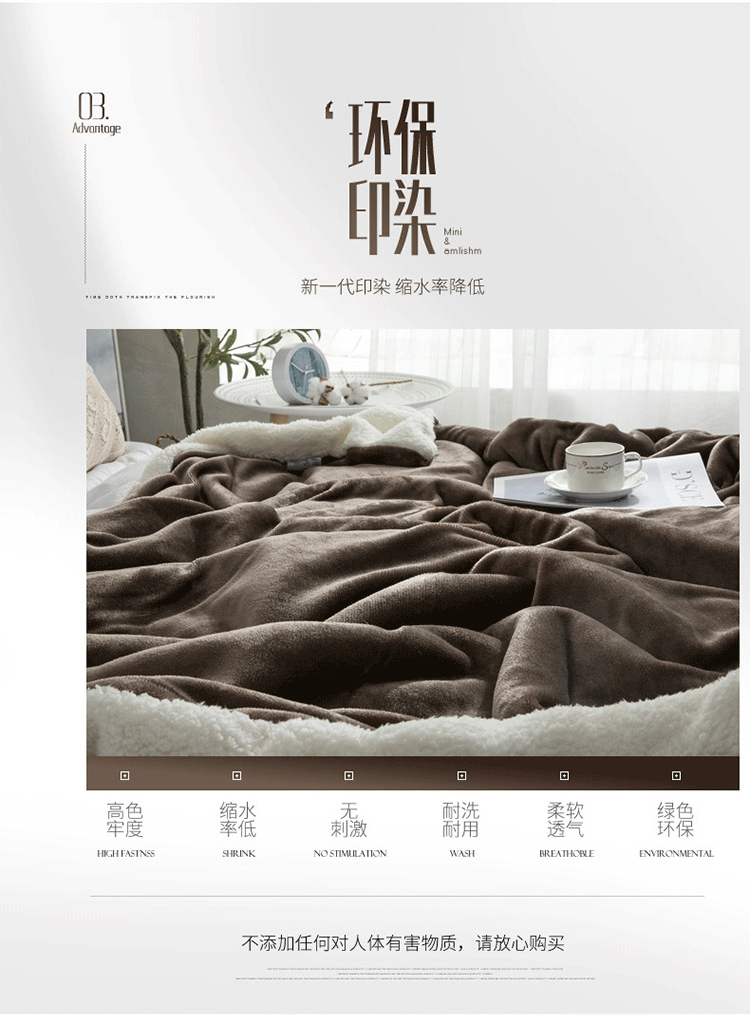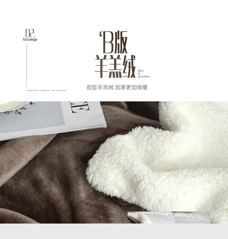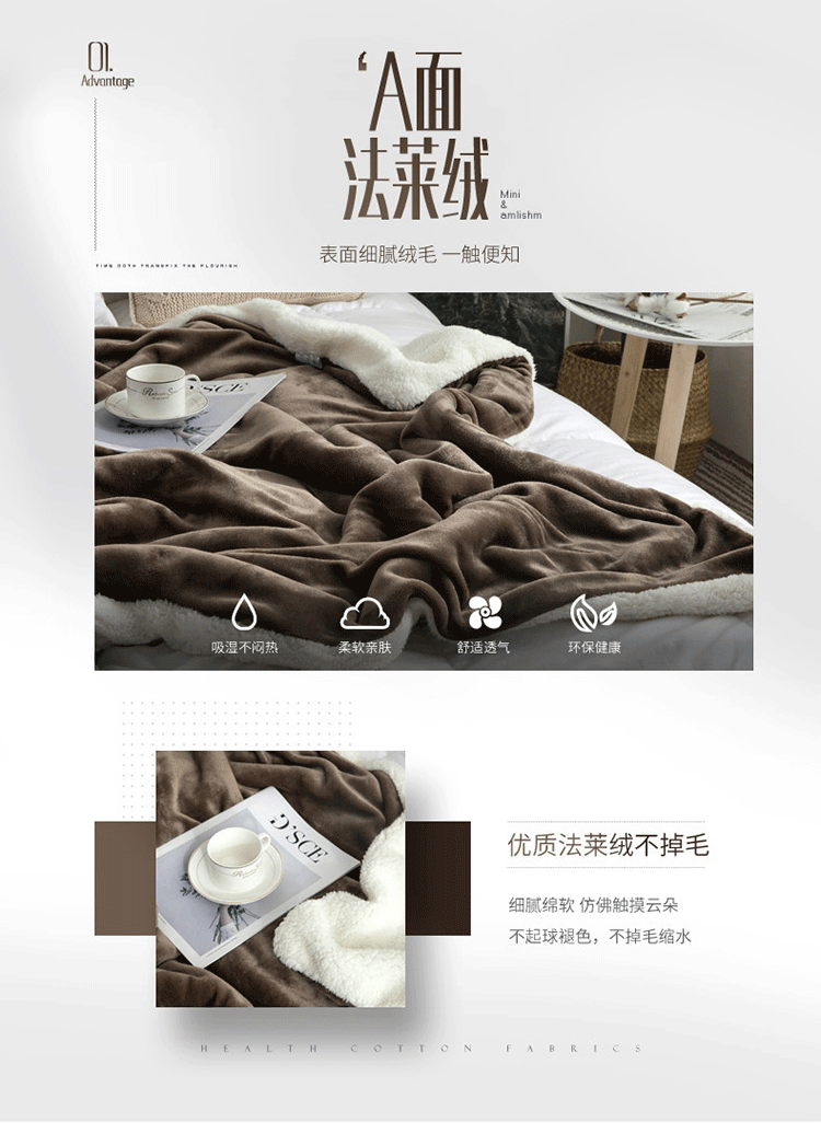 A版法莱绒,B版羊羔绒毛毯;不易褪色,不易掉毛,不易起球,无静电;悬垂感强,柔软保暖,环保健康,细致绗缝
