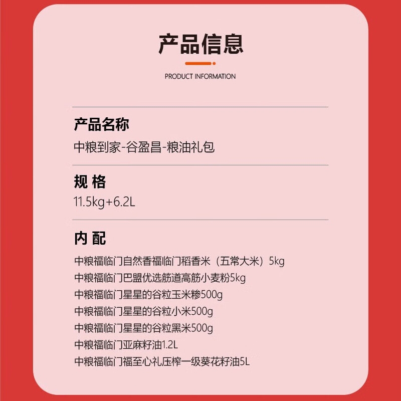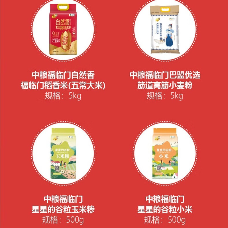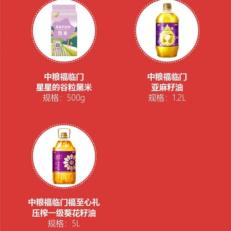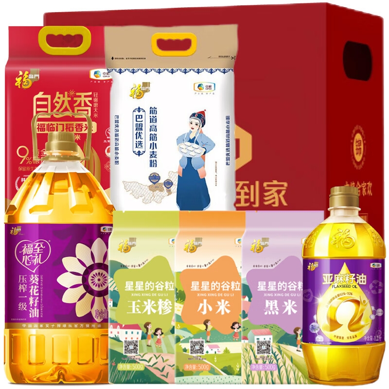 配置:中粮福临门自然香福临门稻香米(五常大米)5kg 中粮福临门巴盟优选筋道高筋小麦粉5kg 中粮福临门星星的谷粒玉米糁500g 中粮福临门星星的谷粒小米500g 中粮福临门星星的谷粒黑米500g 中粮福临门亚麻籽油1.2L 中粮福临门福至心礼压榨一级葵花籽油5L
