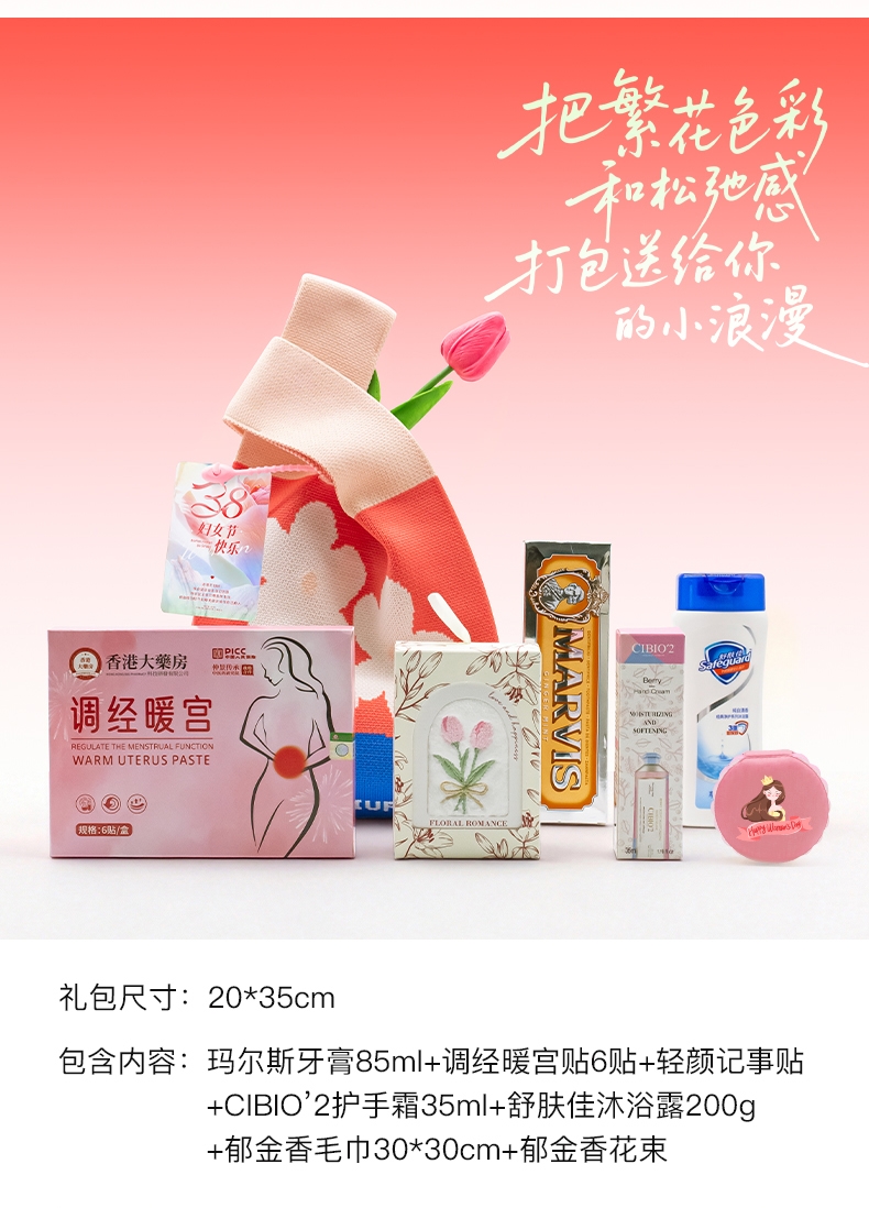 配置清单:花朵针织包20*35cm+玛尔斯牙膏85ml+调经暖宫贴6贴+轻颜记事贴+CIBIO2护手霜35ml+舒肤佳沐浴露200g+郁金香毛巾30*30cm+郁金香花束