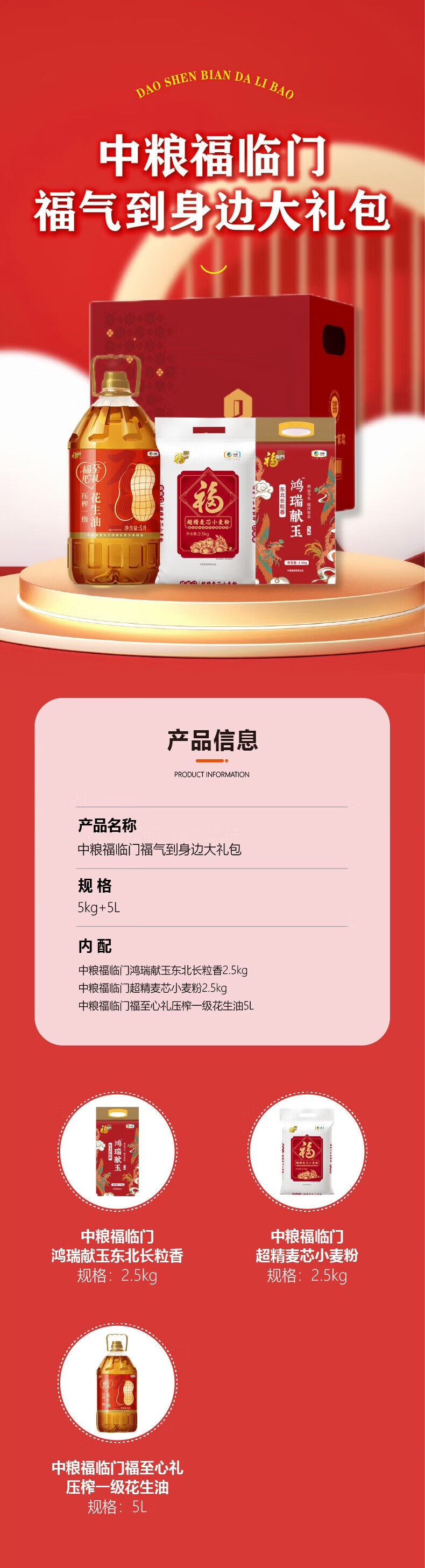 配置:中粮福临门鸿瑞献玉东北长粒香2.5kg 中粮福临门超精麦芯小麦粉2.5kg 中粮福临门福至心礼压榨一级花生油5L