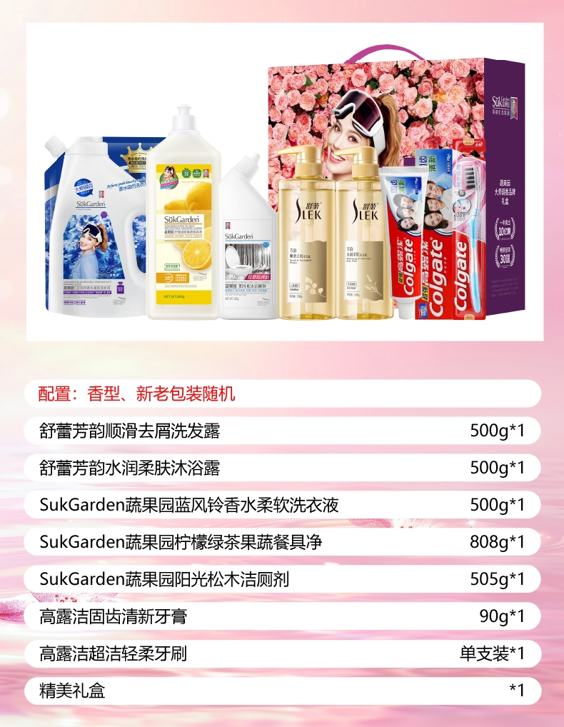 配置清单:半亩花田香氛洗发水500g*1 半亩花田香氛沐浴露500g*1 SukGarden蔬果园蓝风铃香水柔软洗衣液(持久留香)(带嘴) 500g*1 SukGarden蔬果园柠檬绿茶果蔬餐具净808g*1 SukGarden蔬果园阳光橘子油污净(强效洁净型)505g*1 参半oralshark科研白牙膏180g*1 优至弹力中毛牙刷单支装*1 精美礼盒ZS198*1