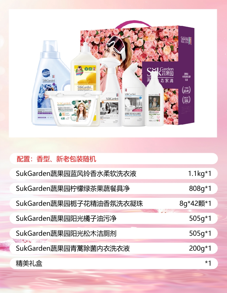 配置清单:SukGarden蔬果园蓝风铃香水柔软洗衣液(持久留香)1.1kg*1 SukGarden蔬果园柠檬绿茶果蔬餐具净808g*1 SukGarden蔬果园栀子花精油香氛洗衣凝珠8g*42颗*1 SukGarden蔬果园阳光橘子油污净(强效洁净型)505g*1 SukGarden蔬果园阳光松木洁厕剂(强效去垢型)505g*1 SukGarden蔬果园青蒿除菌内衣洗衣液-200g*1 精美礼盒ZS199*1