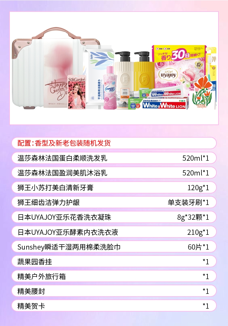 配置清单:温莎森林法国蛋白柔顺洗发乳520ml*1 温莎森林法国盈润美肌沐浴乳520ml*1 狮王(Lion)小苏打美白清新牙膏120g*1 狮王(Lion)细齿洁弹力护龈单支装牙刷*1 日本UYAJOY亚乐花香洗衣凝珠8g*32颗*1 日本UYAJOY亚乐酵素内衣洗衣液210g*1 Sunshey瞬适干湿两用棉柔洗脸巾60片*1 蔬果园香挂*1(赠品) 精美户外旅行箱*1 精美腰封*1(量大可定制) 精美贺卡*1(量大可定制)