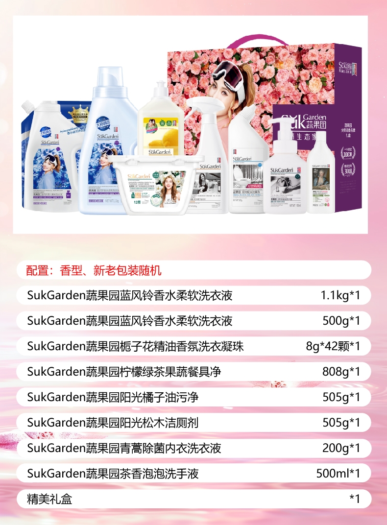配置清单:SukGarden蔬果园蓝风铃香水柔软洗衣液(持久留香)1.1kg*1 SukGarden蔬果园蓝风铃香水柔软洗衣液(持久留香)(带嘴) 500g*1 SukGarden蔬果园栀子花精油香氛洗衣凝珠8g*42颗*1 SukGarden蔬果园柠檬绿茶果蔬餐具净808g*1 SukGarden蔬果园阳光橘子油污净(强效洁净型)505g*1 SukGarden蔬果园阳光松木洁厕剂(强效去垢型)505g*1 SukGarden蔬果园青蒿除菌内衣洗衣液-200g*1 SukGarden蔬果园茶香泡泡洗手液 500ml*1 精美礼盒ZS199*1