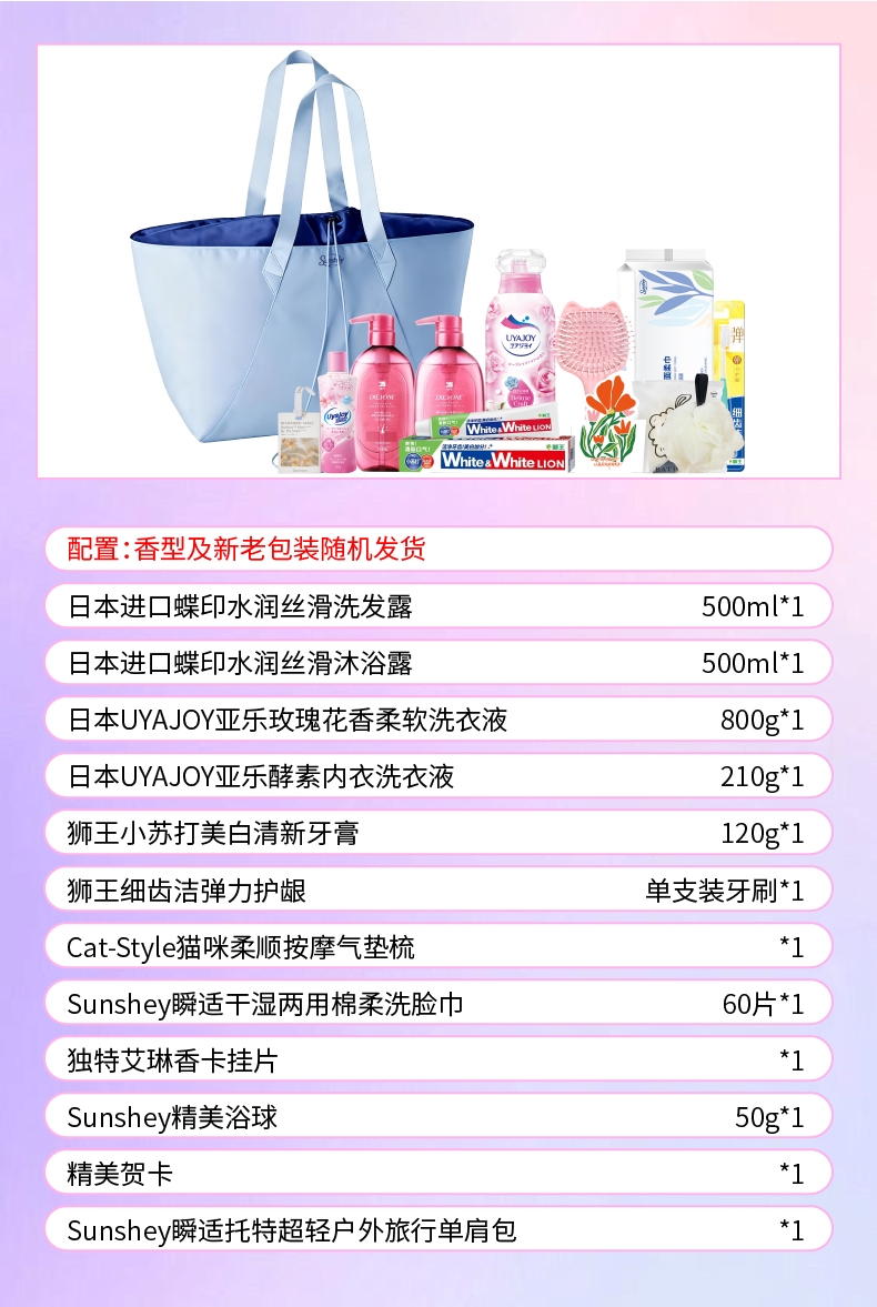 配置清单:配置明细:(香型随机) 日本进口蝶印水润丝滑洗发露500ml*1 日本进口蝶印水润丝滑沐浴露500ml*1 日本UYAJOY亚乐玫瑰花香柔软洗衣液800g*1 日本UYAJOY亚乐酵素内衣洗衣液210g*1 狮王(Lion)小苏打美白清新牙膏120g*1 狮王(Lion)细齿洁弹力护龈单支装牙刷*1 Cat-Style猫咪柔顺按摩气垫梳*1 Sunshey瞬适干湿两用棉柔洗脸巾60片*1 独特艾琳香卡挂片*1(赠品) Sunshey瞬适绵润焕肤沐浴球*1 精美贺卡*1(量大可定制) Sunshey瞬适托特超轻超大容量(35L)户外旅行单肩包(大牌同款)*1