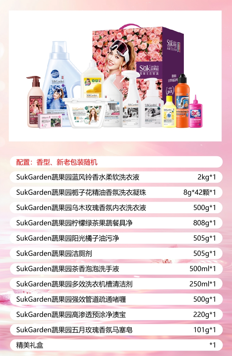 配置清单:SukGarden蔬果园蓝风铃香水柔软洗衣液(持久留香型)2kg*1 SukGarden蔬果园栀子花精油香氛洗衣凝珠8g*42颗*1 SukGarden蔬果园乌木玫瑰香氛内衣洗衣液500g*1 SukGarden蔬果园柠檬绿茶果蔬餐具净808g*1 SukGarden蔬果园阳光橘子油污净(强效洁净型)505g*1 SukGarden蔬果园洁厕剂(强效去垢型)505g*1 SukGarden蔬果园茶香泡泡洗手液 500ml*1 SukGarden蔬果园多效洗衣机槽清洁剂250ml*1 SukGarden蔬果园强效管道疏通啫喱500g*1 SukGarden蔬果园高渗透预涂净渍宝(强力去油去渍)-220g*1 SukGarden蔬果园五月玫瑰香氛马塞皂101g*1 精美礼盒ZS200*1