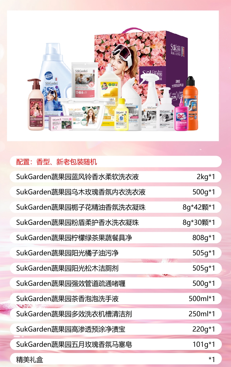 配置清单:SukGarden蔬果园蓝风铃香水柔软洗衣液(持久留香型)2kg*1 SukGarden蔬果园乌木玫瑰香氛内衣洗衣液500g*1 SukGarden蔬果园栀子花精油香氛洗衣凝珠8g*42颗*1 SukGarden蔬果园粉盾柔护香水洗衣凝珠-8g*30颗(袋装)*1 SukGarden蔬果园柠檬绿茶果蔬餐具净808g*1 SukGarden蔬果园阳光橘子油污净(强效洁净型)505g*1 SukGarden蔬果园阳光松木洁厕剂(强效去垢型)505g*1 SukGarden蔬果园强效管道疏通啫喱500g*1 SukGarden蔬果园茶香泡泡洗手液500ml*1 SukGarden蔬果园多效洗衣机槽清洁剂250ml*1 SukGarden蔬果园高渗透预涂净渍宝(强力去油去渍)-220g*1 SukGarden蔬果园五月玫瑰香氛马塞皂101g*1 精美礼盒ZS200*