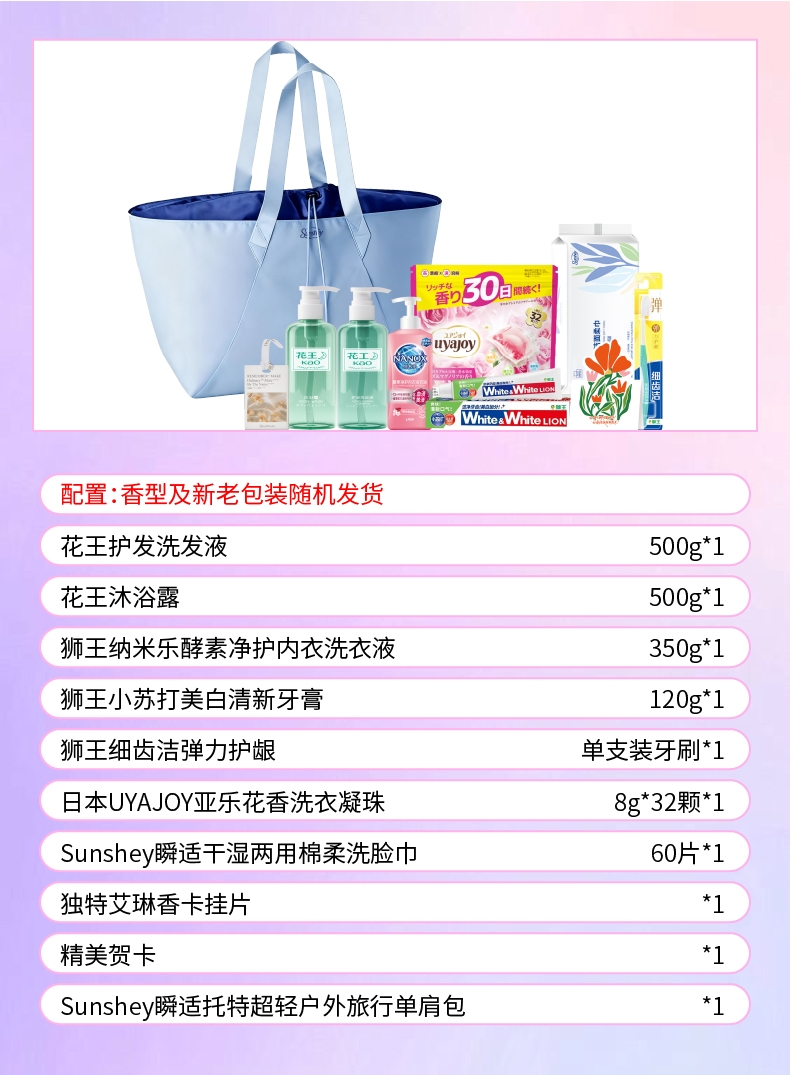 配置清单:花王(KAO)护发洗发液500g*1 花王(KAO)沐浴露500g*1 狮王(Lion)纳米乐酵素净护内衣洗衣液350g*1 狮王(Lion)小苏打美白清新牙膏120g*1 狮王(Lion)细齿洁弹力护龈单支装牙刷*1 日本UYAJOY亚乐花香洗衣凝珠8g*32颗*1 Sunshey瞬适干湿两用棉柔洗脸巾60片*1 独特艾琳香卡挂片*1(赠品) 精美贺卡*1(量大可定制) Sunshey瞬适托特超轻超大容量(35L)户外旅行单肩包(大牌同款)*1