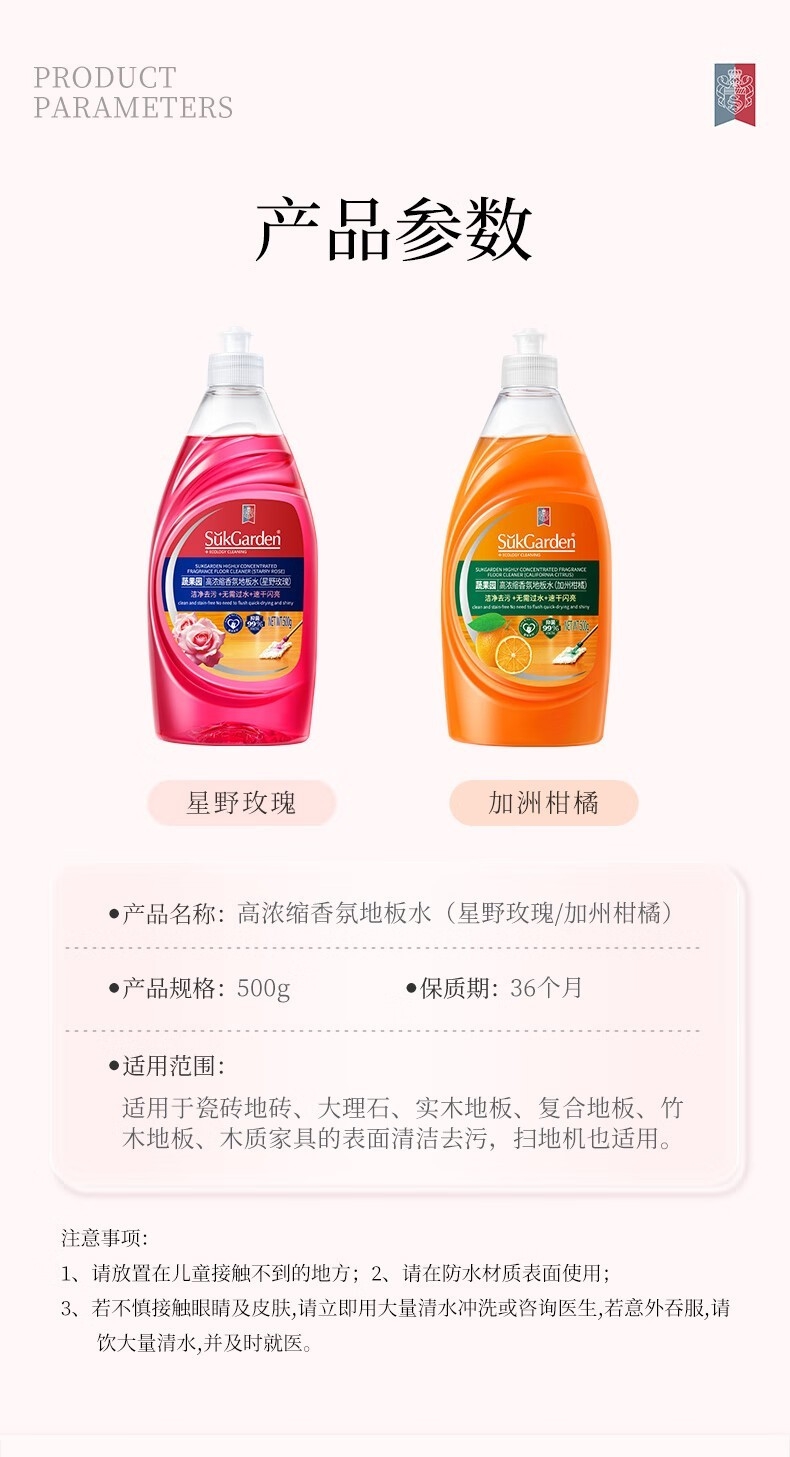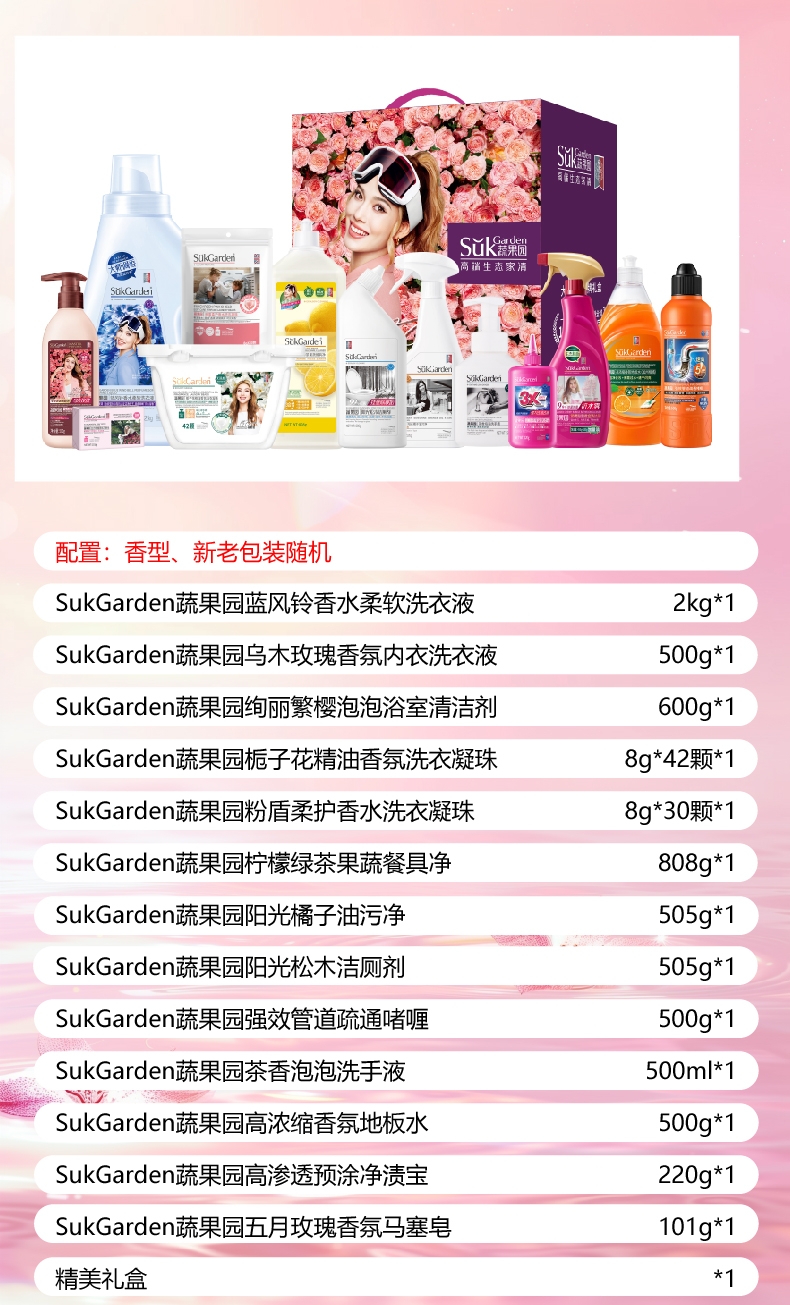 配置清单:SukGarden蔬果园蓝风铃香水柔软洗衣液(持久留香型)2kg*1 SukGarden蔬果园乌木玫瑰香氛内衣洗衣液500g*1 SukGarden蔬果园绚丽繁樱泡泡浴室清洁剂600g*1 SukGarden蔬果园栀子花精油香氛洗衣凝珠8g*42颗*1 SukGarden蔬果园粉盾柔护香水洗衣凝珠-8g*30颗(袋装)*1 SukGarden蔬果园柠檬绿茶果蔬餐具净808g*1 SukGarden蔬果园阳光橘子油污净(强效洁净型)505g*1 SukGarden蔬果园阳光松木洁厕剂(强效去垢型)505g*1 SukGarden蔬果园强效管道疏通啫喱500g*1 SukGarden蔬果园茶香泡泡洗手液 500ml*1 SukGarden蔬果园高浓缩香氛地板水(加州柑橘)500g*1 SukGarden蔬果园高渗透预涂净渍宝(强力去油去渍)-220g*1 SukGarden蔬果园五月玫瑰香氛马塞皂101g*1 精美礼盒ZS200*1