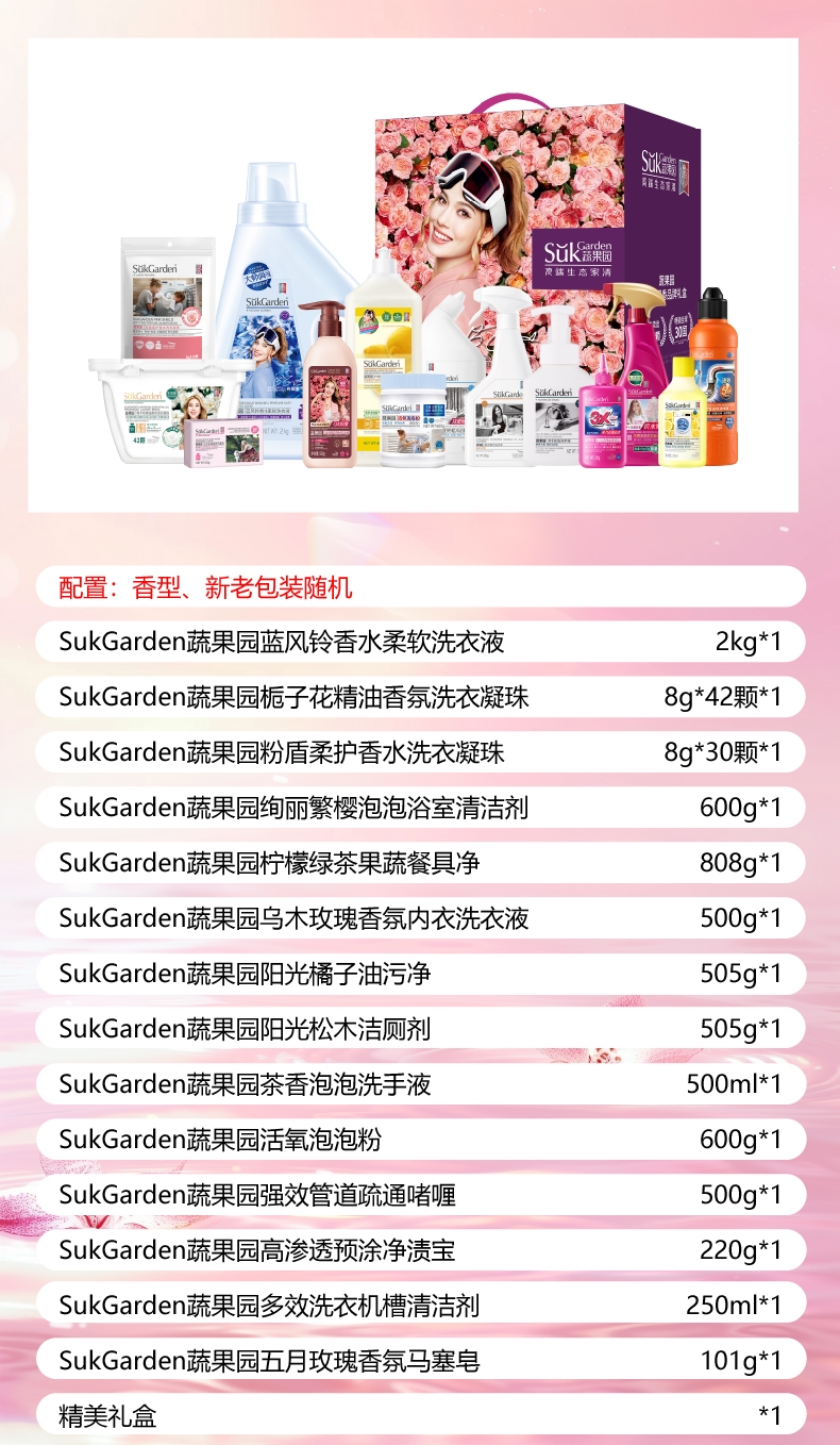 配置清单:SukGarden蔬果园蓝风铃香水柔软洗衣液(持久留香型)2kg*1 SukGarden蔬果园栀子花精油香氛洗衣凝珠8g*42颗*1 SukGarden蔬果园粉盾柔护香水洗衣凝珠-8g*30颗(袋装)*1 SukGarden蔬果园绚丽繁樱泡泡浴室清洁剂600g*1 SukGarden蔬果园柠檬绿茶果蔬餐具净808g*1 SukGarden蔬果园乌木玫瑰香氛内衣洗衣液500g*1 SukGarden蔬果园阳光橘子油污净(强效洁净型)505g*1 SukGarden蔬果园阳光松木洁厕剂(强效去垢型)505g*1 SukGarden蔬果园茶香泡泡洗手液 500ml*1 SukGarden蔬果园活氧泡泡粉(强效型)600g*1 SukGarden蔬果园强效管道疏通啫喱500g*1 SukGarden蔬果园高渗透预涂净渍宝(强力去油去渍)-220g*1 SukGarden蔬果园多效洗衣机槽清洁剂250ml*1 SukGarden蔬果园五月玫瑰香氛马塞皂101g*1 精美礼盒ZS200*1