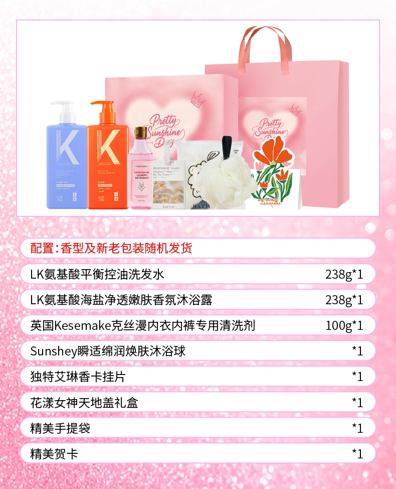 配置清单:LK氨基酸平衡控油洗发水238g*1 LK氨基酸海盐净透嫩肤香氛沐浴露238g*1 英国Kesemake克丝漫内衣内裤专用清洗剂100g*1 Sunshey瞬适绵润焕肤沐浴球*1 独特艾琳香卡挂片*1(赠品) 花漾女神天地盖礼盒*1 精美手提袋*1 精美贺卡*