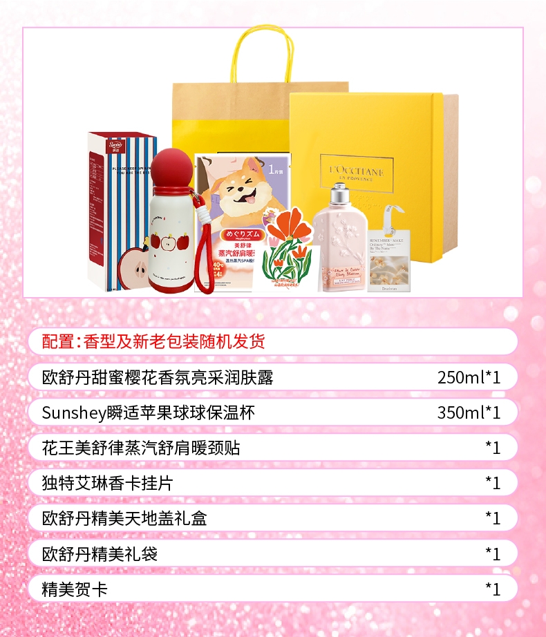 配置清单:欧舒丹甜蜜樱花香氛亮采润肤露250ml*1 Sunshey瞬适苹果球球保温杯350ml*1 花王(KAO)美舒律蒸汽舒肩暖颈贴(1片装)*1 独特艾琳香卡挂片*1(赠品) 欧舒丹精美天地盖礼盒*1 欧舒丹精美礼袋*1 精美贺卡*1(量大可定制)