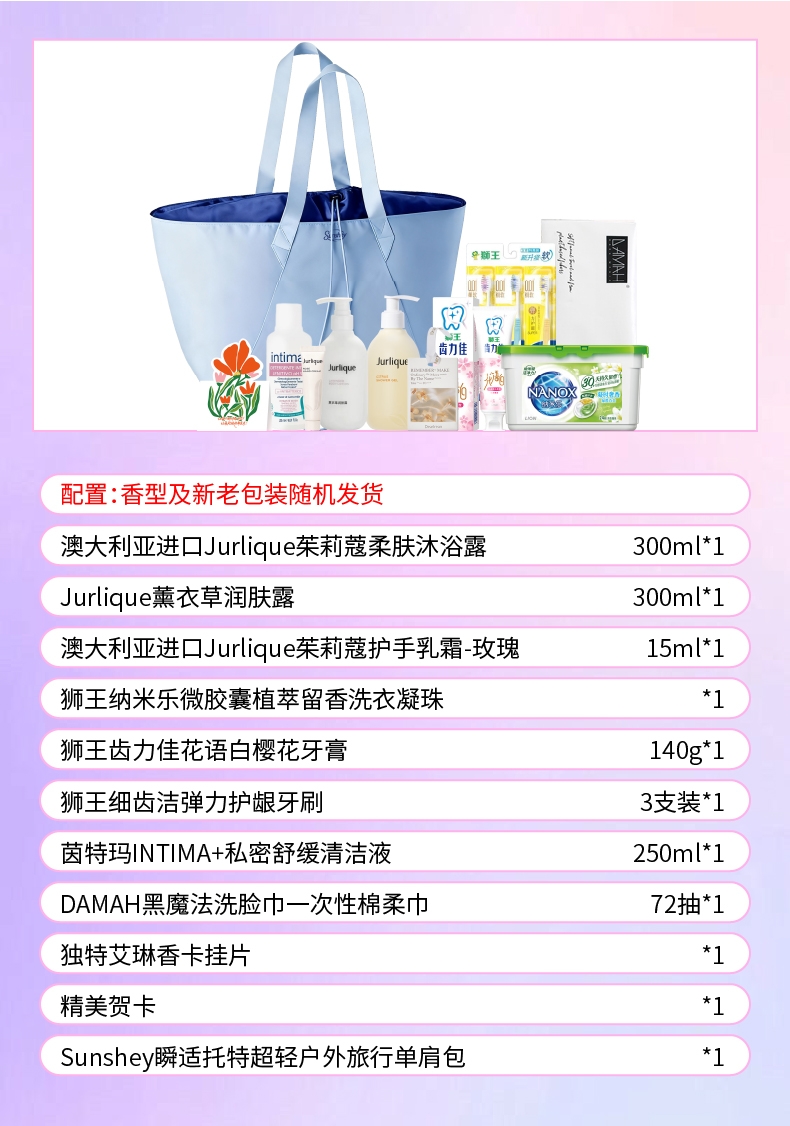 配置清单:澳大利亚进口Jurlique茱莉蔻柔肤沐浴露(柑橘)300ml*1 Jurlique薰衣草润肤露300ml*1 澳大利亚进口Jurlique茱莉蔻护手乳霜-玫瑰15ml*1 狮王(Lion)纳米乐微胶囊植萃留香洗衣凝珠(24颗)*1 狮王(Lion)齿力佳花语白樱花牙膏140g*1 狮王(Lion)细齿洁弹力护龈牙刷3支装*1 茵特玛INTIMA+私密舒缓清洁液250ml*1 DAMAH黑魔法洗脸巾一次性棉柔巾72抽*1 独特艾琳香卡挂片*1(赠品) 精美贺卡*1(量大可定制) Sunshey瞬适托特超轻超大容量(35L)户外旅行单肩包(大牌同款)*1