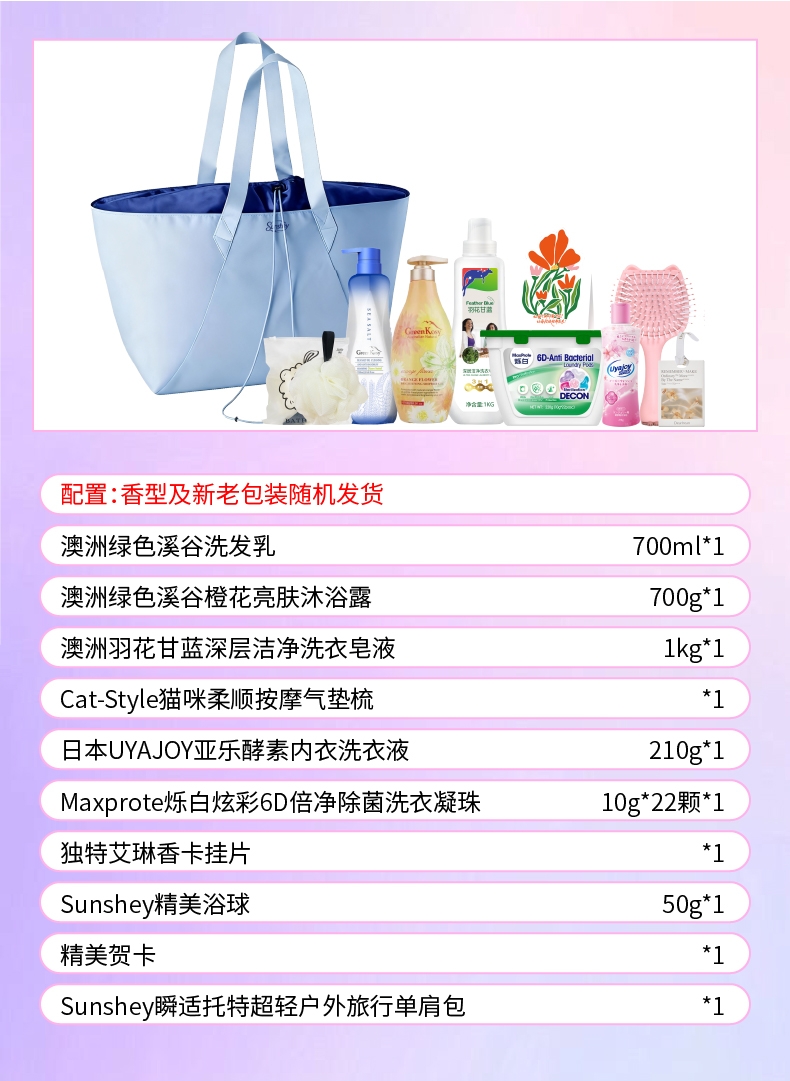配置清单:澳洲绿色溪谷洗发乳700ml*1 澳洲绿色溪谷橙花亮肤沐浴露700g*1 澳洲羽花甘蓝深层洁净洗衣皂液 1kg*1 Cat-Style猫咪柔顺按摩气垫梳*1 日本UYAJOY亚乐酵素内衣洗衣液210g*1 Maxprote烁白炫彩6D倍净除菌洗衣凝珠10g*22颗*1 独特艾琳香卡挂片*1(赠品) Sunshey瞬适绵润焕肤沐浴球*1 精美贺卡*1(量大可定制) Sunshey瞬适托特超轻户外旅行单肩包(大牌同款)*1