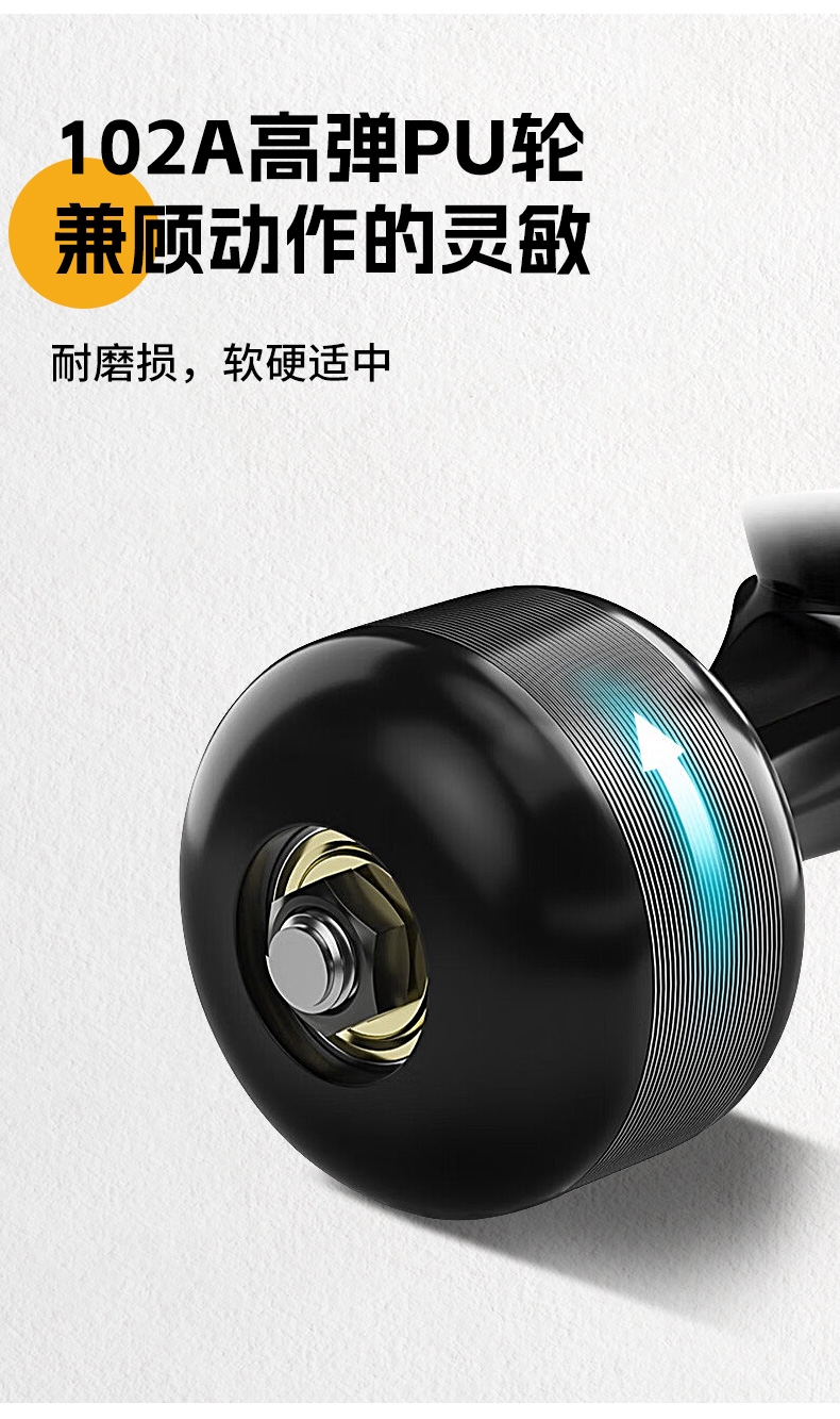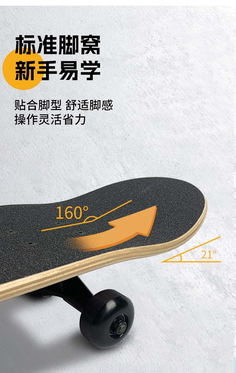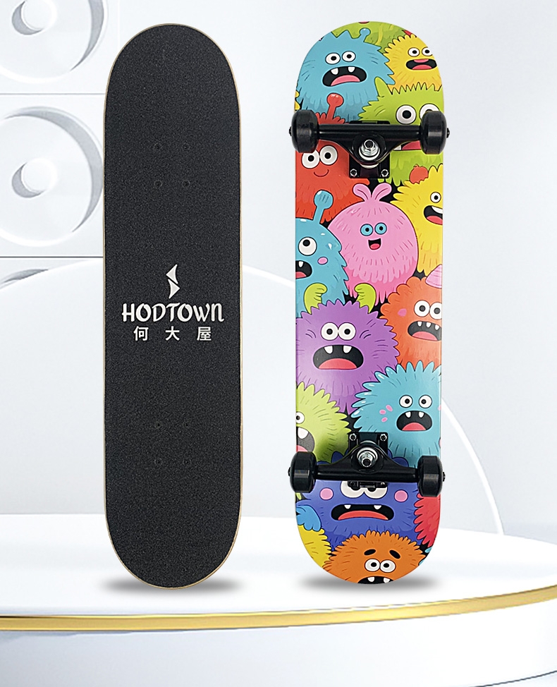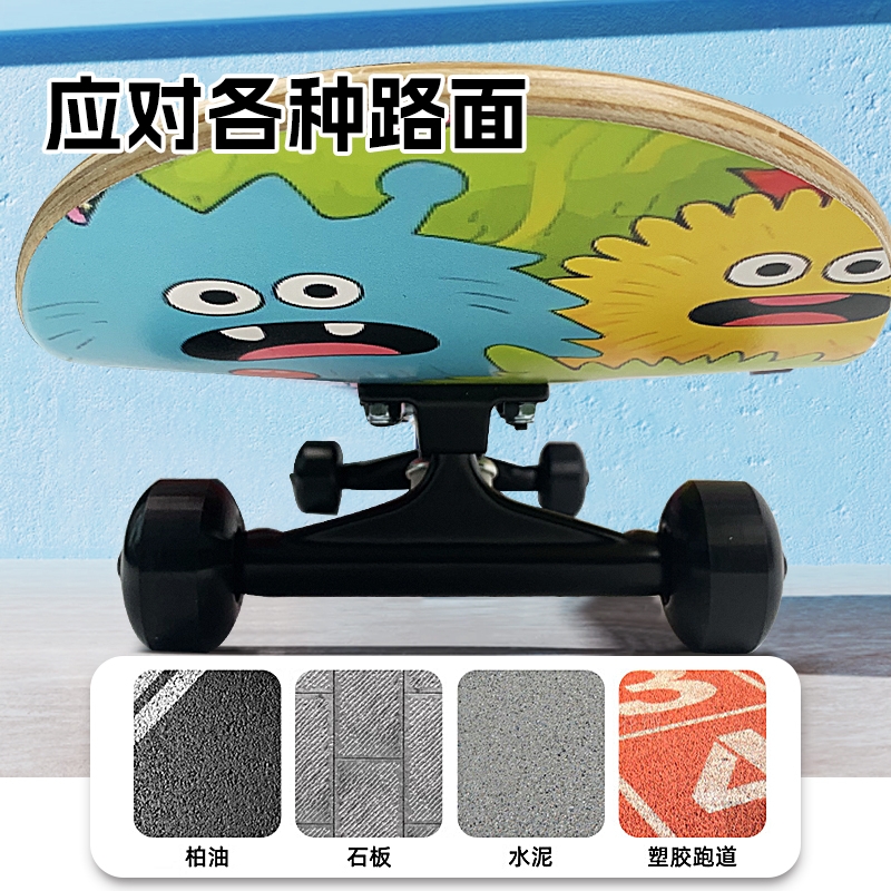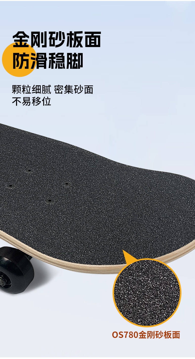 细腻金刚砂,防滑纹理,稳定防滑高效锁脚;玩家标准U型板面脚窝 高速顺滑轴承,转动灵活;原创图案,趣味设计,不撞色