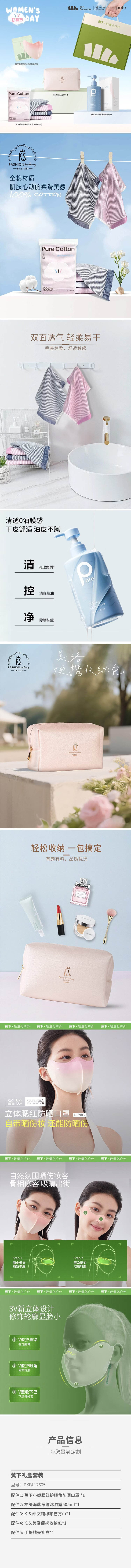 配置清单:1. 蕉下小颜腮红护眼角防晒口罩 *1 2. 柏缇海盐净透沐浴露505ml*1 3. K.S.细文纯棉布艺方巾*1 4. K.S.美洛便携收纳包*1 5. 小号手提彩盒*1
