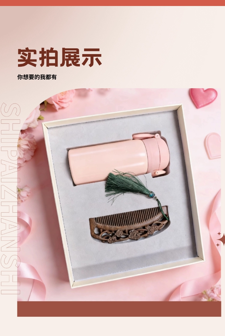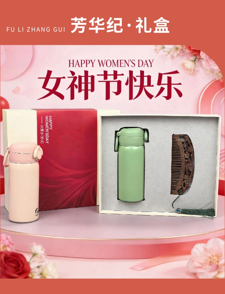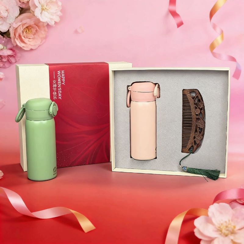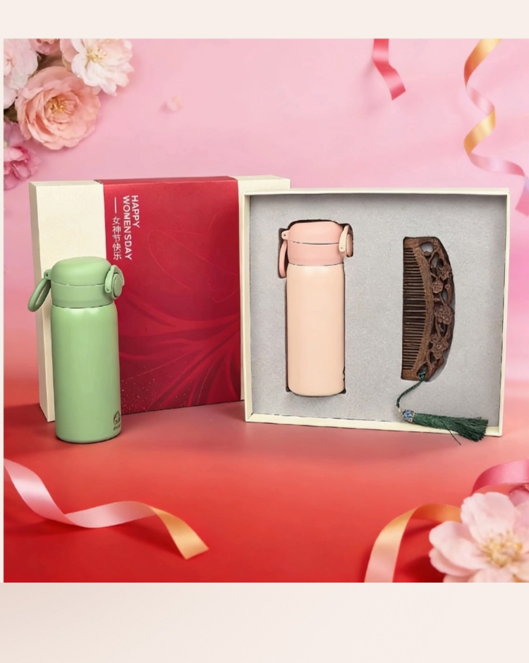 三八专属礼盒,保温杯暖身,檀木梳养发,贴心之选!;女神节礼盒来袭,手提保温杯+檀木梳,实用又精致!;三八佳礼!保温杯便携,檀木梳养发,尽显关爱心意!